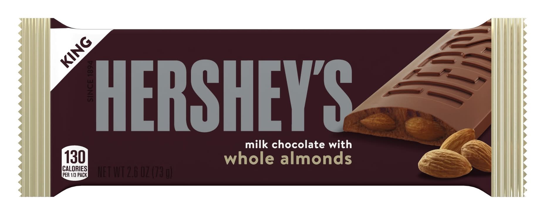 bite into this king size hershey's® & savor the milk chocolatey goodness with an almond crunch. so delish & so satisfying!big enough to share with a friend…or just eat the whole thing yourself!size: 2.6ozCountry of Origin: usaAll candy is non-returnable
