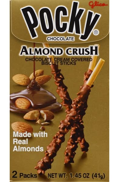 coated in chocolate cream & crunchy almond bits, these pocky® biscuit sticks are a sweet, crunchy snack to satisfy your cravings! so fun to eat & easy to share with friends, too.includes 2 packs.size: 1.45ozplz note: contains almonds.Country of Origin: importedAll candy is non-returnable