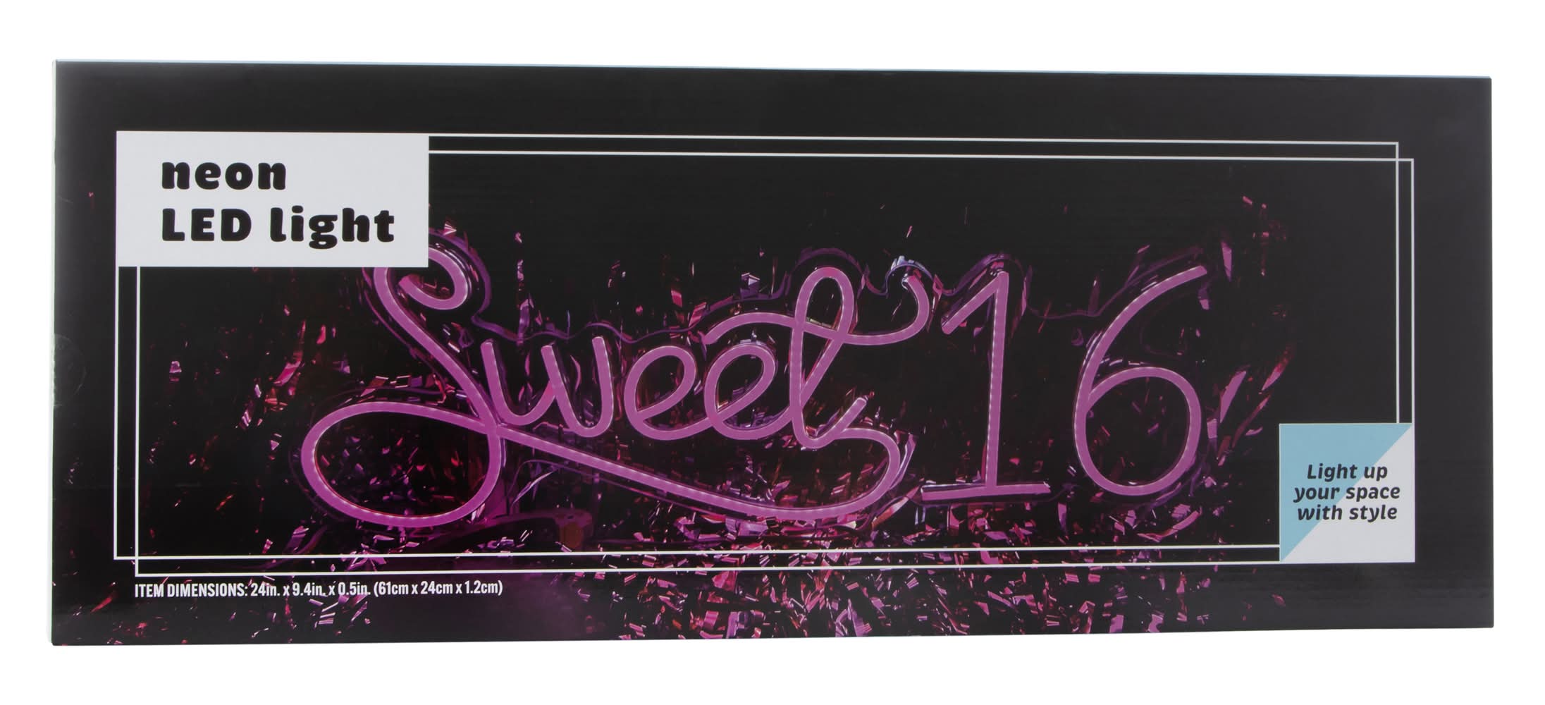 Amp up their birthday with this neon LED Sweet 16 light.Size: 24in x 9.4in x 0.5inUSB plug-inHanging hardware not included; for indoor use only.Country of Origin: Imported
