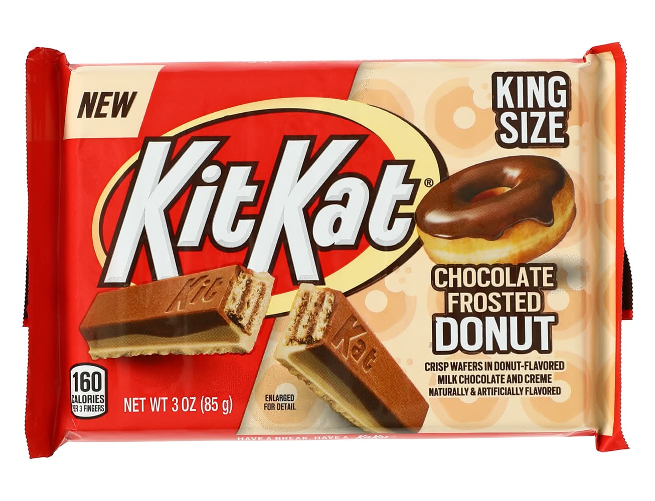 'Donut' forget to try this Kit Kat King Size Chocolate Frosted Donut Candy Bar. A tastier way to satisfy your cravings!Crisp wafers in donut-flavored milk chocolate & creme.Flavor: Chocolate Frosted DonutSize: 3ozCountry of Origin: USAAll candy is non-returnable