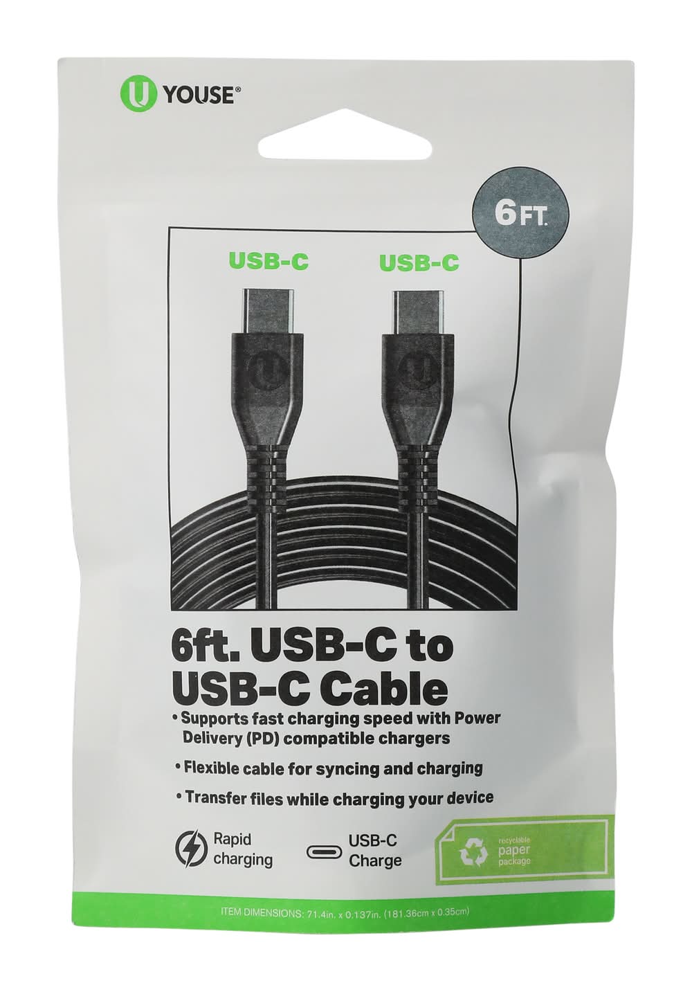 bring your device back to life with a USB-C charging cable. rapid charge & transfer files in style!supports fast charging speed with power delivery (PD) compatible chargerstype: USB-C to USB-Csize: 6ft (L)Country of Origin: imported • Color: Black • Packaging: Reusable