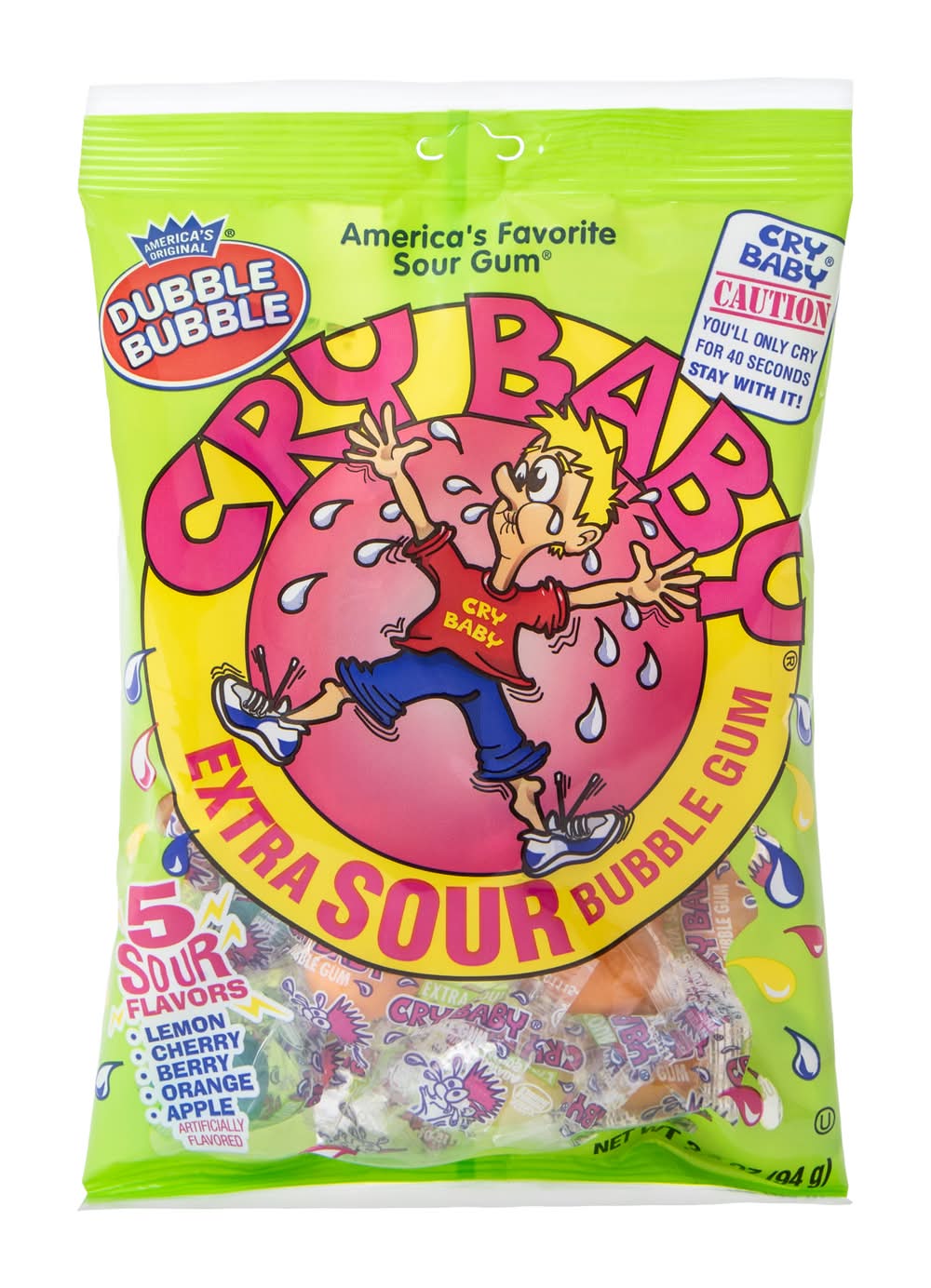 Pucker up for these super sour Cry Baby bubble gums.Size: 4ozCountry of Origin: USAAll candy is non-returnable Color: Cry baby