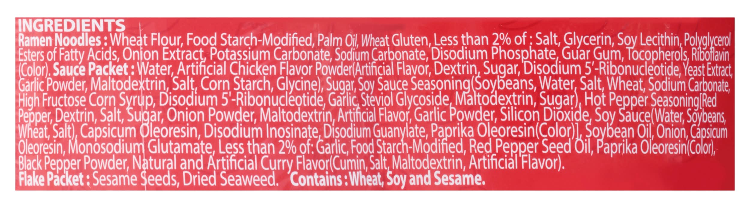 Ingredients: Ramen Noodles: Wheat, Flour, Food Starch-Modified, Palm Oil, Wheat Gluten, Less than 2% of: Salt, Glycerin, Soy Lecithin, Polyglycerol Esters of Fatty Acids, Onion Extract, Potassium Carbonate, Sodium Carbonate, Disodium Phosphate, Guar Gum, Tocopherols, Riboflavin (Color), Sauce Packet: Water, Artificial Chicken Flavor Powder (Artificial Flavor, Dextrin, Sugar, Disodium 5’-Ribonucleotide, Yeast Extract, Garlic Powder, Maltodextrin, Salt, Corn Starch, Glycine), Sugar, Soy Sauce Seasoning (Soybeans, Water, Salt, Wheat, Sodium Carbonate, High Fructose Corn Syrup, Disodium 5’-Ribonucleotide, Garlic Steviol Glycoside, Maltodextrin, Sugar), Hot Pepper Seasoning [Red Pepper, Dextrin Salt, Sugar, Onion Powder, Maltodextrin, Artificial Flavor, Garlic Powder, Silicon Dioxide, Soy Sauce (Water, Soybeans, Wheat, Salt), Capsicum Oleoresin, Disodium Inosinate, Disodium Guanylate, Paprika Oleoresin (Color)], Soybean Oil, Onion, Capsicum Oleoresin, Monosodium Glutamate, Less than 2% of: Garlic, Food Starch-Modified, Red Pepper Seed Oil, Paprika Oleoresin (Color), Black Pepper Powder, Natural and Artificial, Curry Flavor (Cumin, Salt, Maltodextrin, Artificial Flavor), Flake Packet: Sesame Seeds, Dried Seaweed Contains: Wheat, Gluten, Soybeans, Corn, Sesame, Eggs, Milk, Fish, Crustacean Shellfish, Tree Nuts, Peanuts
