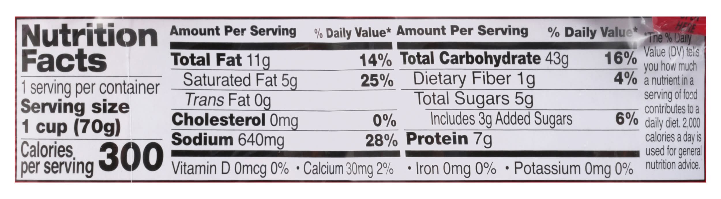 Directions: cooking directions: 1. open lid halfway and remove the two packets. 2. pour boiling water up the inner line. 3. close lid and let stand for 4 minutes. 4. after 4 minutes, drain all the water. 5. add the sauce and flakes. mix well before serving. caution: product will be hot. do not microwave. caution! hot water.