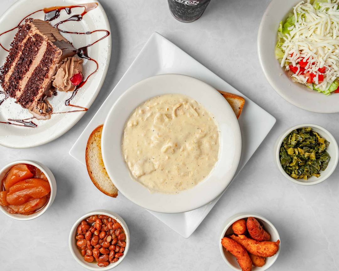 Served with choice of gravy, stone-ground grits, or home potatoes and choice of biscuit or toast.