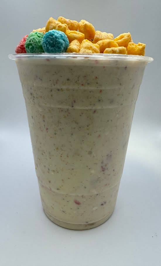 Vanilla ice cream blended with real berries and Captain Crunch cereal, topped with whipped cream.