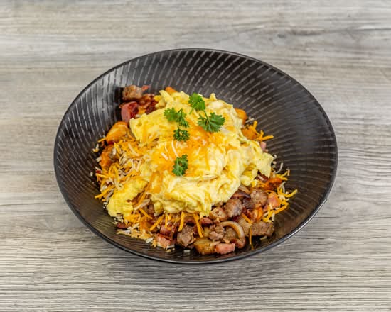 Southwest potatoes, sausage, bacon, ham & cheddar cheese, & eggs.
