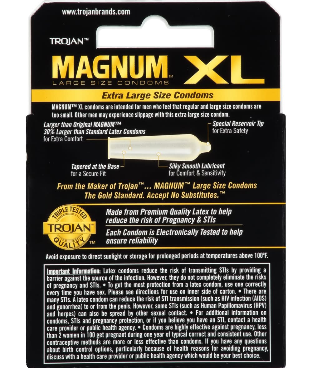 MAGNUM. The Gold Standard. Accept No Substitutes. MAGNUM XL Condoms are designed for those who live large and are seeking a more comfortable fit. Other men may experience slippage with this extra large size condom. Size: XL