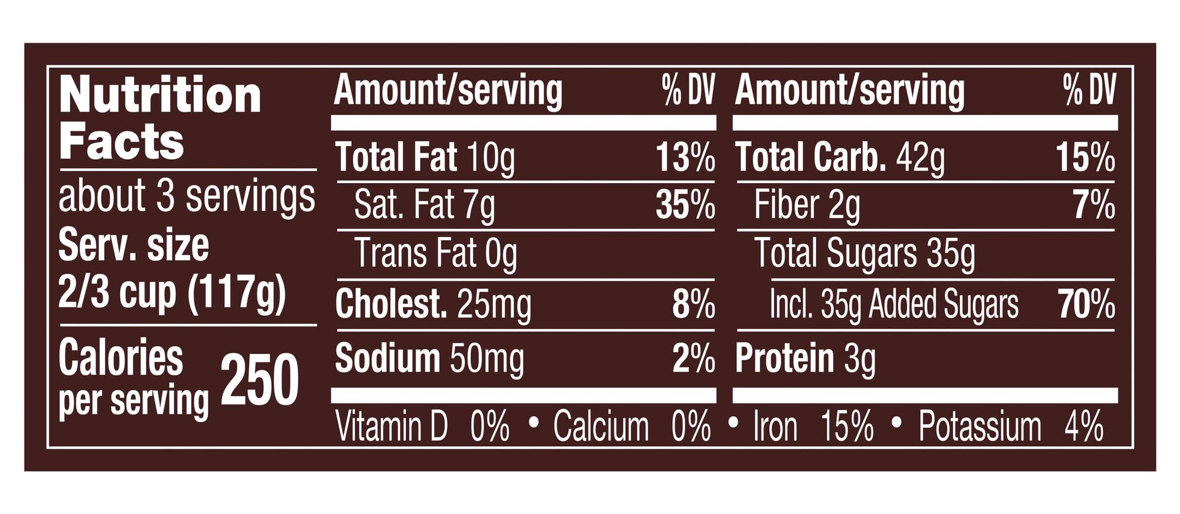 Ingredients: Water, Sugar, Cocoa (processed with alkali), Coconut Oil, Dextrose, Wheat Flour, Egg Yolks, Less than 2% of: Egg Whites, Chocolate, Canola Oil, Cashews, Corn Syrup, Palm Kernel Oil, Palm Oil, Natural Flavor, Carob Bean Gum, Corn Starch, Salt. Contains: Cashews, Eggs, Soy, Wheat., Corn, Tree Nuts