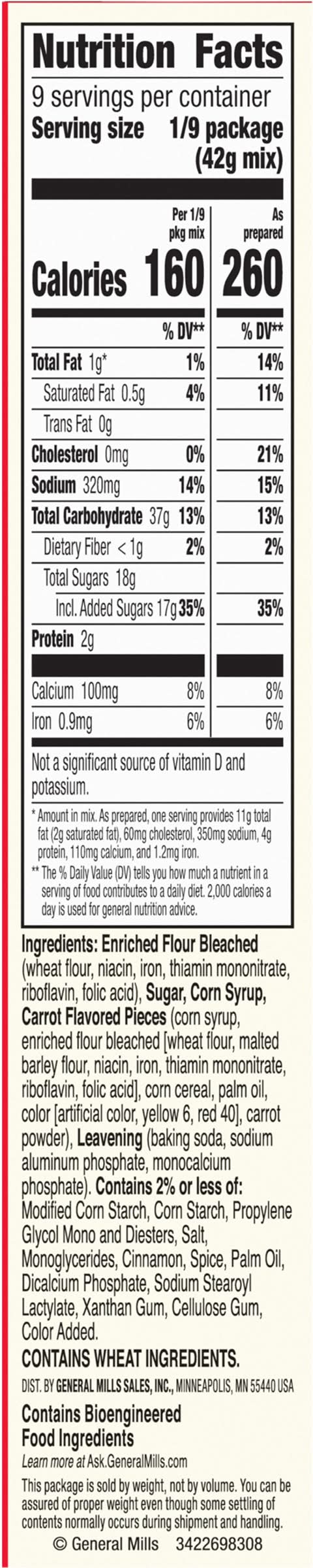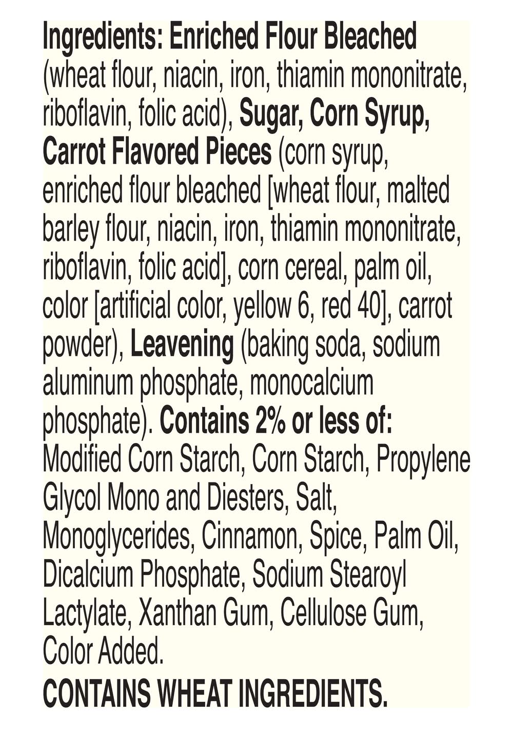 Ingredients: Enriched Flour Bleached (Wheat Flour, Niacin, Iron, Thiamin Mononitrate, Riboflavin, Folic Acid), Sugar, Corn Syrup, Carrot Flavored Pieces (Corn Syrup, Enriched Flour Bleached [Wheat Flour, Malted Barley Flour, Niacin, Iron, Thiamin Mononitrate, Riboflavin, Folic Acid], Corn Cereal, Palm Oil, Color [Artificial Color, Yellow 6, Red 40], Carrot Powder), Leavening (Baking Soda, Sodium Aluminum Phosphate, Monocalcium Phosphate), Contains 2% or Less of: Modified Corn Starch, Corn Starch, Propylene Glycol Mono and Diesters, Salt, Monoglycerides, Cinnamon, Spice, Palm Oil, Dicalcium Phosphate, Sodium Stearoyl Lactylate, Xanthan Gum, Cellulose Gum, Color Added Contains: Wheat, Barley