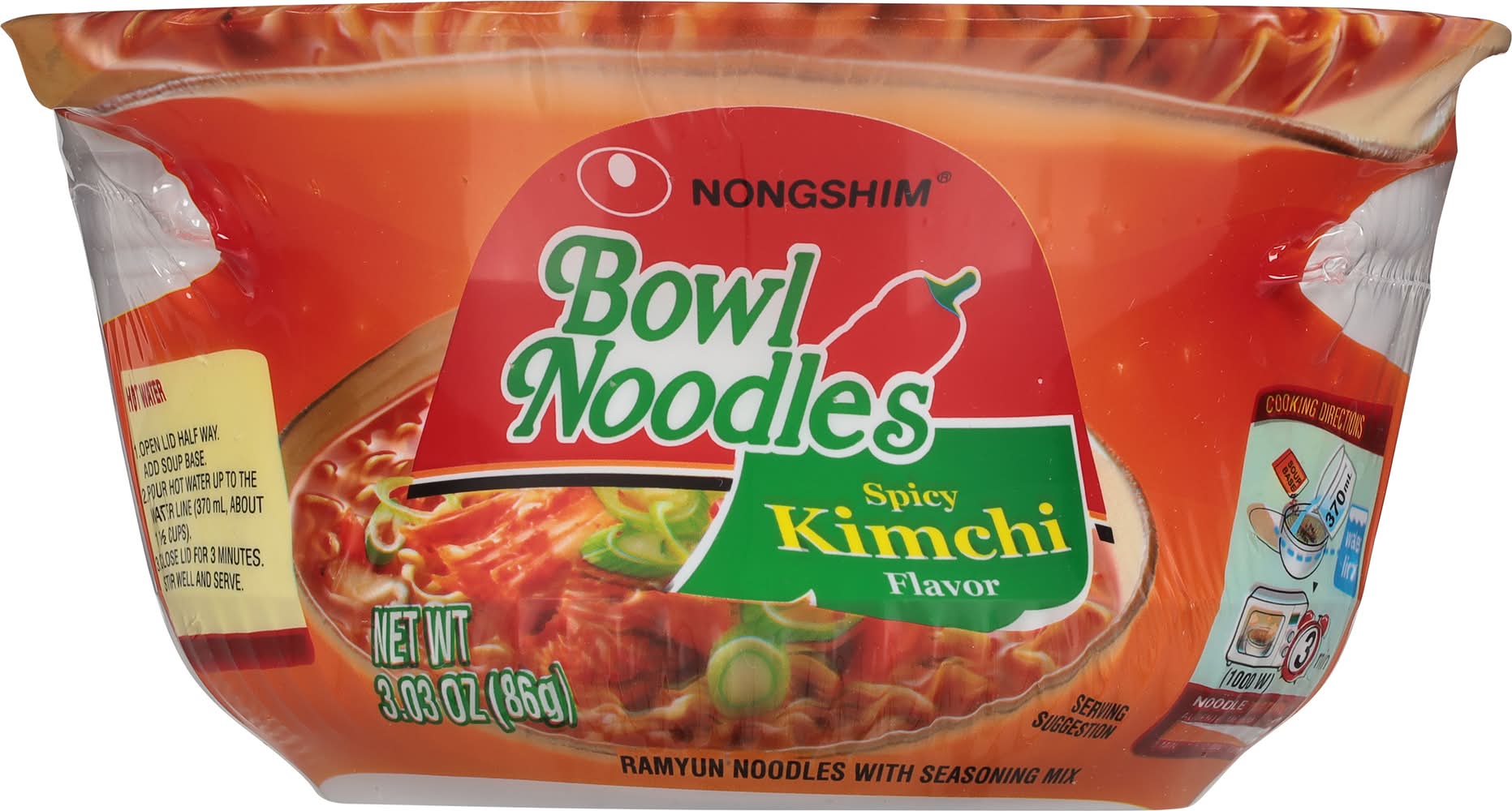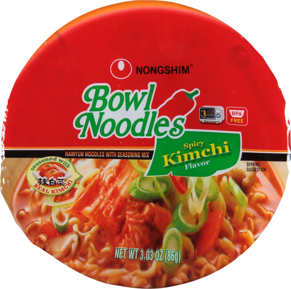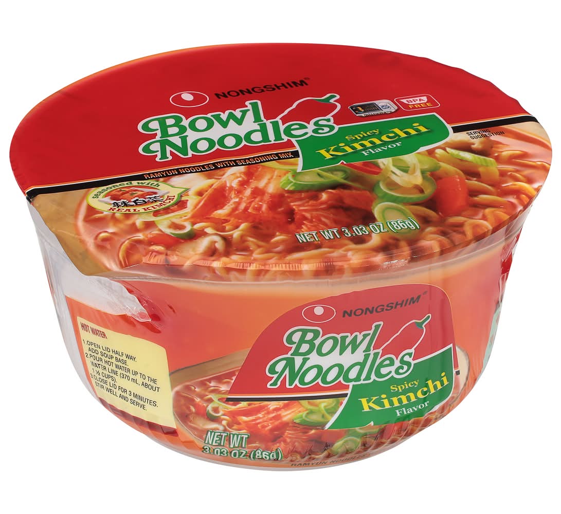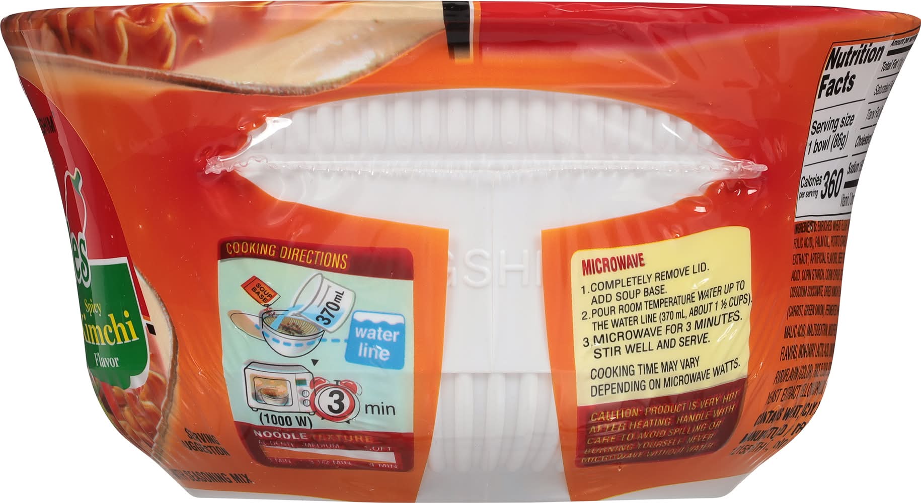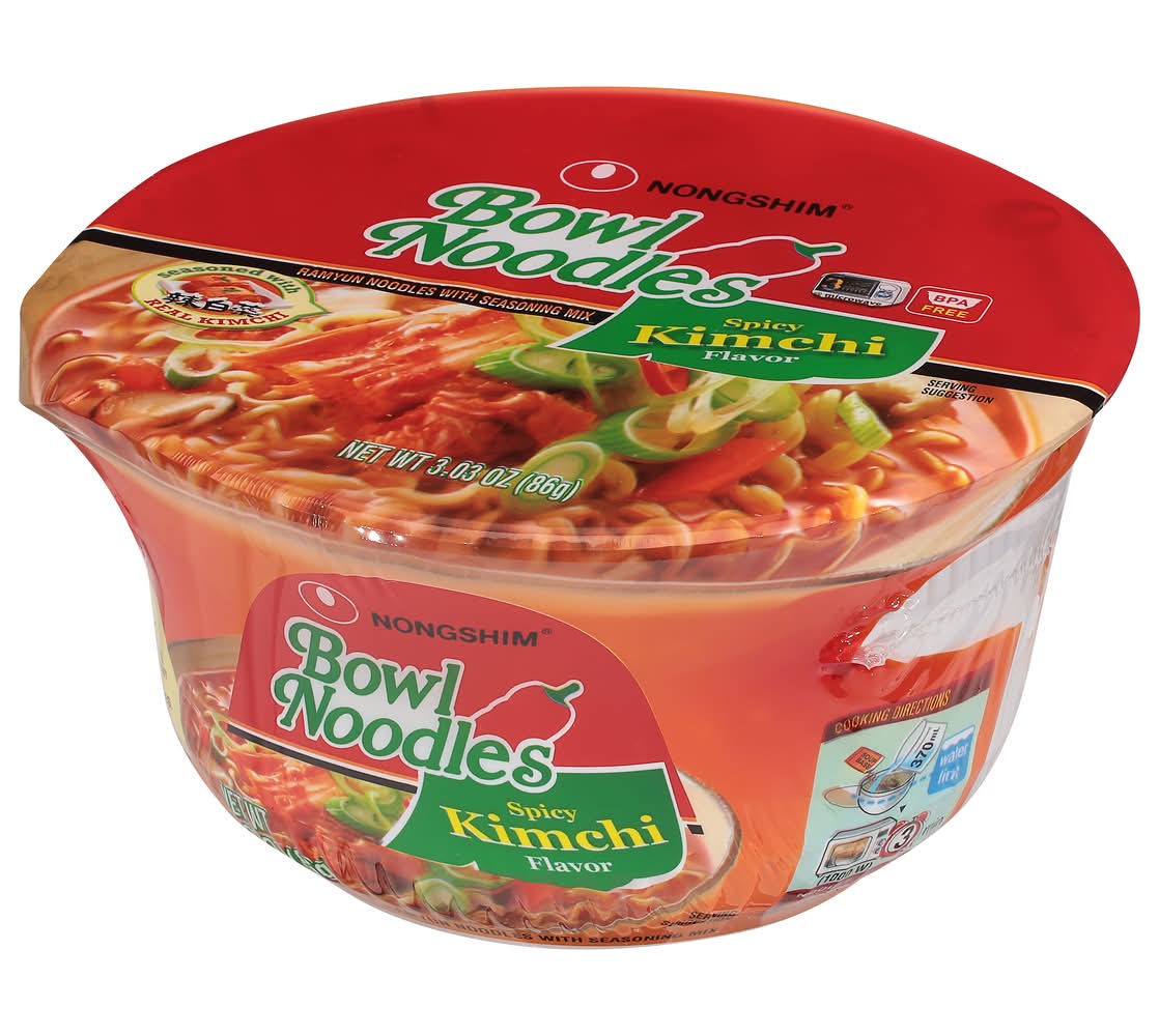 Ramyun noodles with seasoning mix. 3 min (at) microwave. Seasoned with real kimchi. Flavor: Spicy kimchi