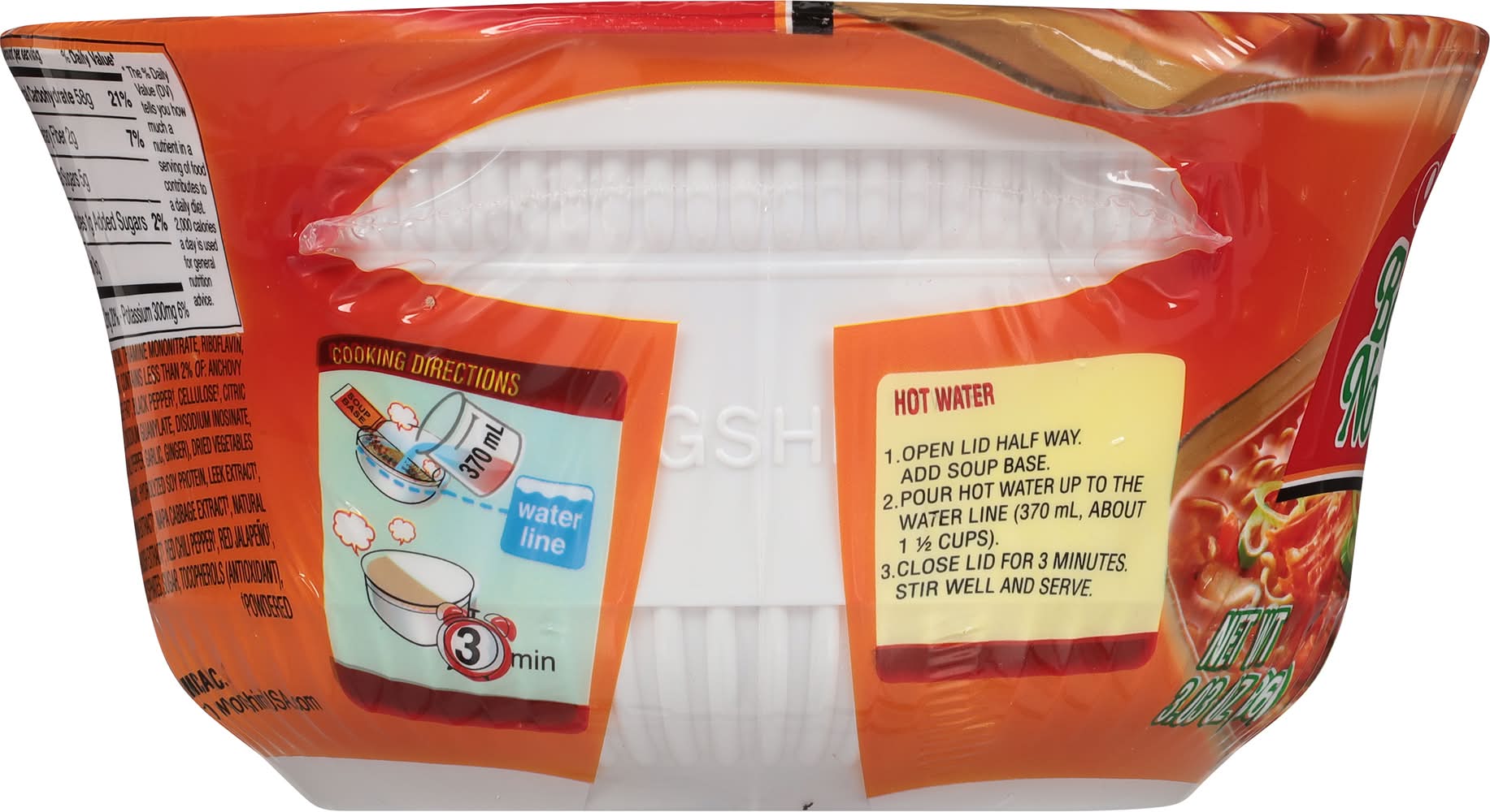 Cooking directions: hot water: 1. open lid half way. add soup base. 2. pour hot water up to the water line (370 ml, about 1 1/2 cups). 3. close lid for 3 minutes. stir well and serve. cooking directions: noodle texture. al dente 3 min; medium: 3 1/2 min; soft: 4 min. microwave: 1. completely remove lid. add soup base. 2. pour room temperature water up to the water line (370 ml, about 1 1/2 cups). 3. microwave for 3 minutes. stir well and serve. cooking time may vary depending on microwave watts. caution: product is very hot after heating. handle with care to avoid spilling or burning yourself never microwave without water.
