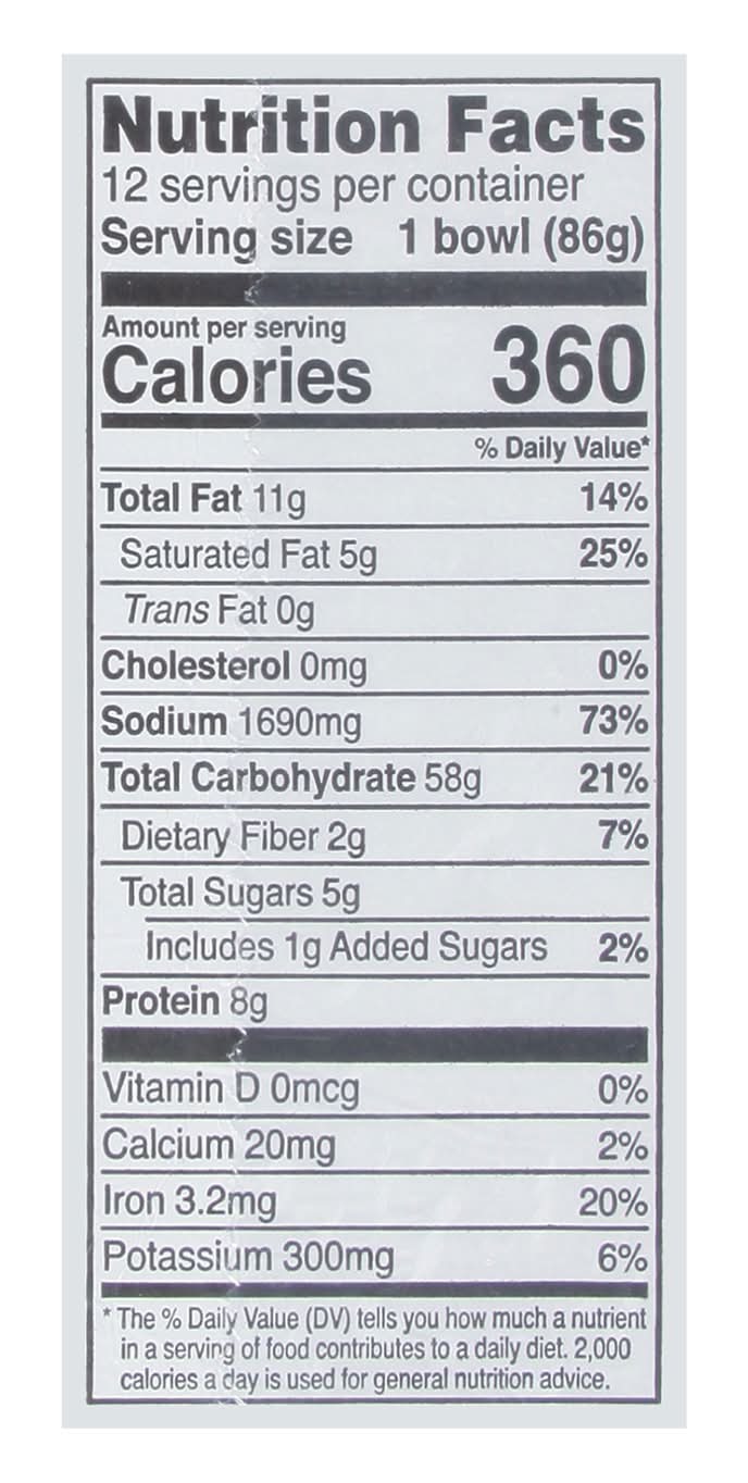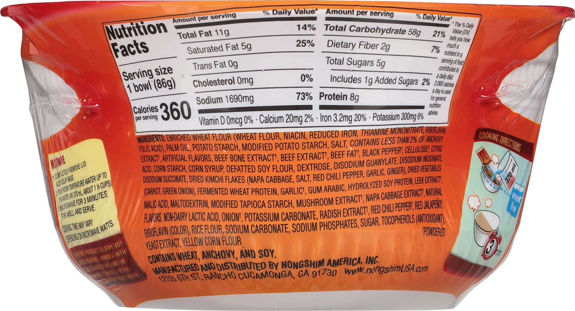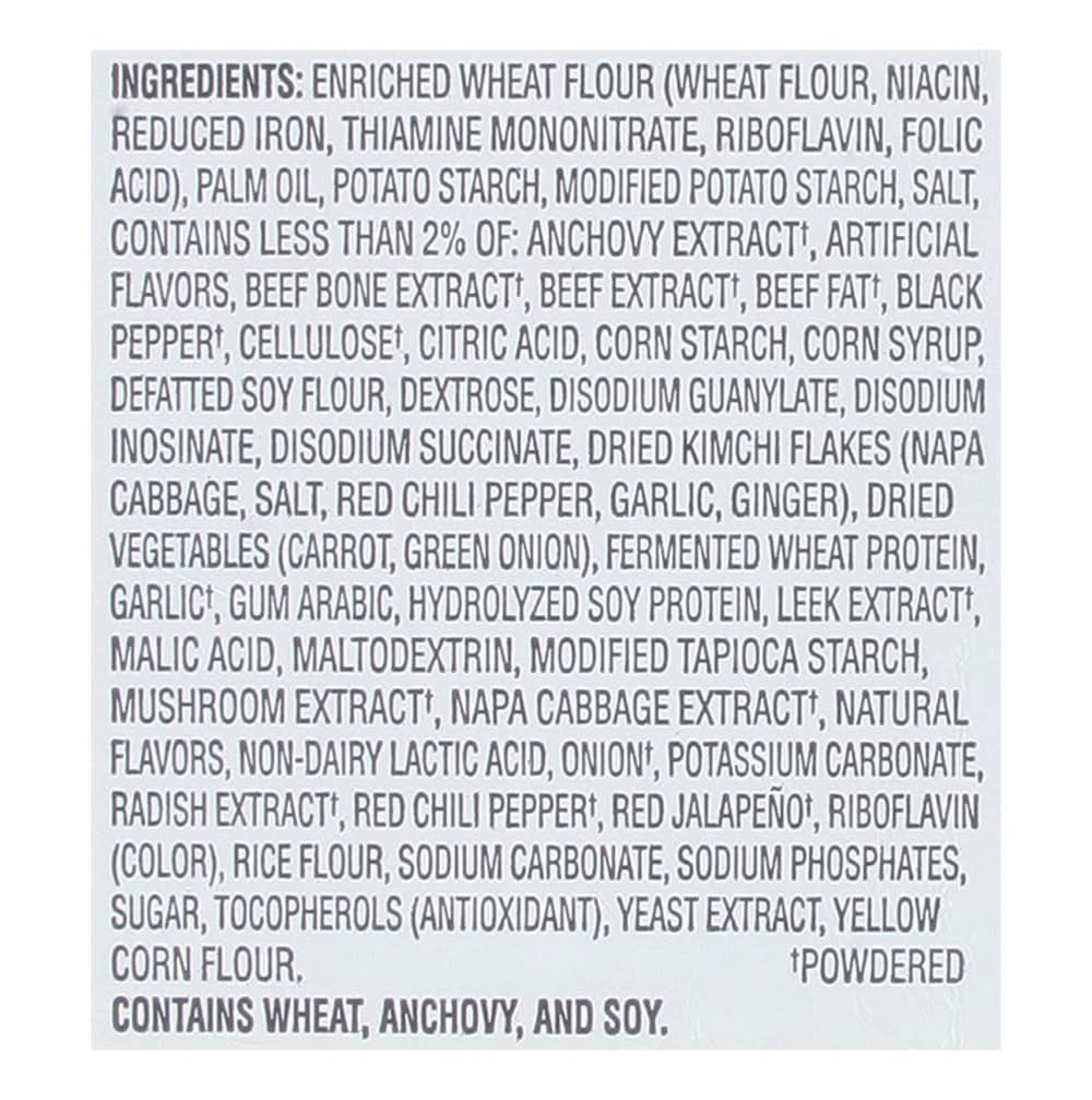 Ingredients: Enriched Wheat Flour (Wheat Flour, Niacin, Reduced Iron, Thiamine Mononitrate, Riboflavin, Folic Acid), Palm Oil, Potato Starch, Modified Potato Starch, Salt, Contains Less than 2% of: Anchovy Extract (Powdered ), Artificial Flavors, Beef Bone Extract (Powdered ), Beef Extract (Powdered ), Beef Fat Powdered ‘(Powdered ), Black Pepper (Powdered ), Cellulose (Powdered ), Citric Acid, Corn Starch, Corn Syrup, Defatted Soy Flour, Dextrose, Disodium Guanylate, Disodium Inosinate, Disodium Succinate, Dried Kimchi Flakes (Napa Cabbage, Salt, Red Chili Pepper, Garlic, Ginger), Dried Vegetables (Carrot, Green Onion), Fermented Wheat Protein, Garlic, Gum Arabic, Hydrolyzed Soy Protein, Leek Extract (Powdered ), Malic Acid, Maltodextrin, Modified Tapioca Starch, Mushroom Extract, Napa Cabbage Extract (Powdered ), Natural Flavors, Non-Dairy Lactic Acid, Onion (Powdered ), Potassium Carbonate, Radish Extract (Powdered ), Red Chili Pepper (Powdered ), Red Jalapeno (Powdered ), Riboflavin (Color), Rice Flour, Sodium Carbonate, Sodium Phosphates, Sugar, Tocopherols (Antioxidant), Yeast Extract, Yellow Corn Flour, Contains: Wheat, Soybeans, Fish, Anchovy, Crustacean Shellfish, Eggs, Peanuts, Milk, Tree Nuts, Sesame