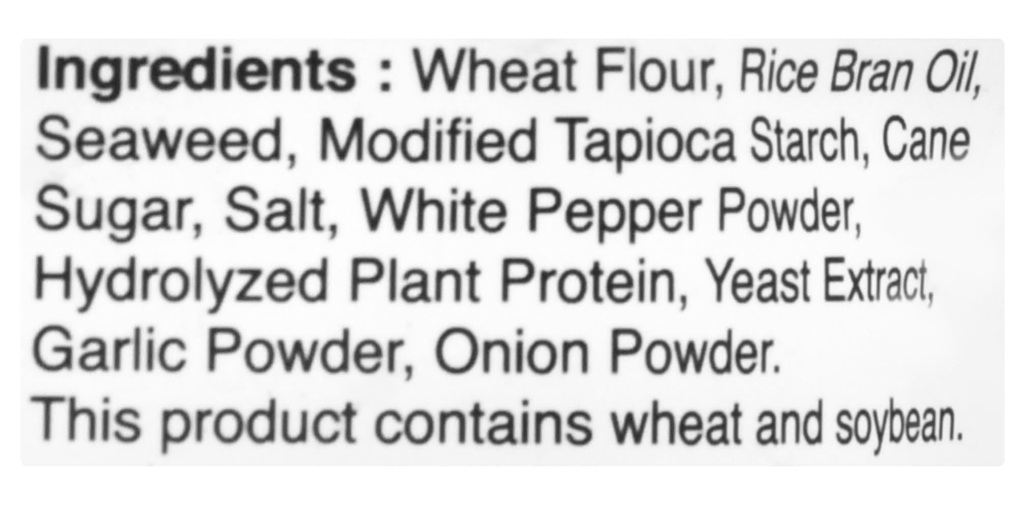 Ingredients: Wheat Flour, Rice Bran Oil, Seaweed, Modified Tapioca Starch, Cane Sugar, Salt, White Pepper Powder, Hydrolyzed Plant Protein, Yeast Extract, Garlic Powder, Onion Powder Contains: Wheat, Soybeans