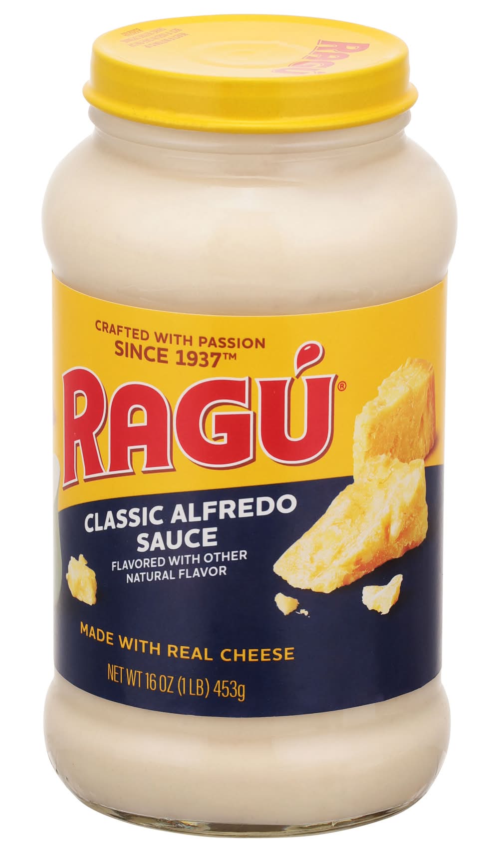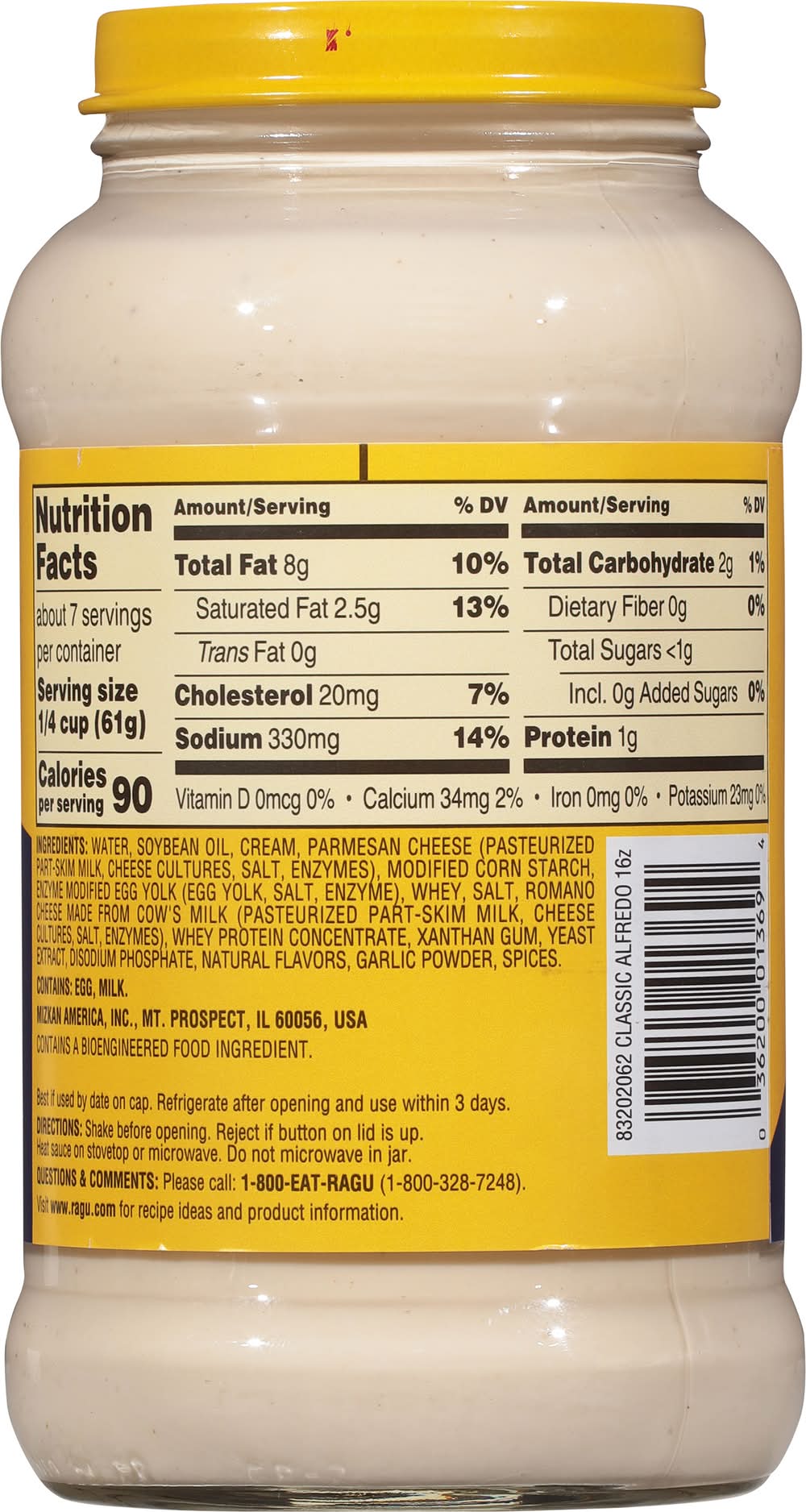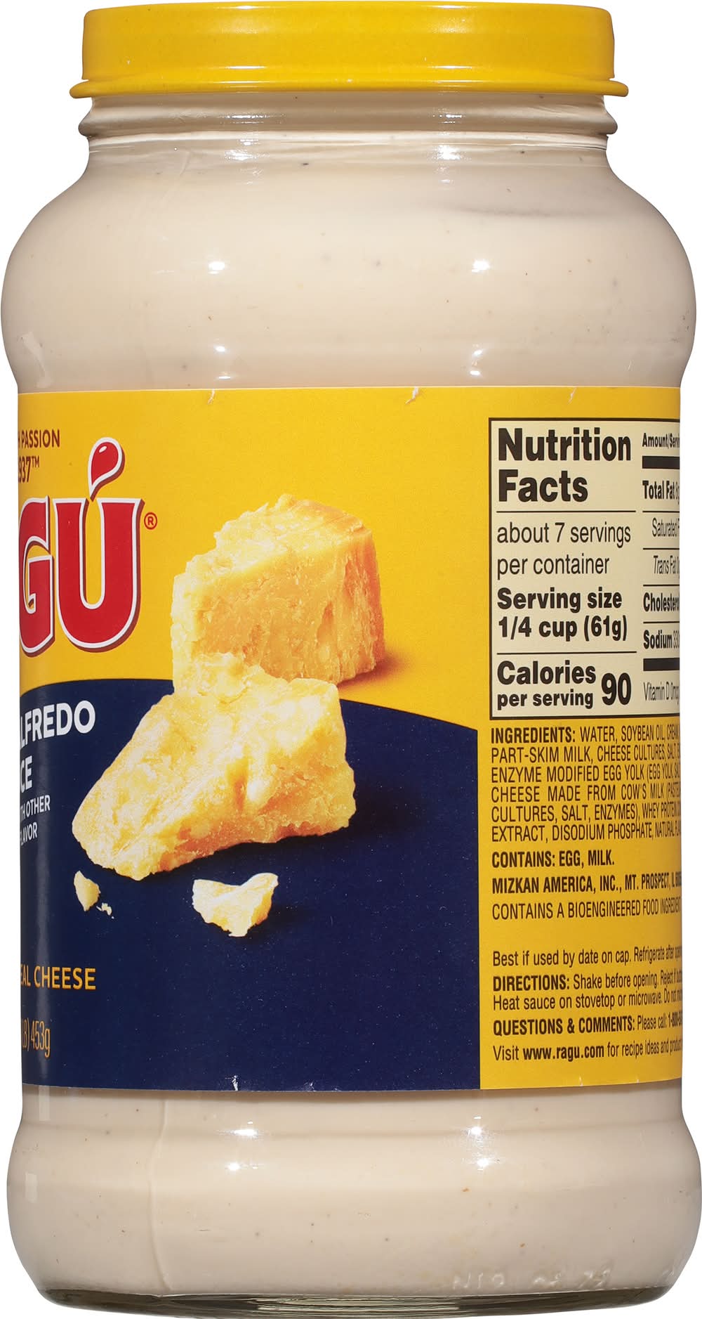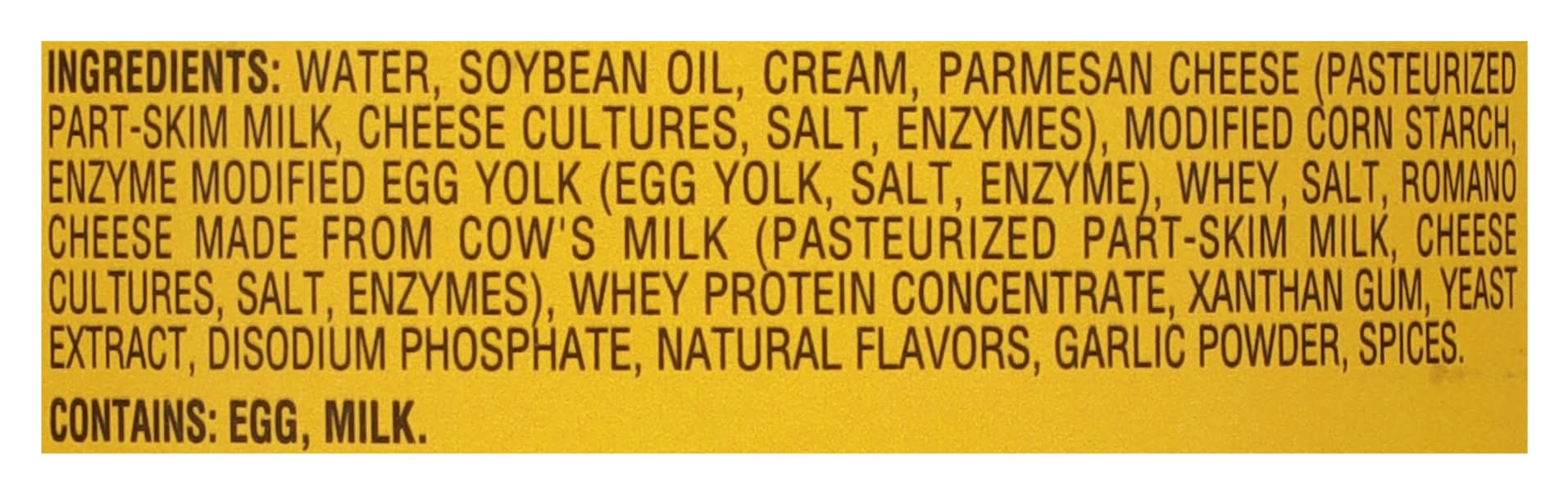 Ingredients: Water, Soybean Oil, Cream, Parmesan Cheese Pasteurized Part-Skim Milk, Cheese Cultures, Salt, Enzymes, Modified Corn Starch, Enzyme Modified Egg Yolk Egg Yolk, Salt, Enzymes, Whey, Salt, Romano Cheese Made from Cow's Milk Pasteurized Part-Skim Milk, Cheese Cultures, Salt, Enzymes, Whey Protein Concentrate, Xanthan Gum, Yeast Extract, Disodium Phosphate, Natural Flavors, Garlic Powder, Spices." Contains: Soybeans, milk, corn, eggs