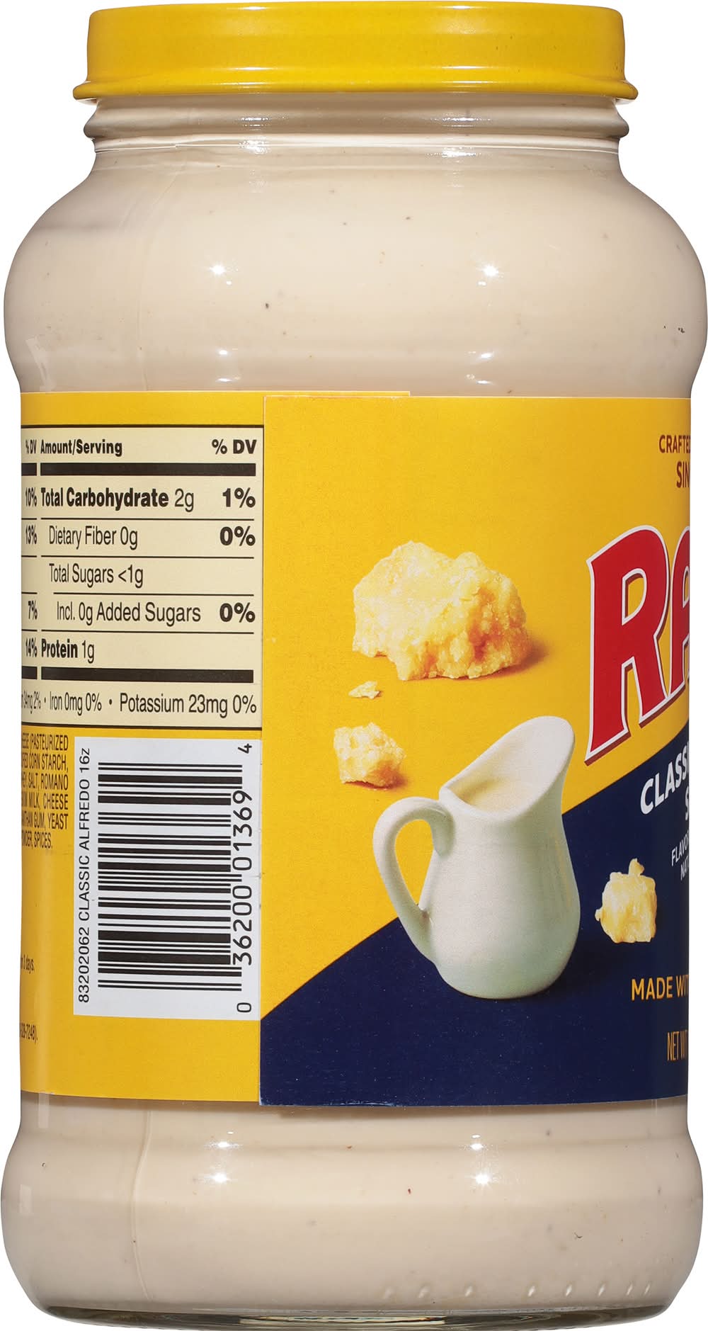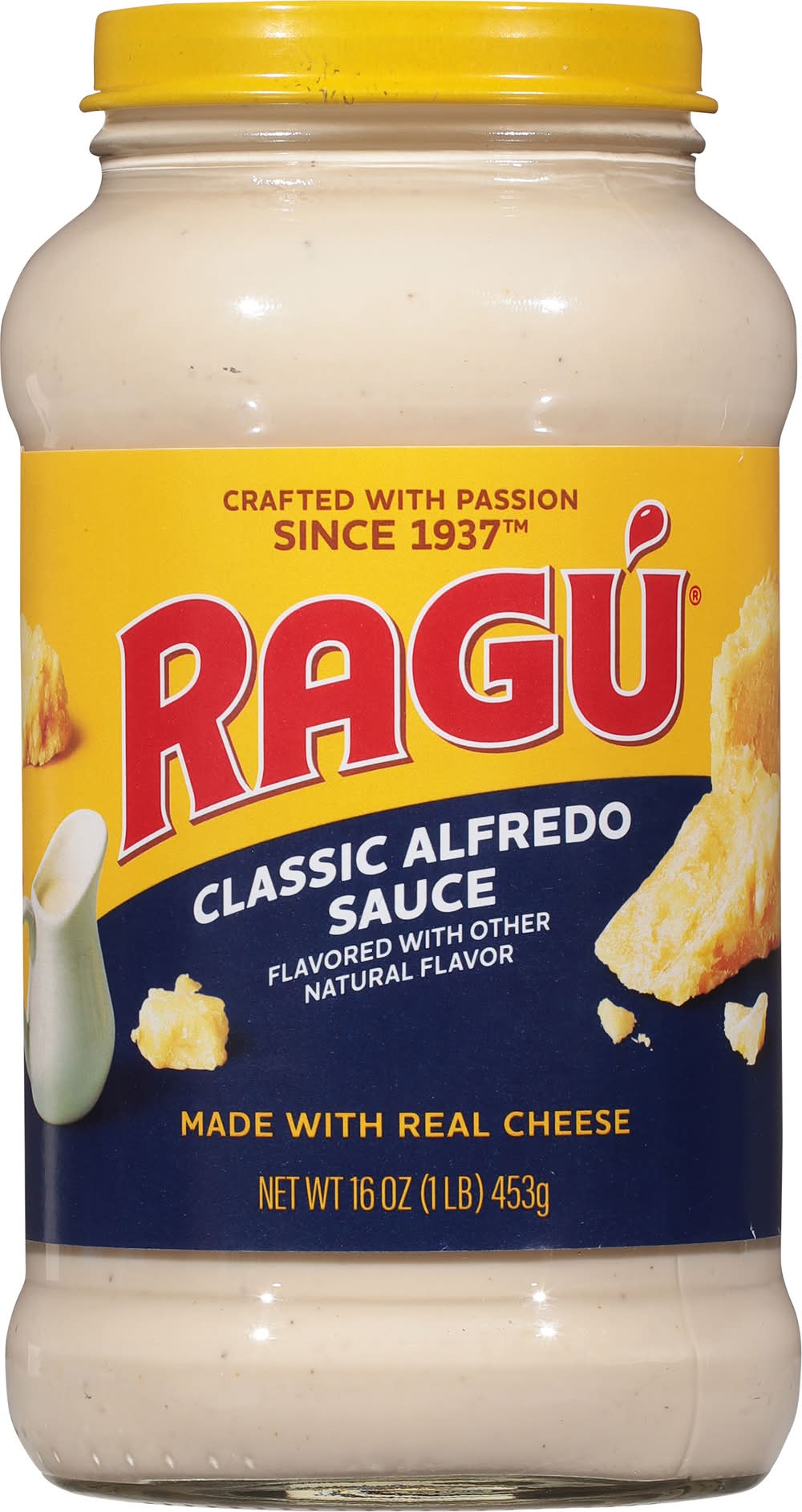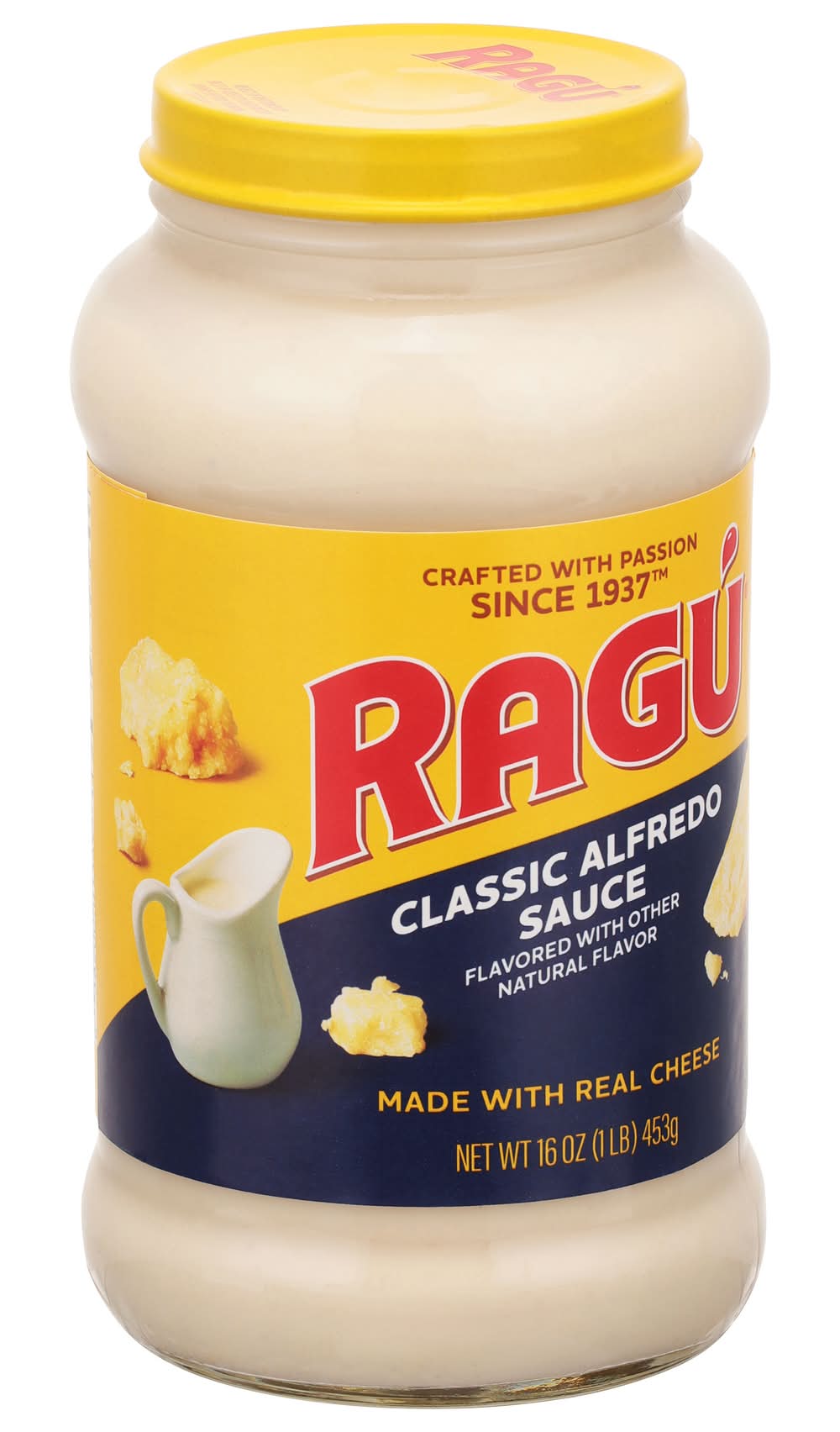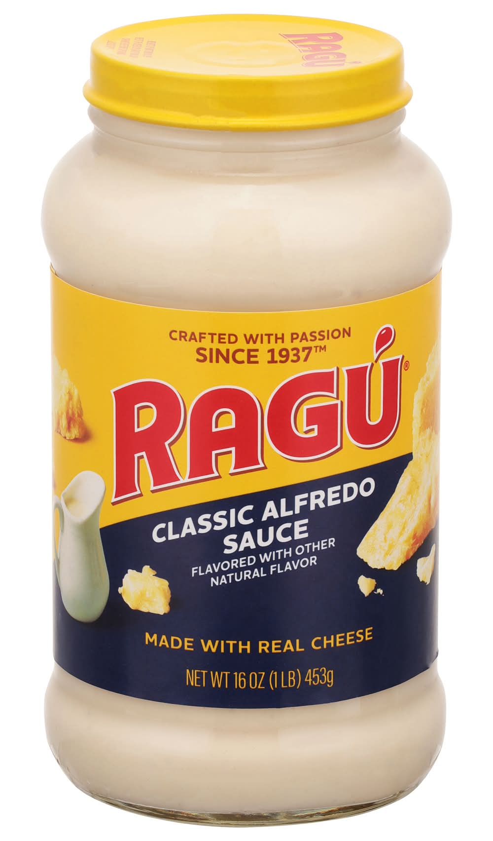 Ingredients: Water, Soybean Oil, Cream, Parmesan Cheese Pasteurized Part-Skim Milk, Cheese Cultures, Salt, Enzymes, Modified Corn Starch, Enzyme Modified Egg Yolk Egg Yolk, Salt, Enzymes, Whey, Salt, Romano Cheese Made from Cow's Milk Pasteurized Part-Skim Milk, Cheese Cultures, Salt, Enzymes, Whey Protein Concentrate, Xanthan Gum, Yeast Extract, Disodium Phosphate, Natural Flavors, Garlic Powder, Spices." Contains: Soybeans, milk, corn, eggs