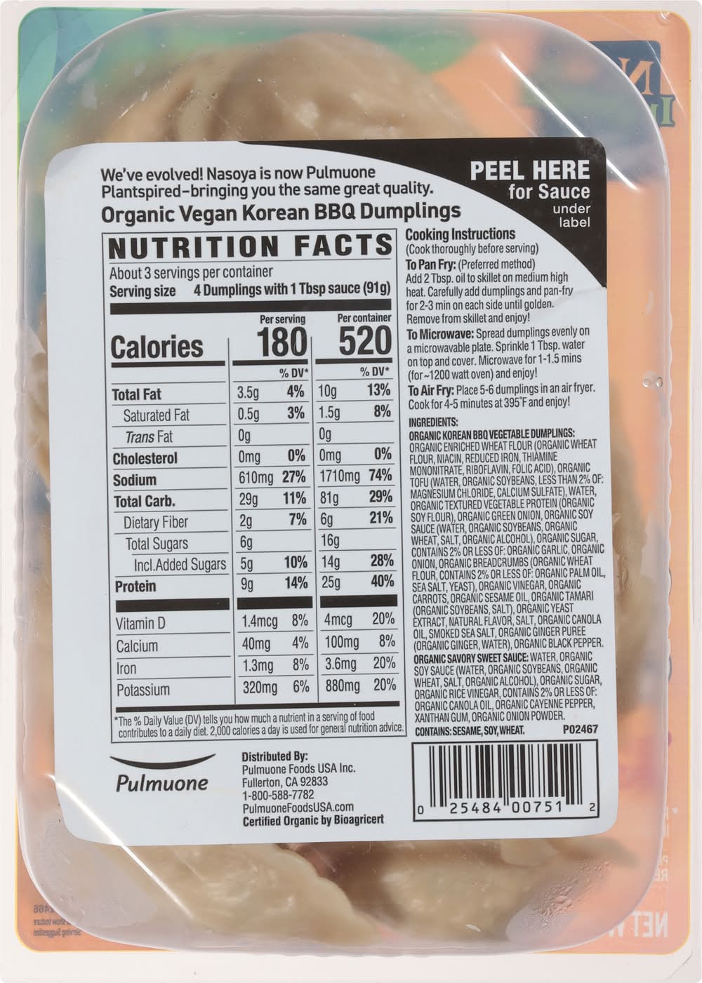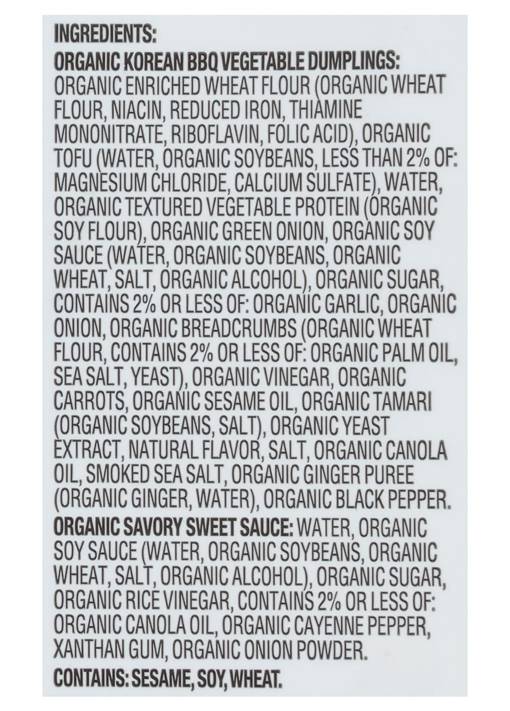 Ingredients: Organic Korean BBQ Vegetable Dumplings: Organic Enriched Wheat Flour (Organic Wheat Flour, Niacin, Reduced Iron, Thiamine Mononitrate, Riboflavin, Folic Acid), Organic Tofu (Water, Organic Soybeans, Less than 2% of: Magnesium Chloride, Calcium Sulfate), Water, Organic Textured Vegetable Protein (Organic Soy Flour), Organic Green Onion, Organic Soy Sauce (Water, Organic Soybeans, Organic Wheat, Salt, Organic Alcohol), Organic Sugar, Contains 2% or Less of: Organic Garlic, Organic Onion, Organic Breadcrumbs (Organic Wheat Flour, Contains 2% or Less of: Organic Palm Oil, Sea Salt, Yeast), Organic Vinegar, Organic Carrots, Organic Sesame Oil, Organic Tamari (Organic Soybeans, Salt), Organic Yeast Extract, Natural Flavor, Salt, Organic Canola Oil, Smoked Sea Salt, Organic Ginger Puree (Organic Ginger, Water), Organic Black Pepper, Organic Savory Sweet Sauce: Water, Organic Soy Sauce (Water, Organic Soybeans, Organic Wheat, Salt, Organic Alcohol), Organic Sugar, Organic Rice Vinegar, Contains 2% or Less of: Organic Canola Oil, Organic Cayenne Pepper, Xanthan Gum, Organic Onion Powder Contains: Sesame, Soybeans, Wheat