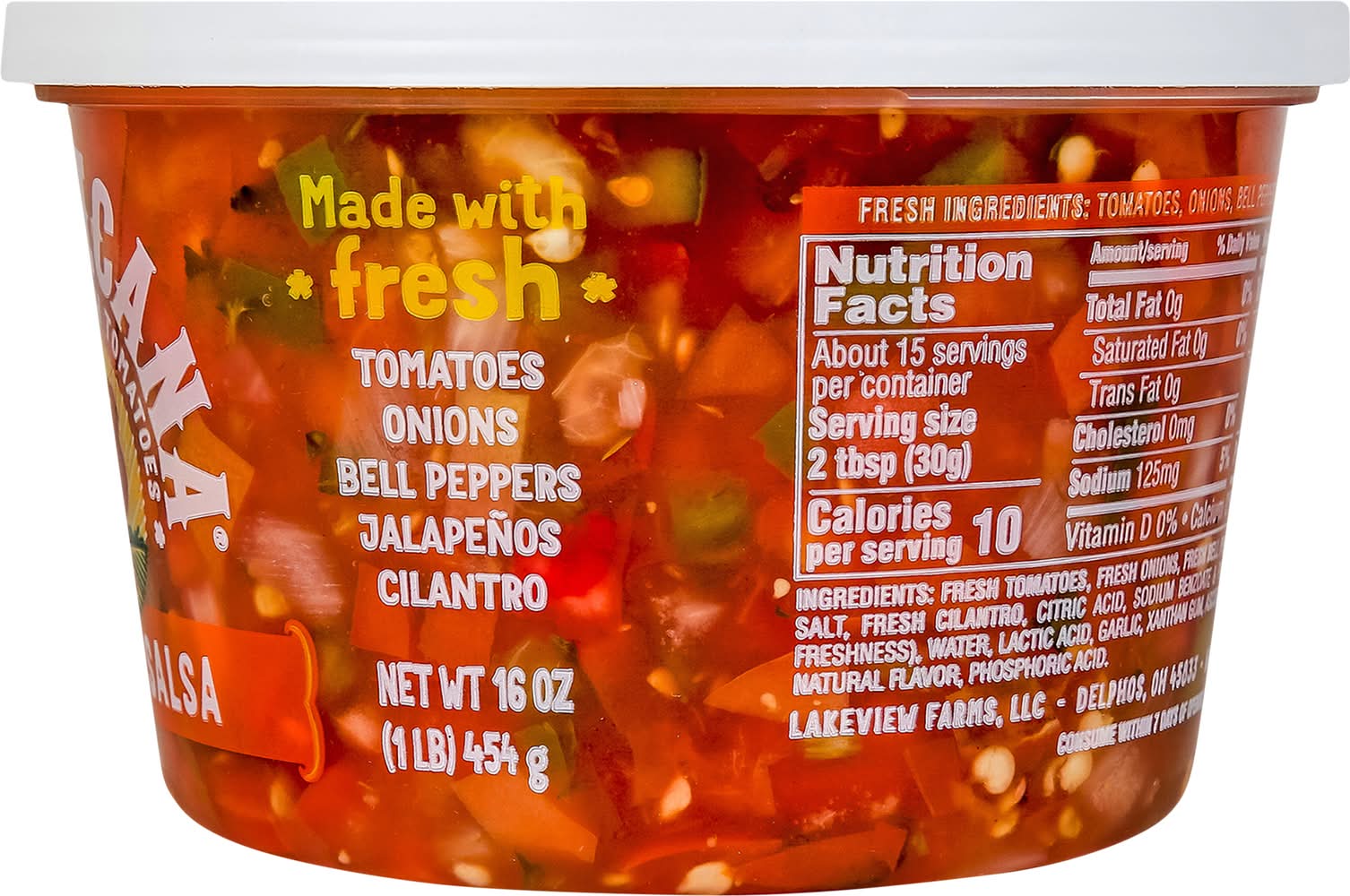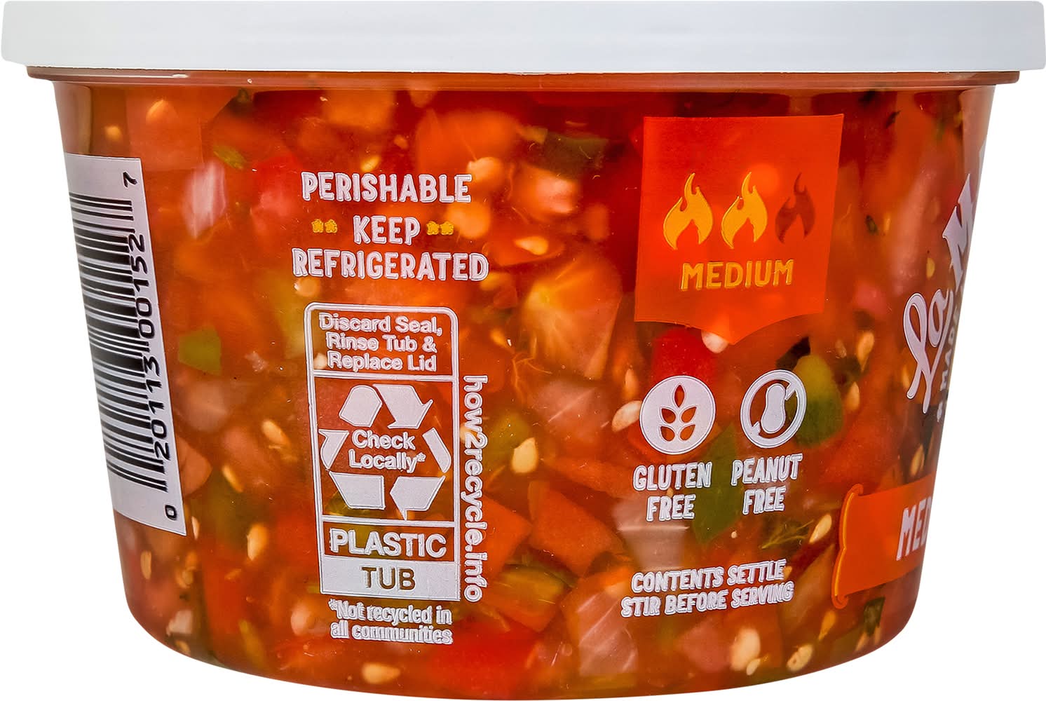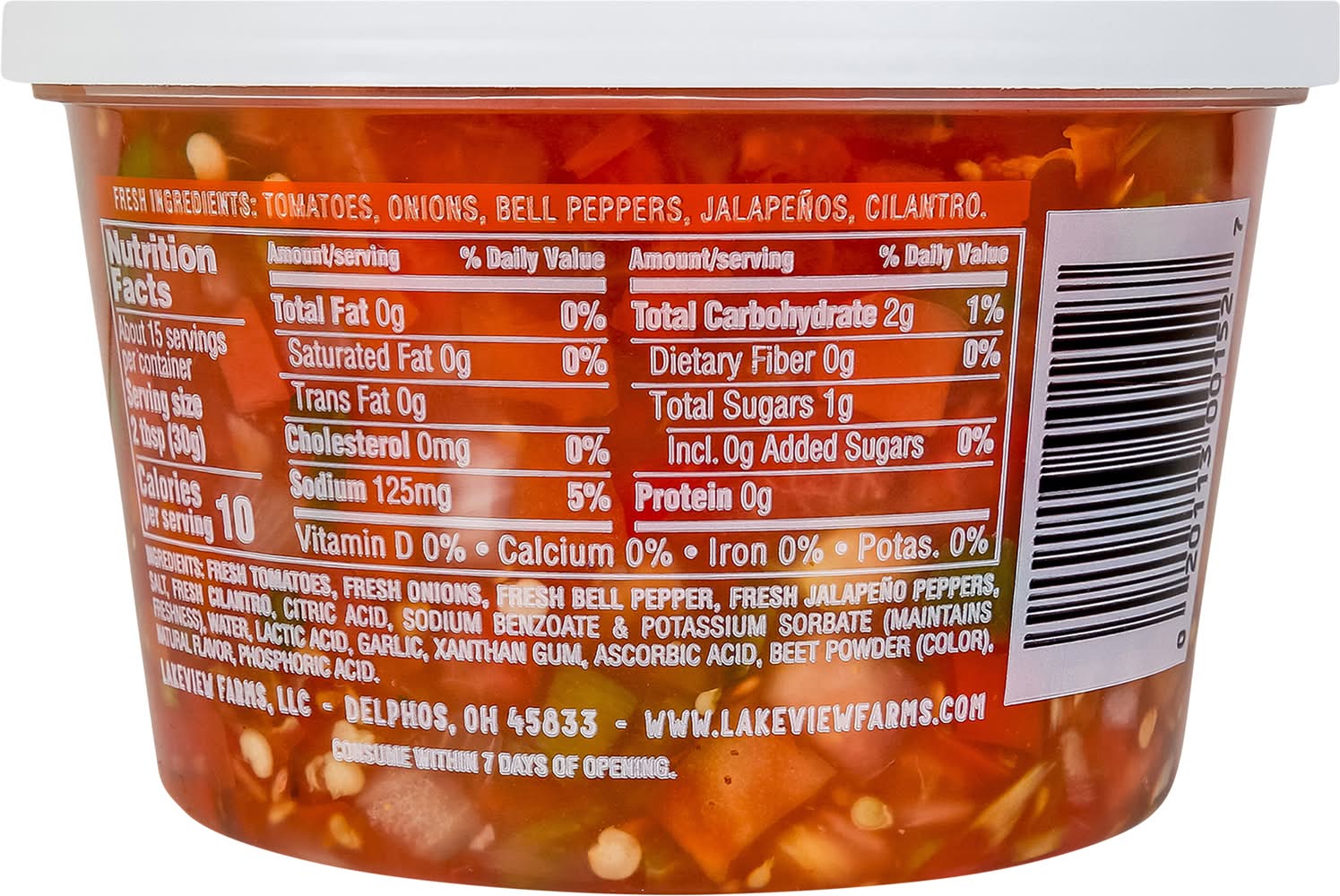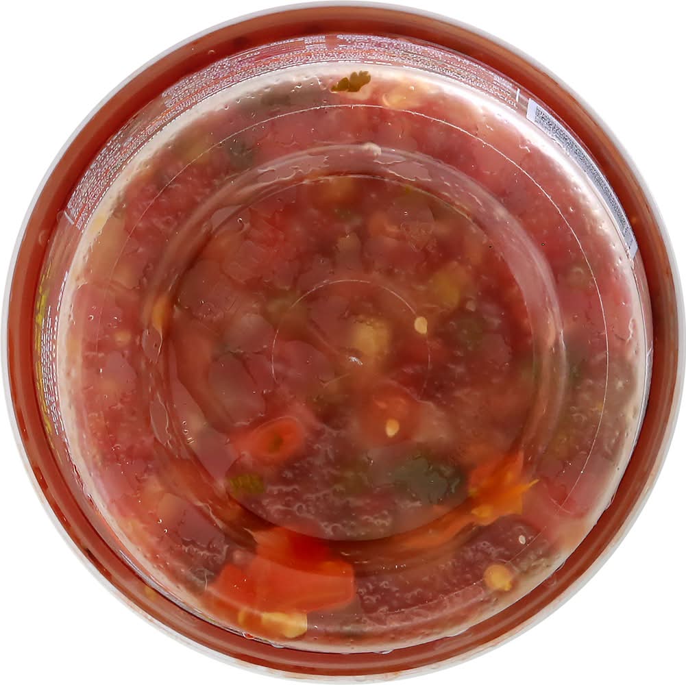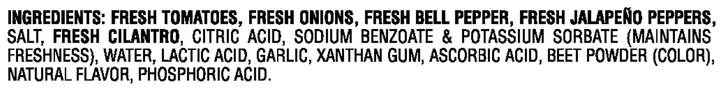 Ingredients: Fresh Tomatoes, Fresh Onions, Fresh Bell Pepper, Fresh Jalapeno Peppers, Salt, Fresh Cilantro, Citric Acid, Sodium Benzoate & Potassium Sorbate (Maintains Freshness), Water, Lactic Acid, Garlic, Xanthan Gum, Ascorbic Acid, Beet Powder (Color), Natural Flavor, Phosphoric Acid