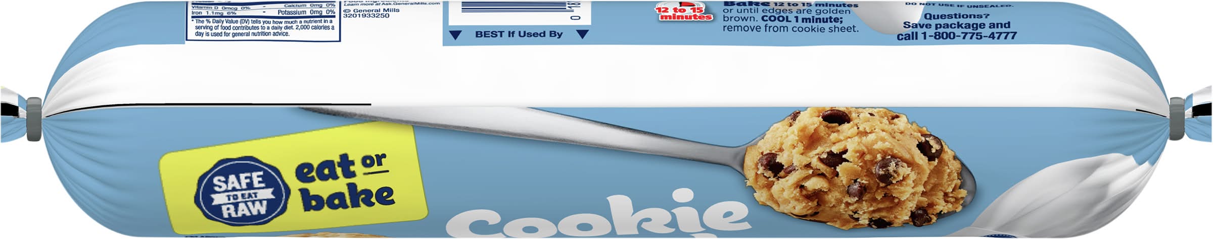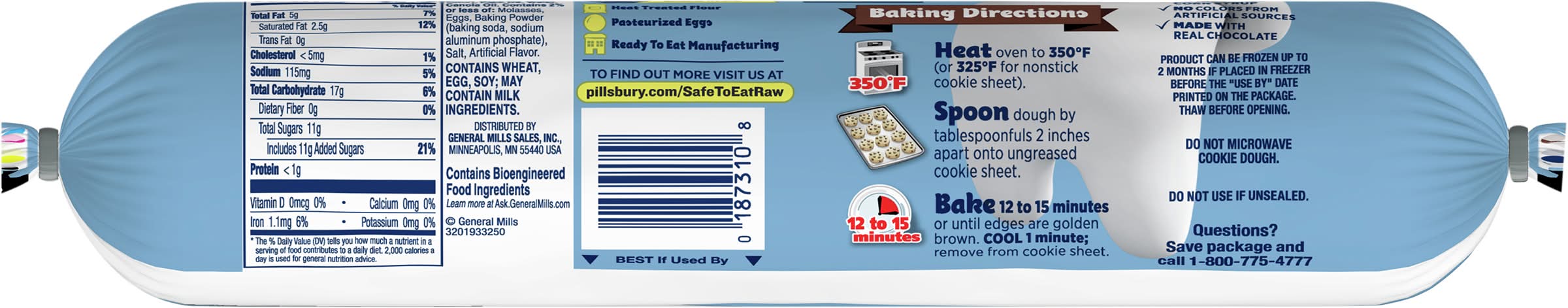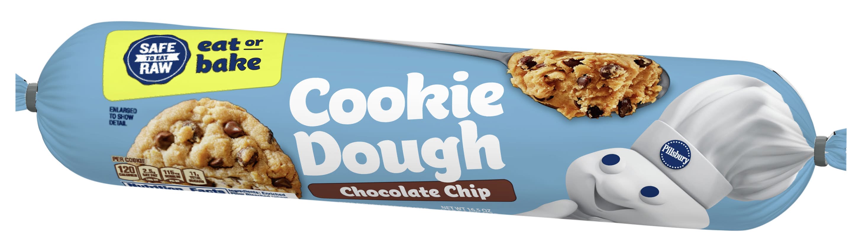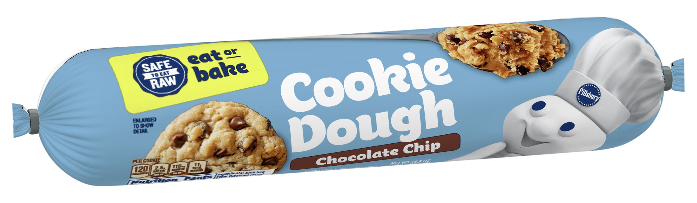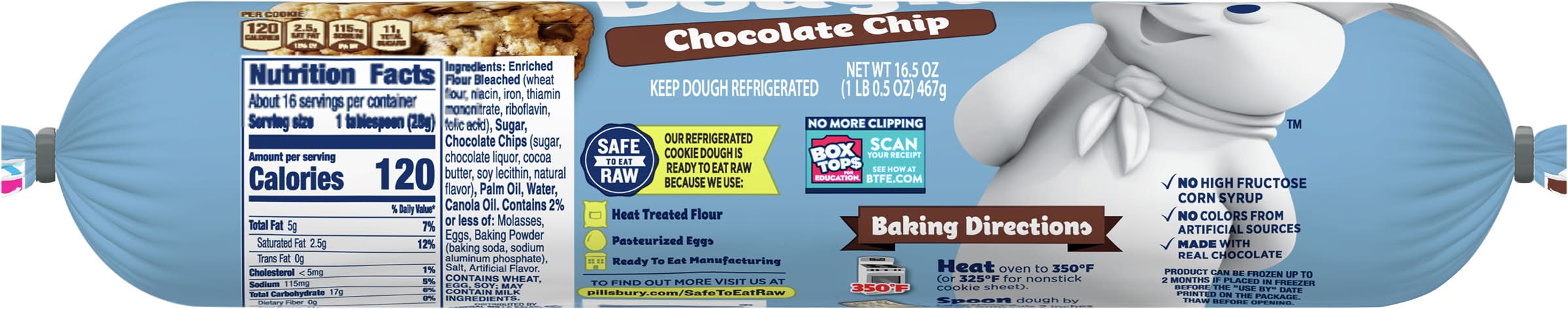 Contains bioengineered food ingredients. Safe to eat raw. Eat or bake. Our refrigerated cookie dough is ready to eat raw because we use: Heat treated flour; Pasteurized eggs; Ready to eat manufacturing. No high fructose corn syrup. No colors from artificial sources. Save package Box Tops for Education: No more clipping. Scan your receipt. Flavor: Chocolate chip