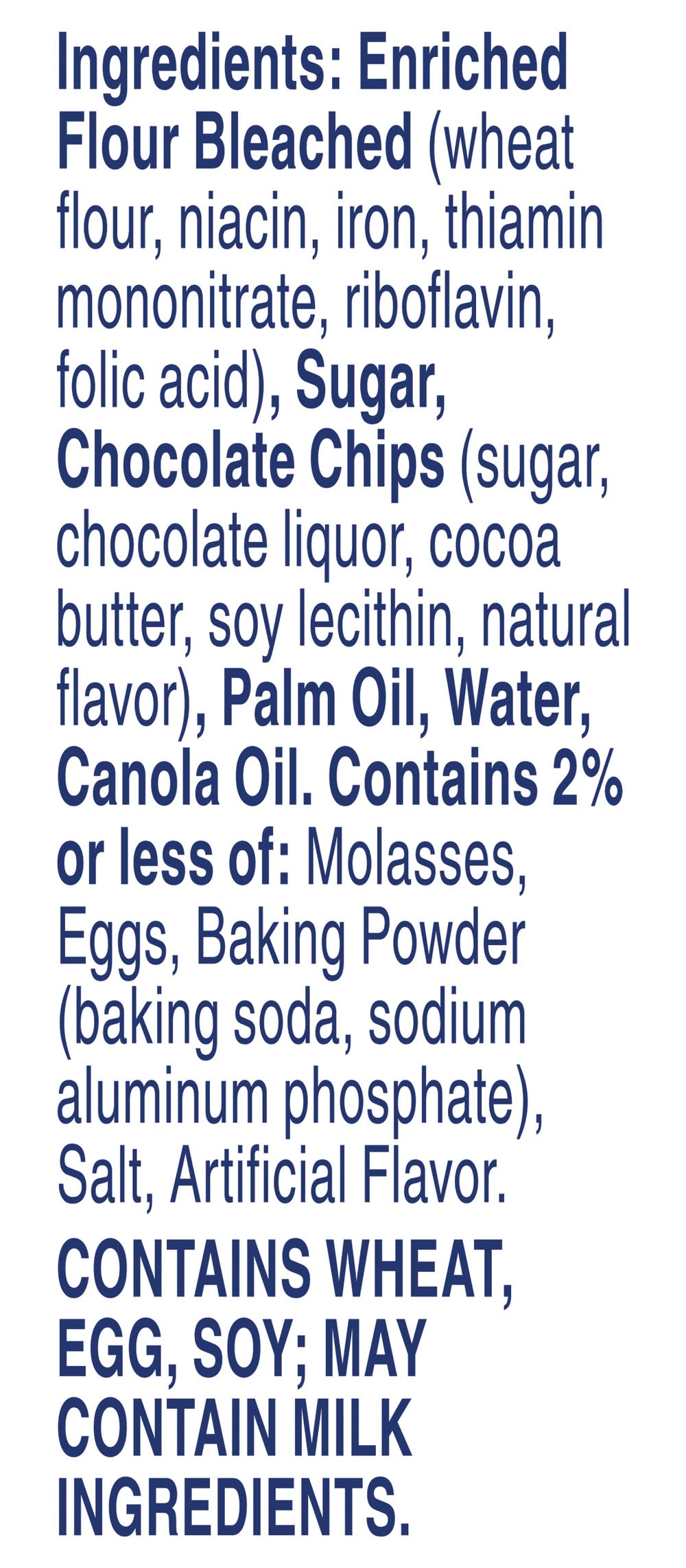 Ingredients: Enriched Flour Bleached (Wheat Flour, Niacin, Iron, Thiamin Mononitrate, Riboflavin, Folic Acid), Sugar, Chocolate Chips (Sugar, Chocolate Liquor, Cocoa Butter, Soy Lecithin, Natural Flavor), Palm Oil, Water, Canola Oil. Contains 2% or Less of: Molasses, Eggs, Baking Powder (Baking Soda, Sodium Aluminum Phosphate), Salt, Artificial Flavor Contains: Wheat, Eggs, Soybeans, Milk