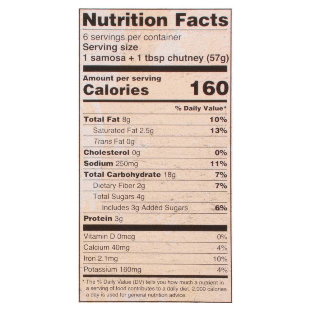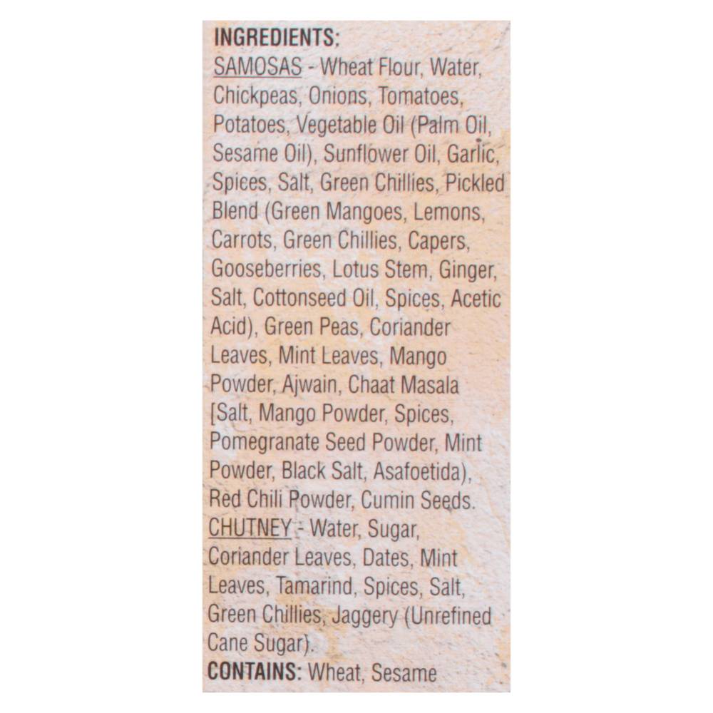 Ingredients: Samosas - Wheat Flour, Water, Chickpeas, Onions, Tomatoes, Potatoes, Vegetable Oil (Palm Oil Sesame Oil), Sunflower Oil, Garlic, Spices, Salt, Green Chillies, Pickled Blend (Green Mangoes Lemons Carrots Green Chillies Capers Gooseberries Lotus Stem Ginger Salt Cottonseed Oil Spices Acetic Acid), Green Peas, Coriander Leaves, Mint Leaves, Mango Powder, Ajwain, Chaat Masala (Salt Mango Powder Spices Pomegranate Seed Powder Mint Powder Black Salt Asafoetida), Red Chili Powder, Cumin Seeds. Chutney: Water, Sugar, Coriander Leaves, Dates, Mint Leaves, Tamarind, Spices, Salt, Green Chillies, Jaggery (Unrefined Cane Sugar) Contains: Wheat, Sesame