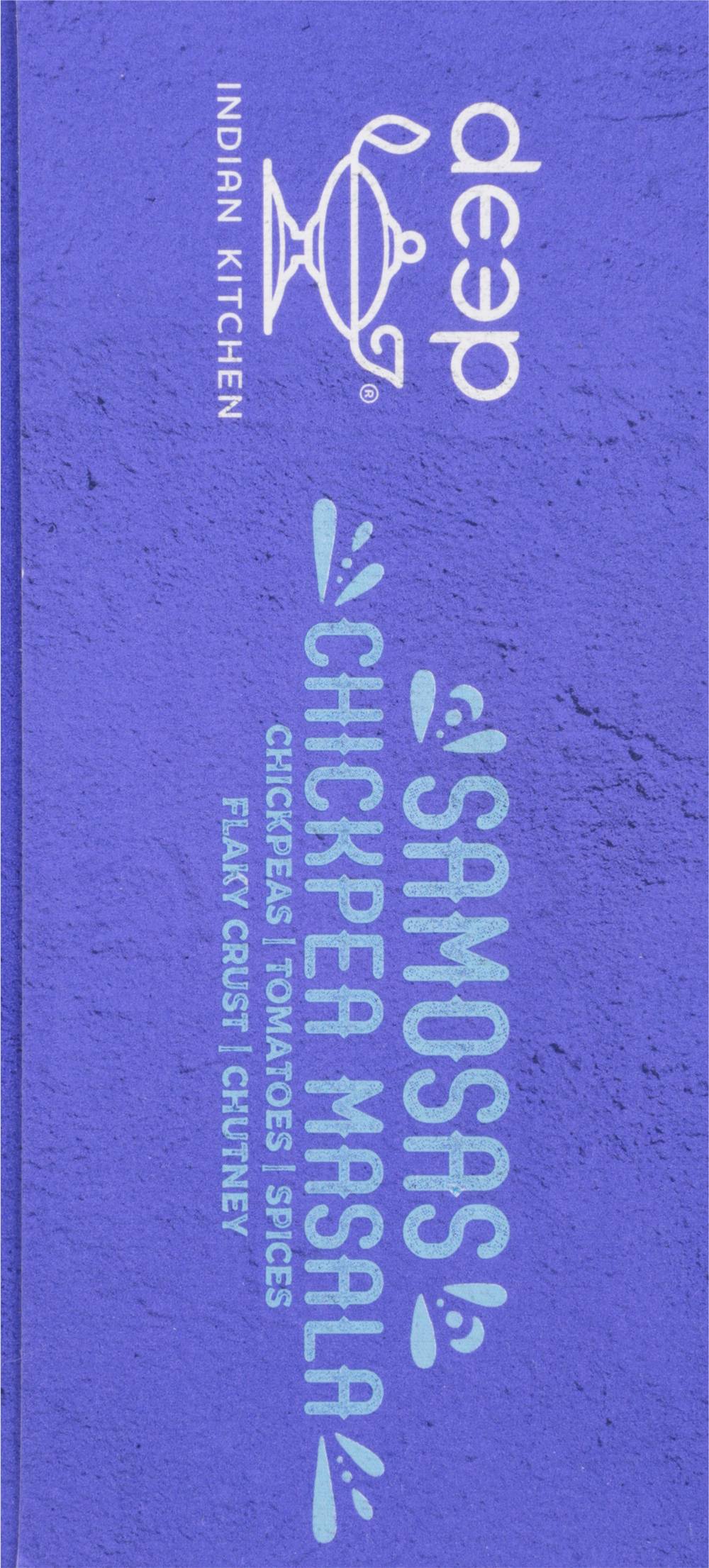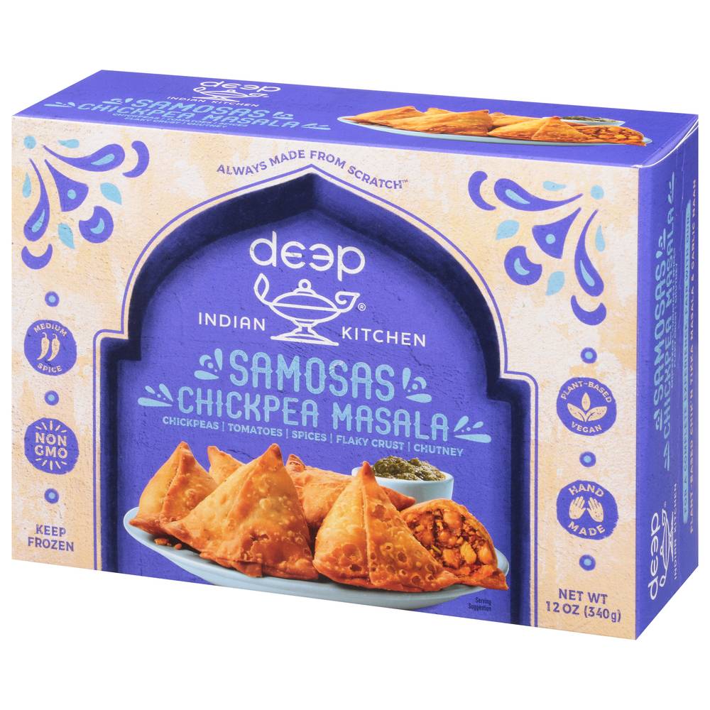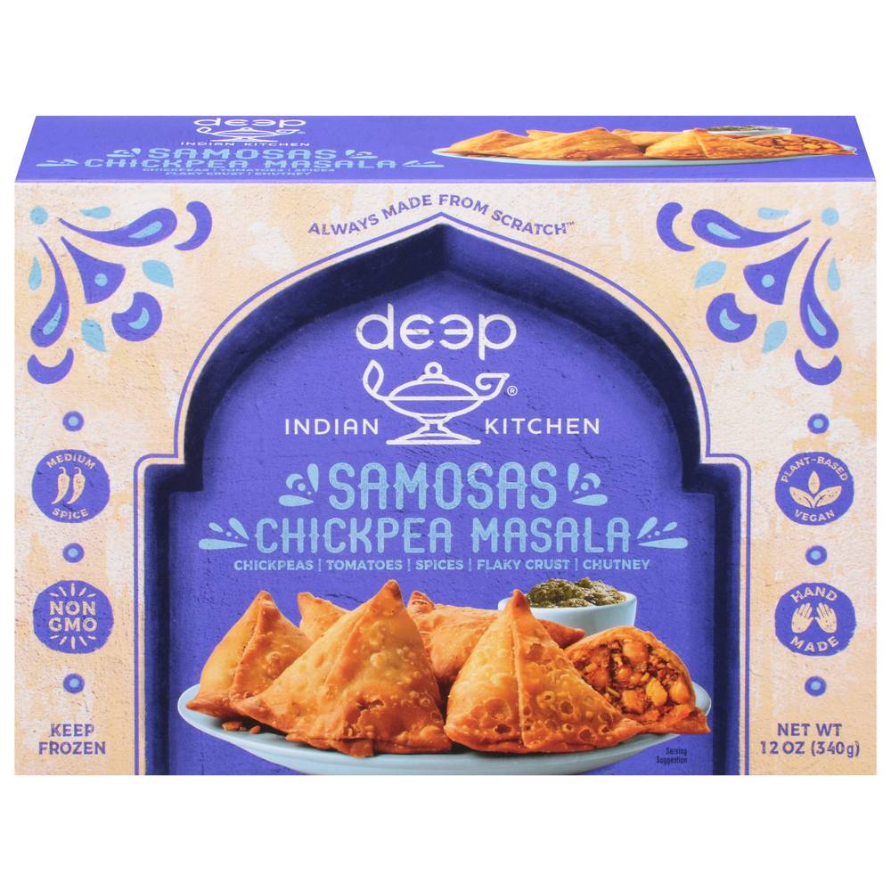 Chickpeas, tomotoes, spices, flaky crust. Chutney. Vegan. Non-GMO. Always made from scratch. Medium. Spice. Plant-Based. Hand made. Welcome to deep and welcome to our Indian family's kitchen. Like our mom's Chickpea Masala, but bite sized! First we slow-cook our chickpeas 'til they're soft and plump, then we mix them with our own freshly-ground spices. After, we stuff them in a flaky pastry crust, top with our signature chutney and the result is addictive! Now, say protein-packed pockets 10 times fast! This Dish Features: Chickpeas, tomatoes, chili peppers, coriander, garlic. deepindiankitchen.com. Dive deeper: (at)deepindiankitchen. To our family, the name Deep is, well, deep. In India it means lamp and enlightenment, and our mission is to share the best of India's culture with everyone. That's whey we care so much about our food and every purchase benefits our Deepkiran (Ray of Light) foundation, which helps children in rural India access education. Children we support each year 22,000+. Product of India.