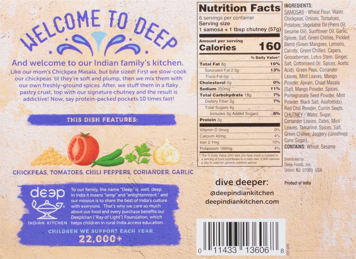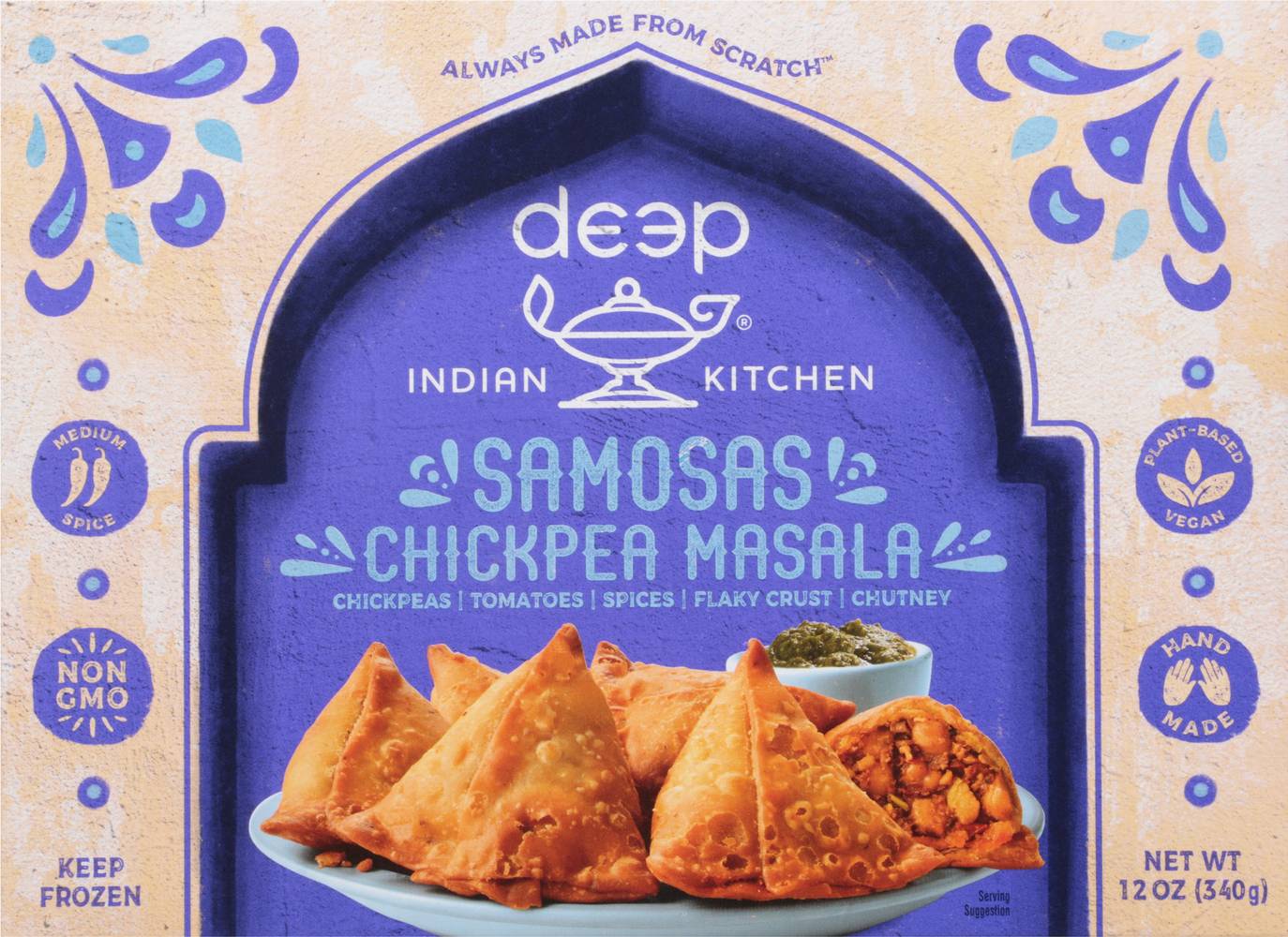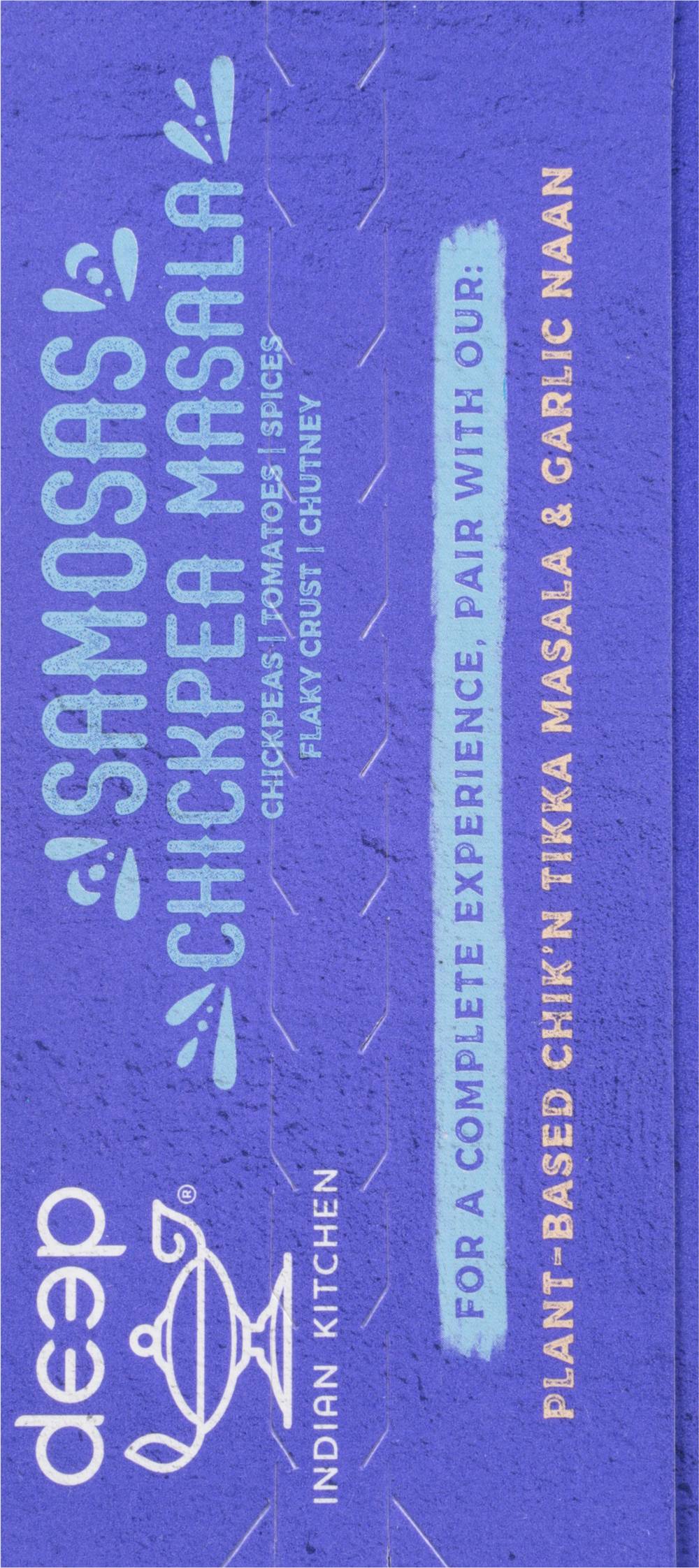 Chickpeas, tomotoes, spices, flaky crust. Chutney. Vegan. Non-GMO. Always made from scratch. Medium. Spice. Plant-Based. Hand made. Welcome to deep and welcome to our Indian family's kitchen. Like our mom's Chickpea Masala, but bite sized! First we slow-cook our chickpeas 'til they're soft and plump, then we mix them with our own freshly-ground spices. After, we stuff them in a flaky pastry crust, top with our signature chutney and the result is addictive! Now, say protein-packed pockets 10 times fast! This Dish Features: Chickpeas, tomatoes, chili peppers, coriander, garlic. deepindiankitchen.com. Dive deeper: (at)deepindiankitchen. To our family, the name Deep is, well, deep. In India it means lamp and enlightenment, and our mission is to share the best of India's culture with everyone. That's whey we care so much about our food and every purchase benefits our Deepkiran (Ray of Light) foundation, which helps children in rural India access education. Children we support each year 22,000+. Product of India.