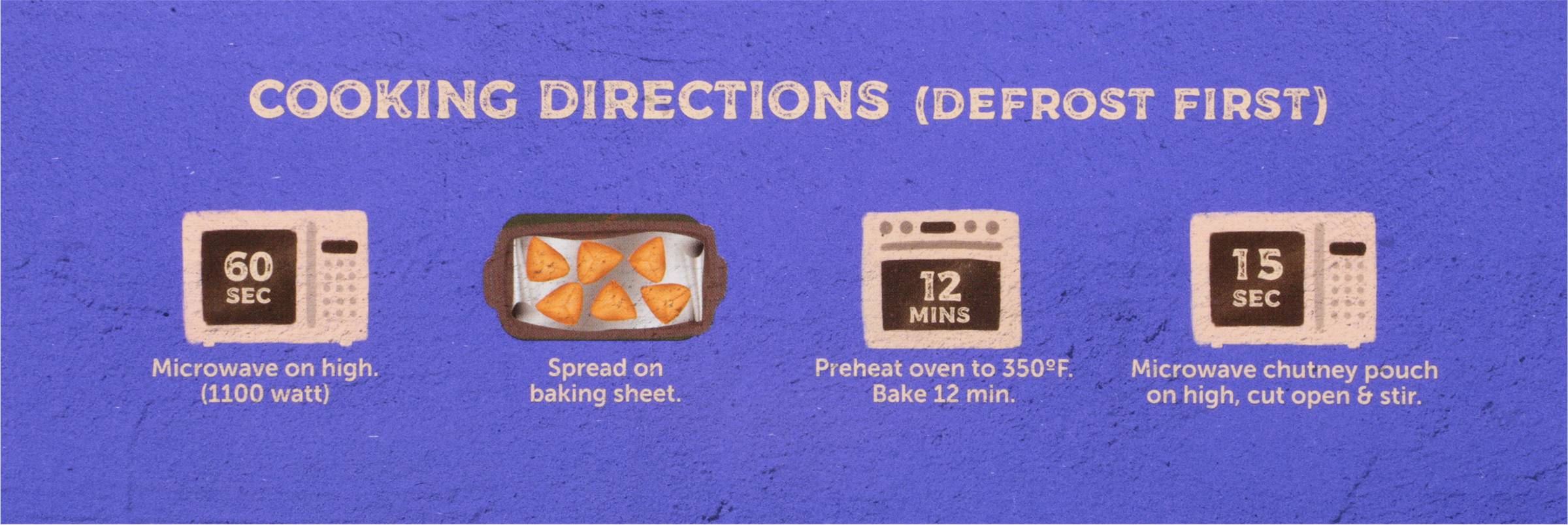 Directions for use: Directions: Cooking Directions (Defrost first): Microwave on high. (1100 watt). Spread on baking sheet. Preheat oven to 350 degrees F. Bake 12 min. Microwave chutney pouch on high, cut open & stir. For a complete experience, pair with our: Plant-Based Chik ‘N Tikka Masala & Garlic Naan. Keep frozen. Storage recommendation: Keep frozen.