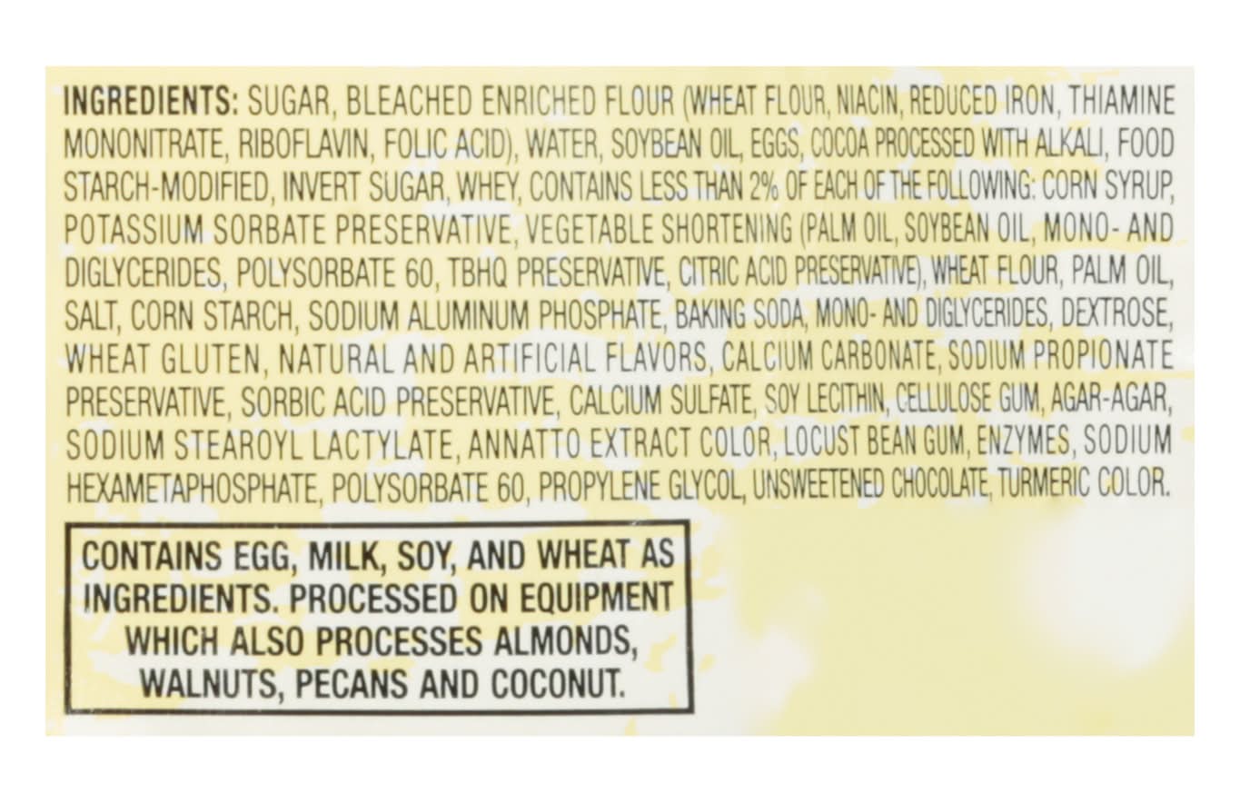 Ingredients: Sugar, Bleached Enriched Flour (Wheat Flour, Niacin, Reduced Iron, Thiamine Mononitrate, Riboflavin, Folic Acid), Water, Soybean Oil, Eggs, Cocoa Processed with Alkali, Food Starch-Modified, Invert Sugar, Whey Contains Less than 2% of Each of the Following: Corn Syrup, Potassium Sorbate Preservative, Vegetable Shortening (Palm Oil, Soybean Oil, Mono- and Diglycerides, Polysorbate 60, TBHQ Preservative, Citric Acid Preservative), Wheat Flour, Palm Oil, Salt, Corn Starch, Sodium Aluminum Phosphate, Baking Soda, Mono- and Diglycerides, Dextrose, Wheat Gluten, Natural and Artificial Flavors, Calcium Carbonate, Sodium Propionate Preservative, Sorbic Acid Preservative, Calcium Sulfate, Soy Lecithin, Cellulose Gum, Agar-Agar, Sodium Stearoyl Lactylate, Annatto Extract Color, Locust Bean Gum, Enzymes, Sodium Hexametaphosphate, Polysorbate 60, Propylene Glycol Unsweetened Chocolate, Turmeric Color Contains: Eggs, Milk, Soybeans, Wheat, Tree Nuts