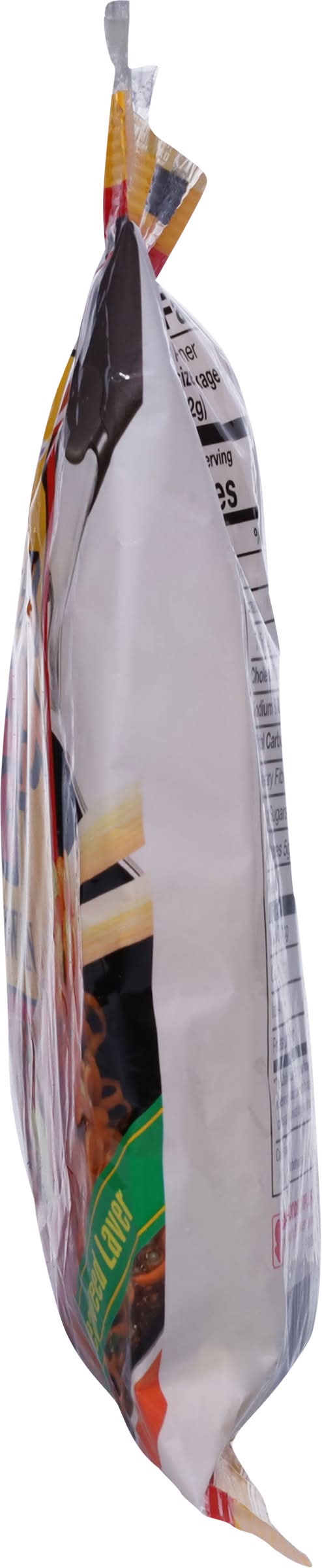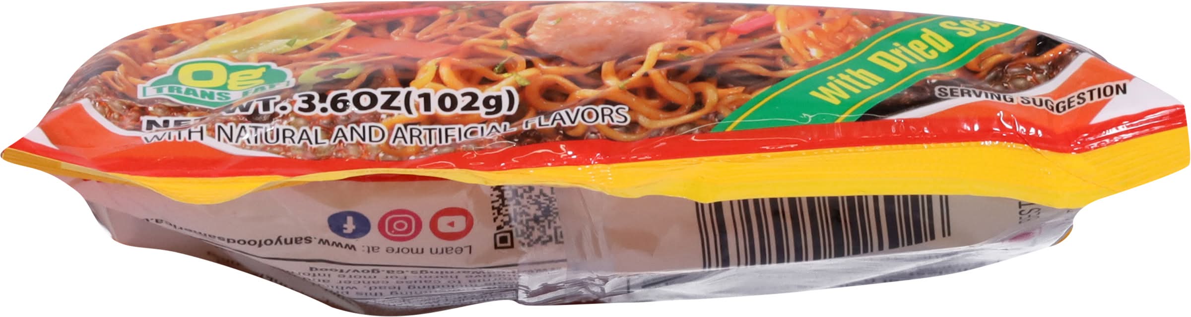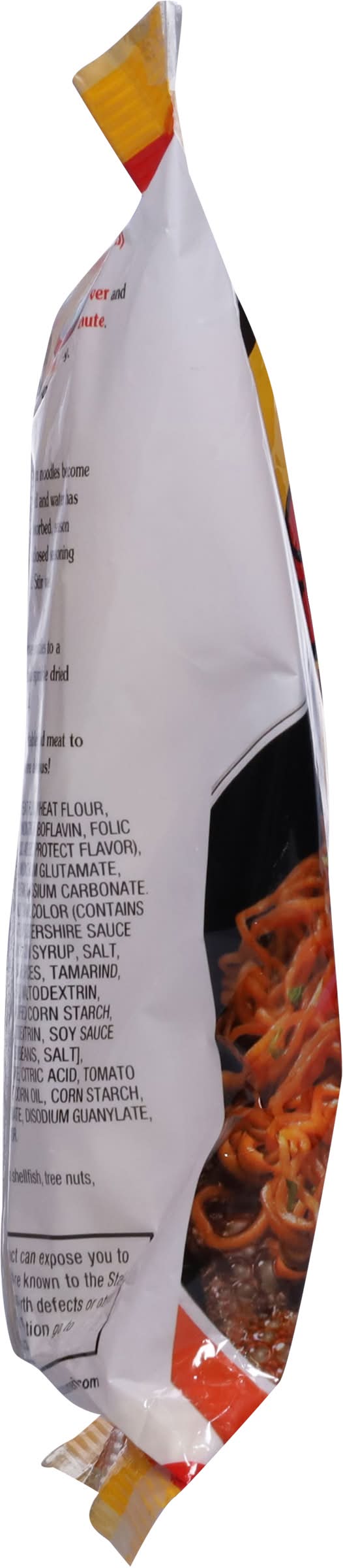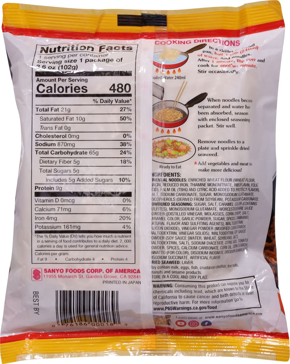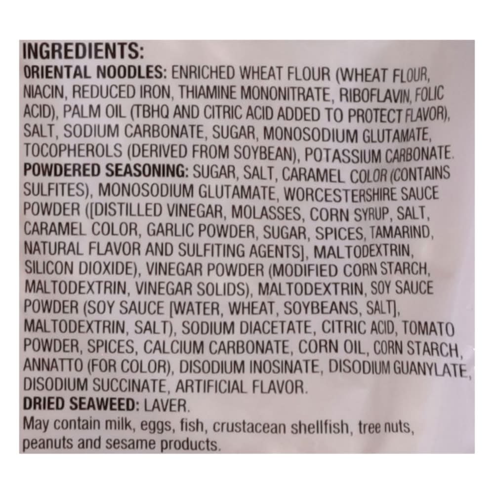 Ingredients: Oriental Noodles: Enriched Wheat Flour (Wheat Flour, Niacin, Reduced Iron, Thiamine Mononitrate, Riboflavin, Folic Acid), Palm Oil (TBHQ and Citric Acid Added to Protect Flavor), Salt, Sodium Carbonate, Sugar, Monosodium Glutamate, Tocopherols (Derived from Soybean), Potassium Carbonate. Powdered Seasoning: Sugar, Salt, Caramel Color (Contains Sulfites), Monosodium Glutamate, Worcestershire Sauce Powder ([Distilled Vinegar, Molasses, Corn Syrup, Salt, Caramel Color, Garlic Powder, Sugar, Spices, Tamarind, Natural Flavor and Sulfiting Agents), Maltodextrin, Silicon Dioxide), Vinegar Powder (Modified Corn Starch, Maltodextrin, Vinegar Solids), Maltodextrin, Soy Sauce Powder (Soy Sauce [Water, Wheat, Soybeans, Salt), Maltodextrin, Salt), Sodium Diacetate, Citric Acid, Tomato Powder, Spices, Calcium Carbonate, Corn Oil, Corn Starch, Annatto (for Color), Disodium Inosinate, Disodium Guanylate, Disodium Succinate, Artificial Flavor. Dried Seaweed: Laver Contains: Wheat, Soybeans, Sulfites, Corn, Milk, Eggs, Fish, Tree Nuts, Peanuts, Sesame, Crustacean Shellfish