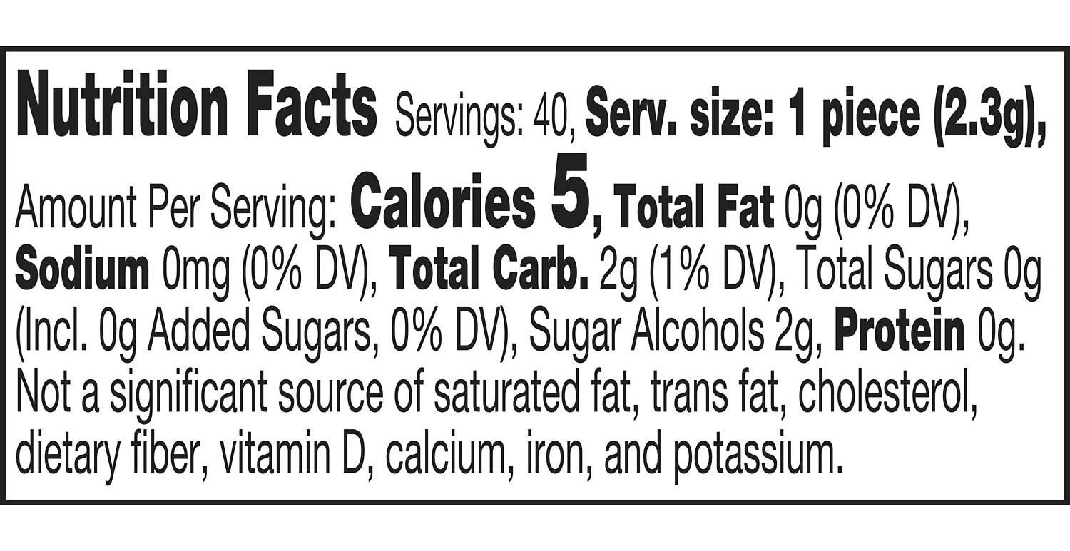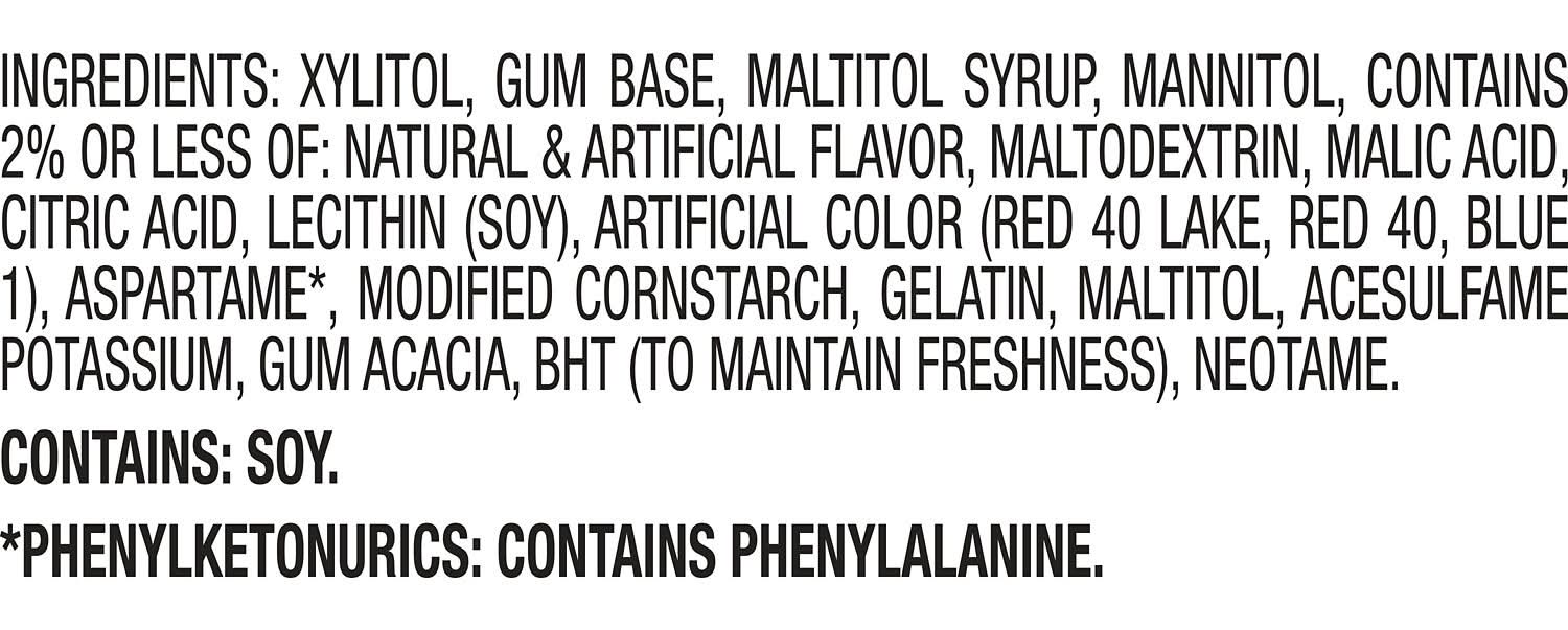 Ingredients: XYLITOL; GUM BASE; MALTITOL SYRUP; MANNITOL; CONTAINS 2% OR LESS OF: NATURAL ARTIFICIAL FLAVOR; MALTODEXTRIN; MALIC ACID; CITRIC ACID; LECITHIN (SOY); ARTIFICIAL COLOR (RED 40 LAKE; RED 40; BLUE 1); ASPARTAME*; MODIFIED CORNSTARCH; GELATIN; MALTITOL; ACESULFAMEPOTASSIUM; GUM ACACIA; BHT (TO MAINTAIN FRESHNESS); NEOTAME. Contains: Soyabeans