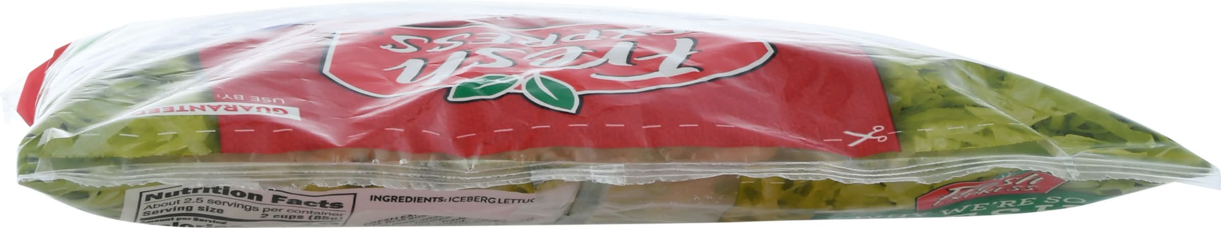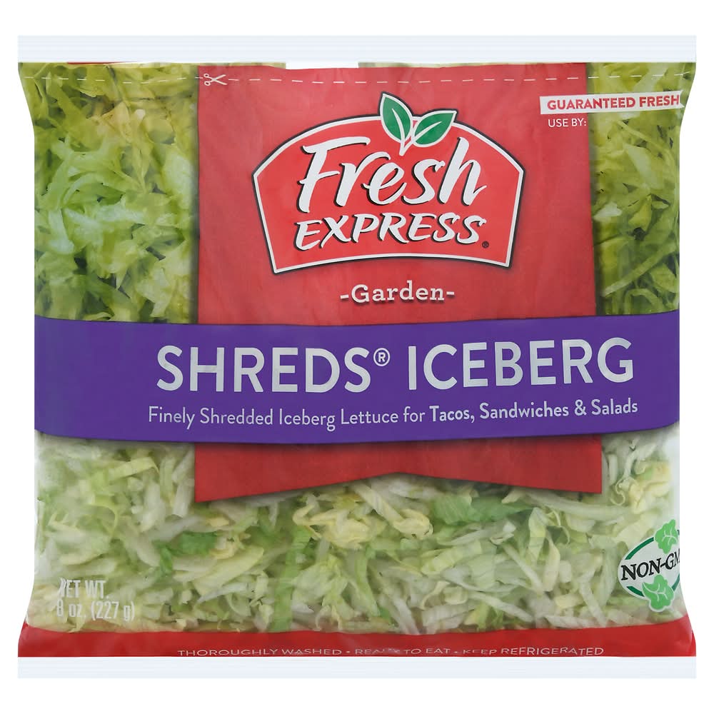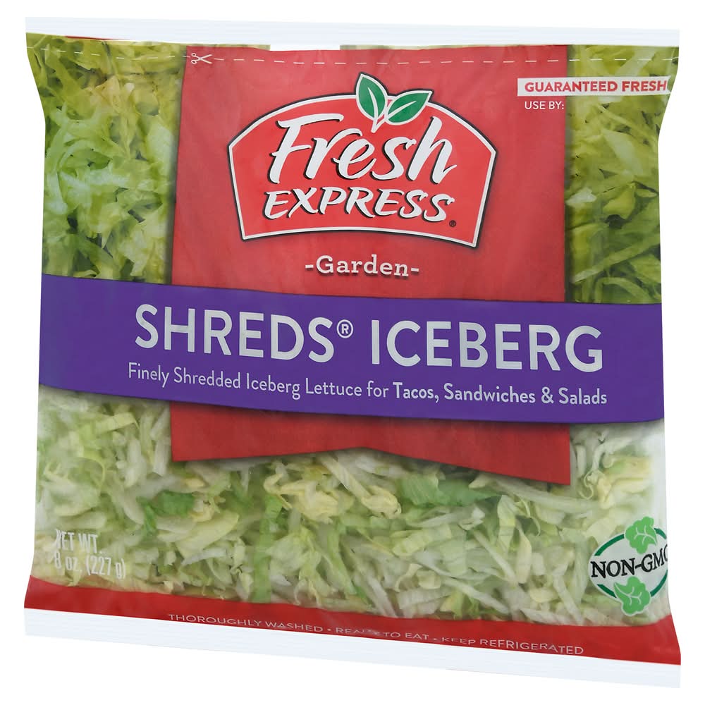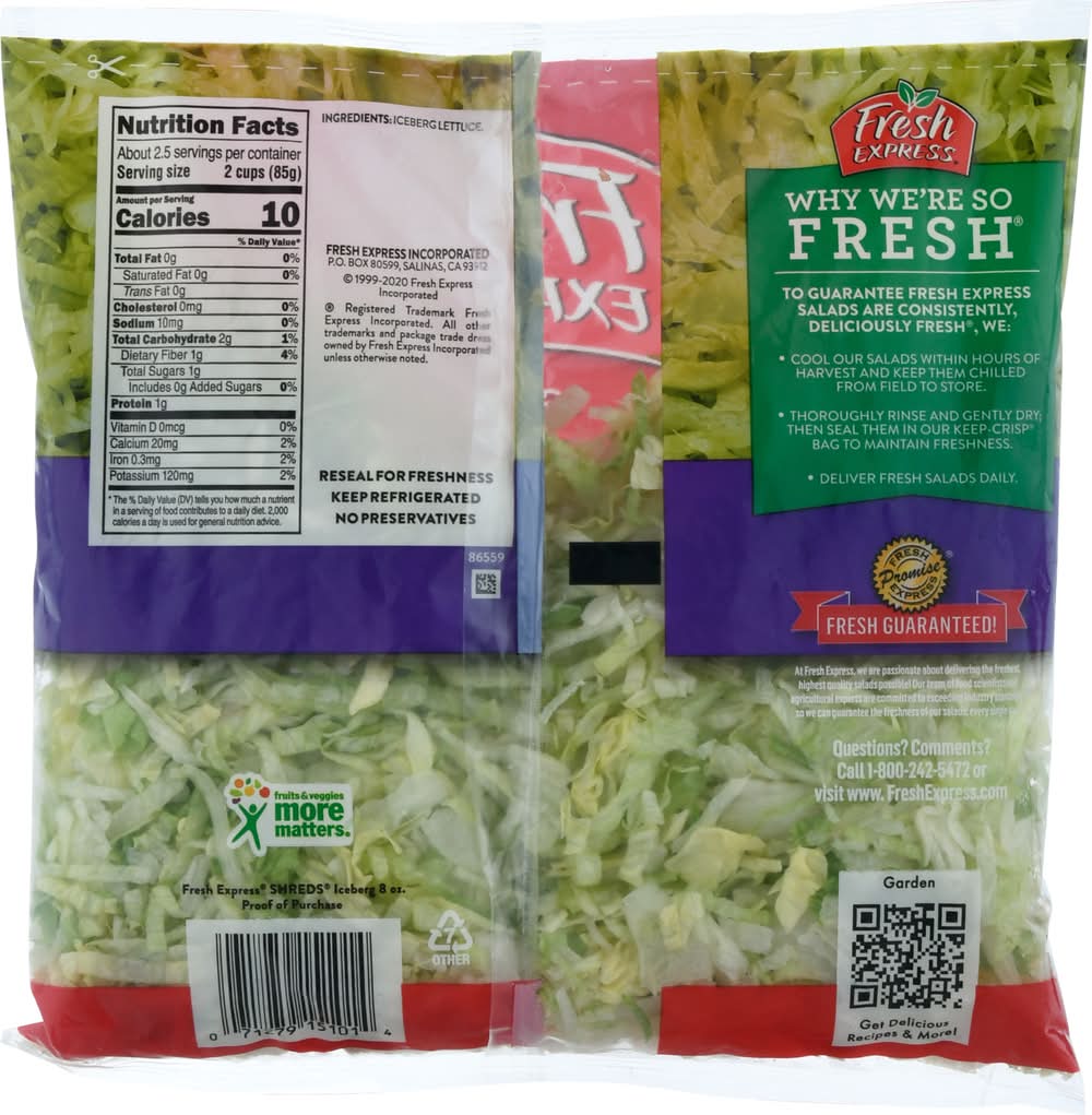 Finely shredded iceberg lettuce for tacos, sandwiches & salads. Fruits & Veggies More matters. Non-GMO. Thoroughly washed. Ready to eat. No preservatives. Why We're so Fresh: To guarantee Fresh Express Salads are consistently, deliciously fresh, we: Cool our salads within hours of harvest and keep them chilled from field to store. Thoroughly rinse and gently dry; then seal them in our keep-crisp bag to maintain freshness. Deliver fresh salad daily. Guaranteed fresh. Fresh Promise Express: Fresh guaranteed! At Fresh Express, we are passionate about delivering the freshest, highest quality salads possible! Our team of food scientists and agricultural experts are committed to exceeding industry standards so we can guarantee the freshness of our salads, every single day.