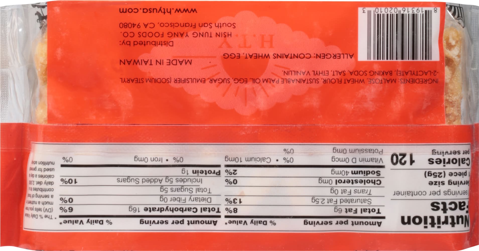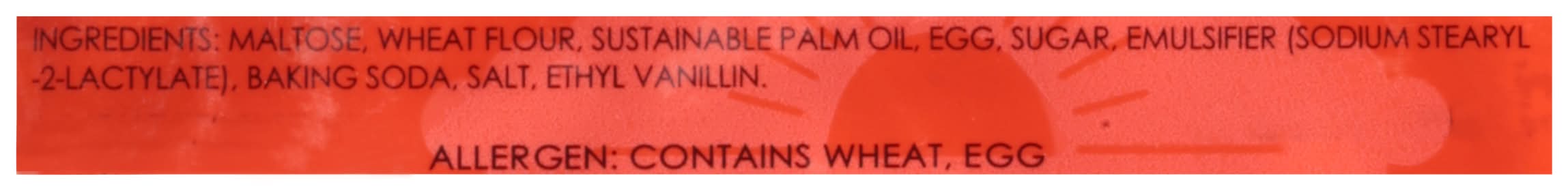 Ingredients: Maltose, Wheat Flour, Sustainable Palm Oil, Egg, Sugar, Emulsifier (Sodium Stearyl -2-Lactylate), Baking Soda, Salt, Ethyl Vanillin Contains: Wheat, Eggs