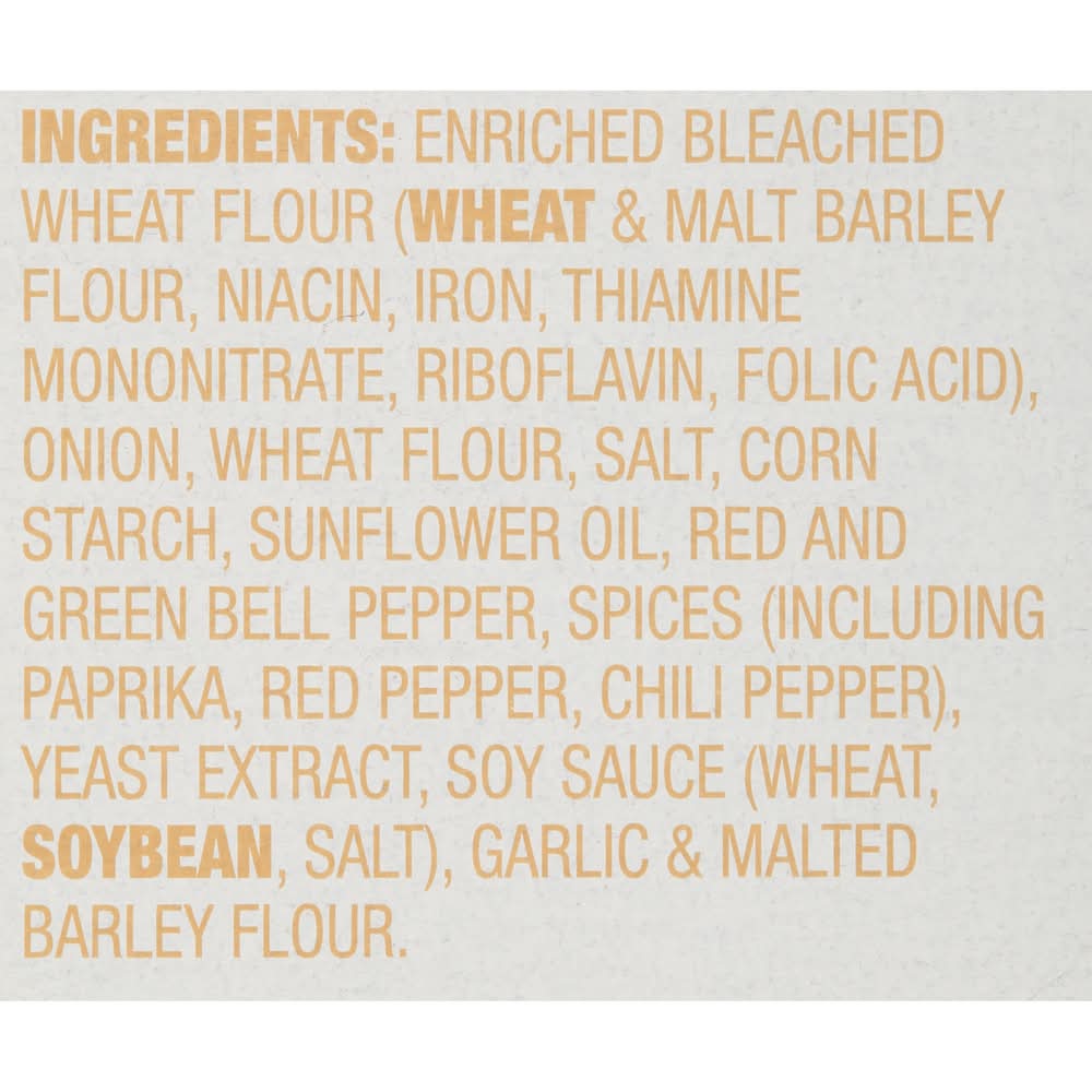 Ingredients: Enriched Bleached Wheat Flour (Wheat Malt Barley Flour, Niacin, Iron, Thiamine Mononitrate, Riboflavin, Folic Acid), Onion, Wheat Flour, Salt, Corn Starch, Sunflower Oil, Red and Green Bell Pepper, Spices (Including Paprika, Red Pepper, Chili Pepper), Yeast Extract, Soy Sauce (Wheat, Soybean, Salt), Garlic Malted Barley Flour. Contains: wheat, soy
