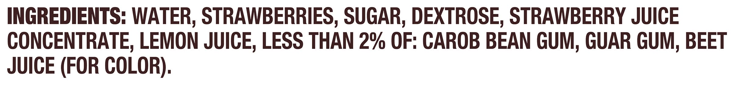 Ingredients: Water, Strawberries, Sugar, Dextrose, Strawberry Juice Concentrate, Lemon Juice, Less than 2% of: Carob Bean Gum, Guar Gum, Beet Juice (for Color)