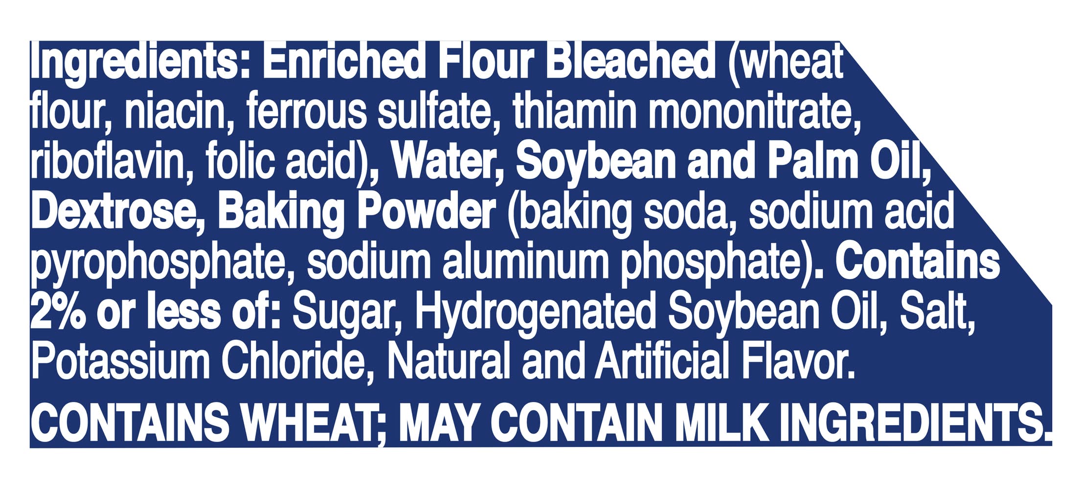 Ingredients: Enriched Flour Bleached (Wheat Flour, Niacin, Ferrous Sulfate, Thiamin Mononitrate, Riboflavin, Folic Acid), Water, Soybean and Palm Oil, Dextrose, Baking Powder (Baking Soda, Sodium Acid Pyrophosphate, Sodium Aluminum Phosphate), Contains 2% or Less of: Sugar, Hydrogenated Soybean Oil, Salt, Potassium Chloride, Natural and Artificial Flavor Contains: Wheat, Soybeans, Milk
