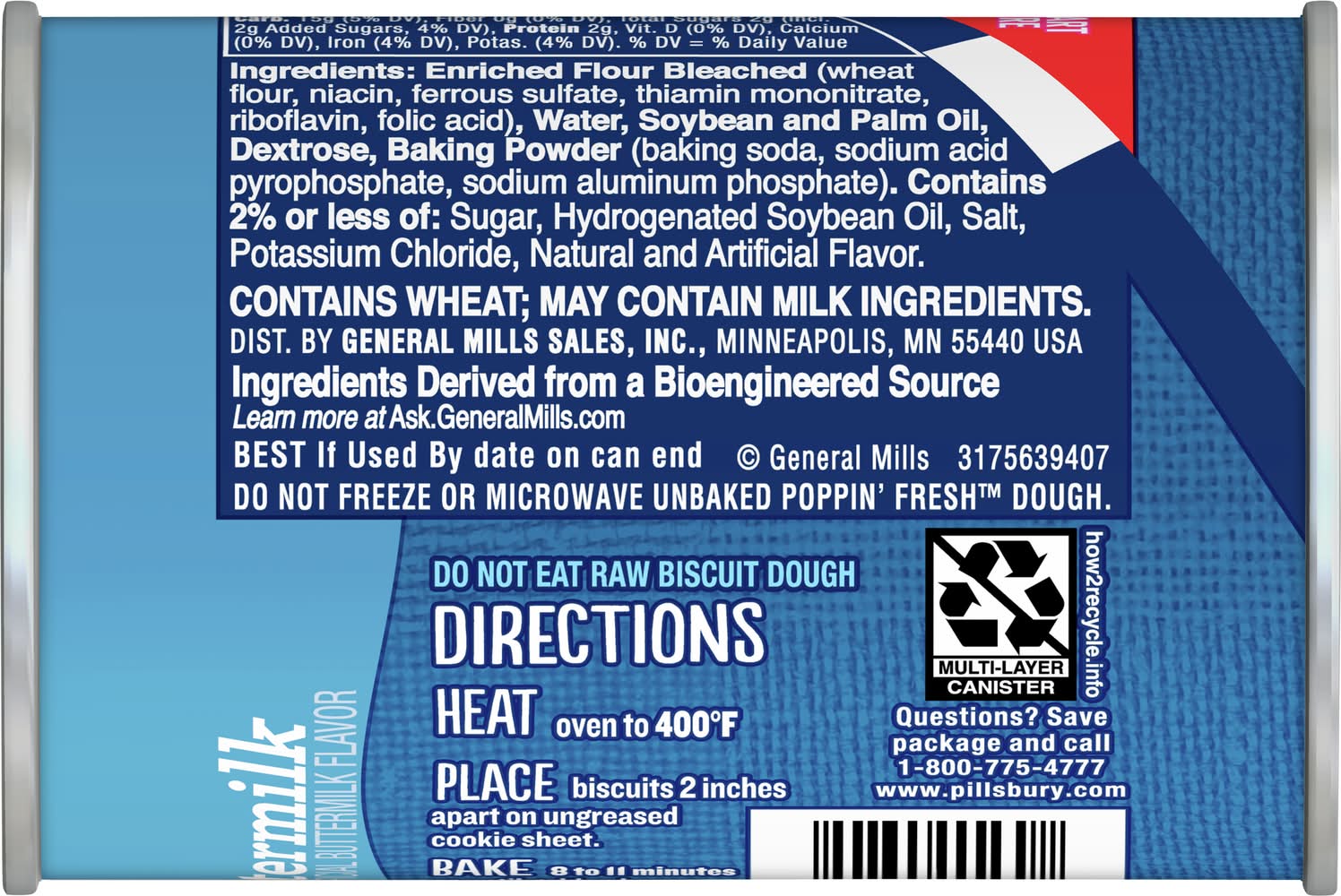 Directions for use: Start Here: Peel in direction of arrow fully around the can. Press spoon against seam. Pop. For safe opening, point can ends away from you and others. Directions: Heat oven to 400 degrees F. Place biscuits 2 inches apart on ungreased cookie sheet. Bake 8 to 11 minutes or until golden brown. Keep dough refrigerated. Do not freeze or microwave unbaked poppin' fresh dough. Best if used by date on can end. Storage recommendation: Keep dough refrigerated. Do not freeze or microwave unbaked poppin' fresh dough.