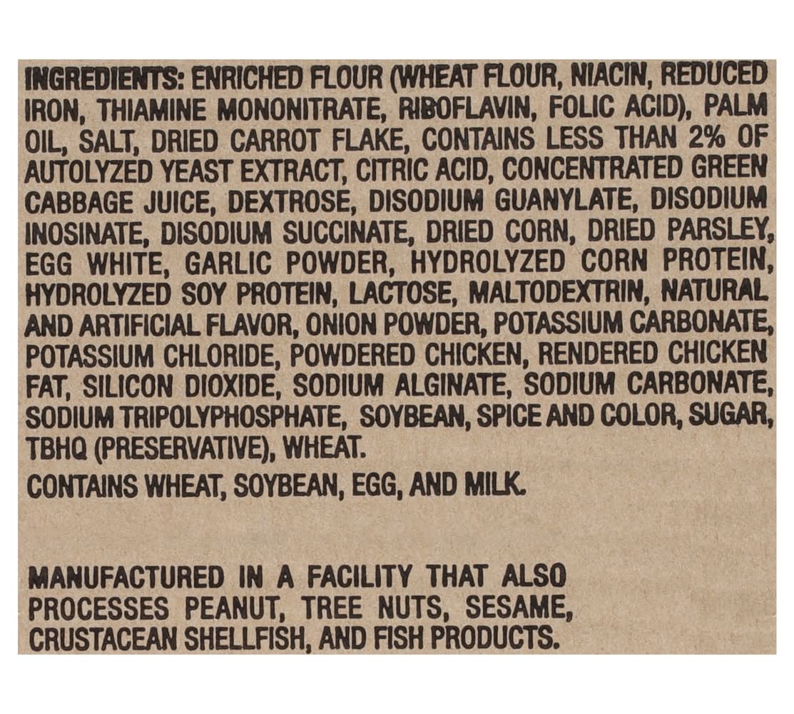 Ingredients: Enriched Flour (Wheat Flour Niacin Reduced Iron Thiamine Mononitrate Riboflavin Folic Acid), Palm Oil, Salt, Dried Carrot Flake, Contains Less than 2% of Autolyzed Yeast Extract, Citric Acid, Concentrated Green Cabbage Juice, Dextrose, Disodium Guanylate, Disodium Inosinate, Disodium Succinate, Dried Corn, Dried Parsley, Egg White, Garlic Powder, Hydrolyzed Corn Protein, Hydrolyzed Soy Protein, Lactose, Maltodextrin, Natural and Artificial Flavor, Onion Powder, Potassium Carbonate, Potassium Chloride, Powdered Chicken, Rendered Chicken Fat, Silicon Dioxide, Sodium Alginate, Sodium Carbonate, Sodium Tripolyphosphate, Soybean, Spice and Color, Sugar, TBHQ (Preservative), Wheat Contains: Wheat, Soybeans, Eggs, Milk, Corn, Lactose, Peanuts, Tree Nuts, Sesame, Crustacean Shellfish, Fish