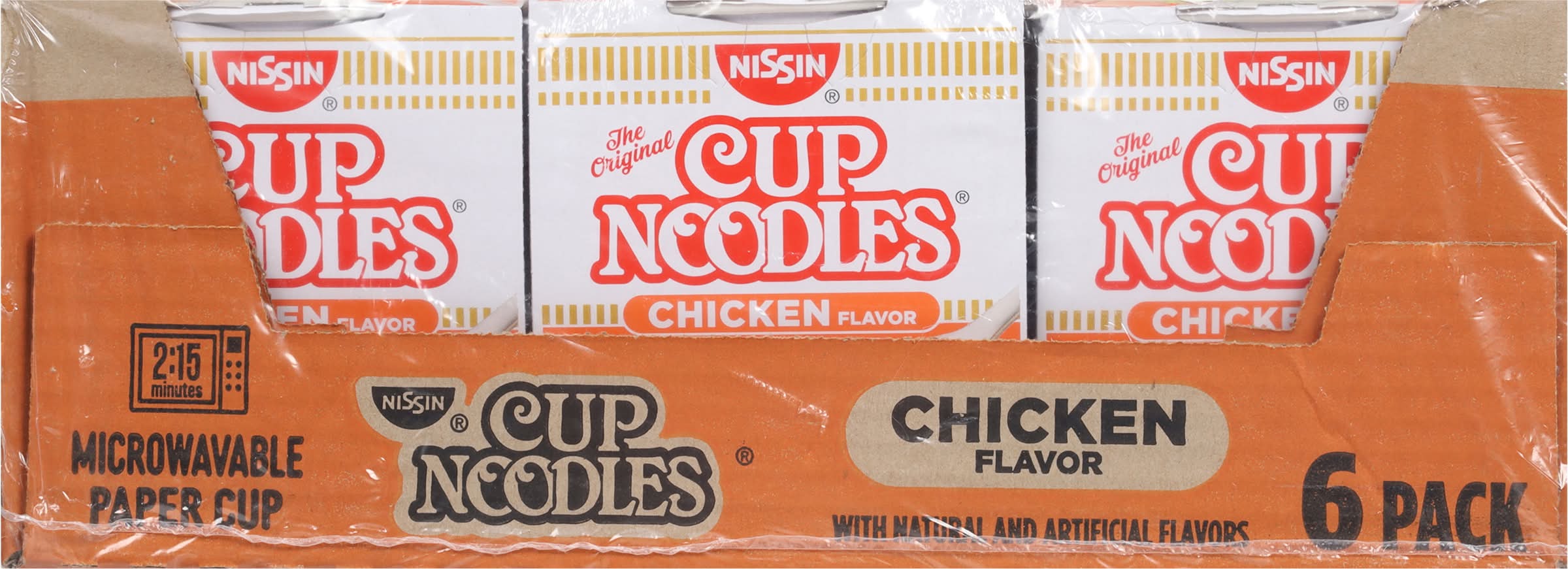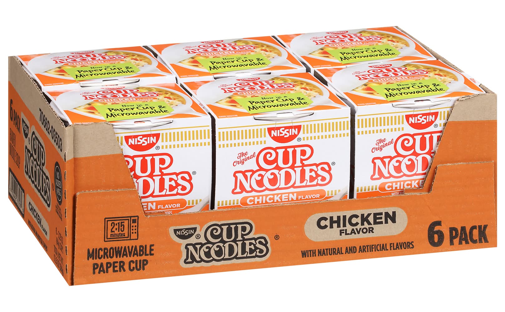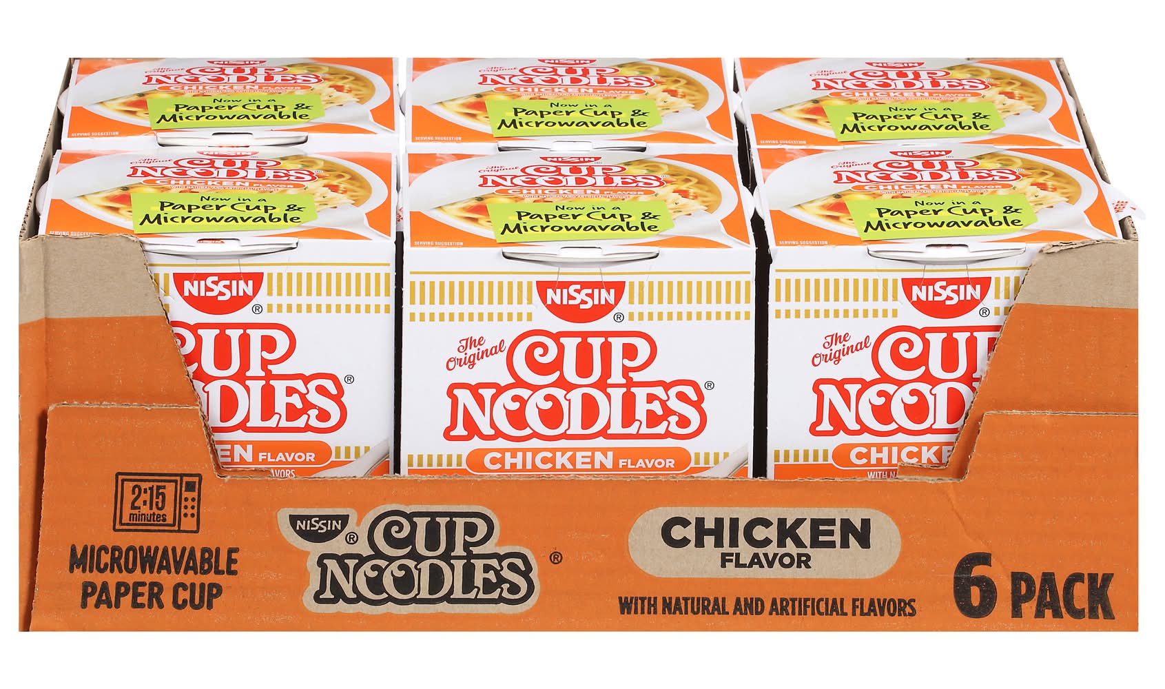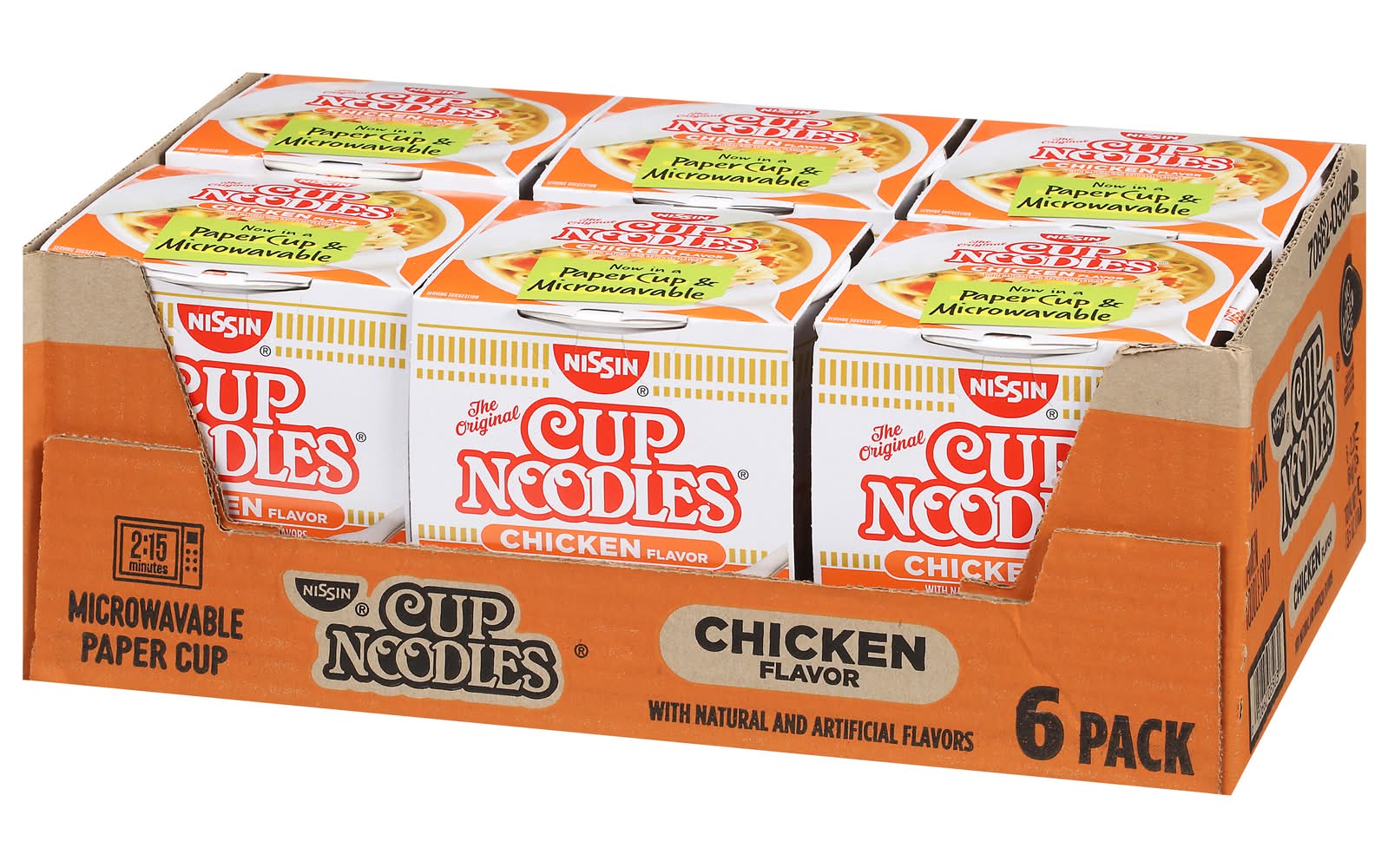 Natural and artificial flavors. Contains bioengineered food ingredients. The original. 2. 5 minutes microwavable. Paper cup. Now in a paper cup & microwavable. For the very best in ramen noodle soup. Individual cups are not intended to be sold separately. Paper cup made with 40% recycled fiber. • Flavor: Chicken • Pack size: 6 • Nissin Foods (Usa) Co., Inc., 2001 W. Rosecrans ave., Gardena, Ca, 90249.