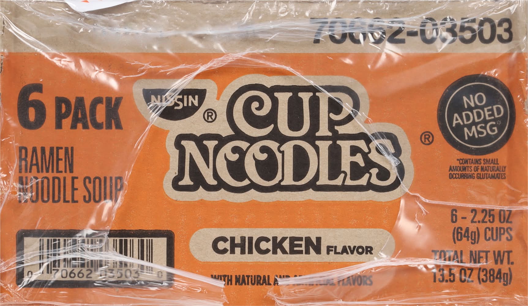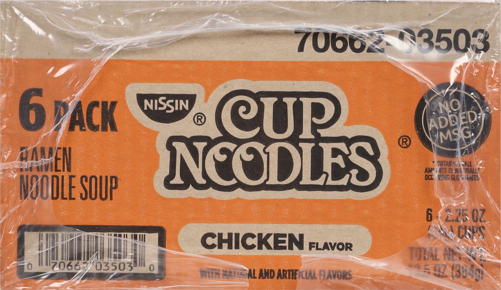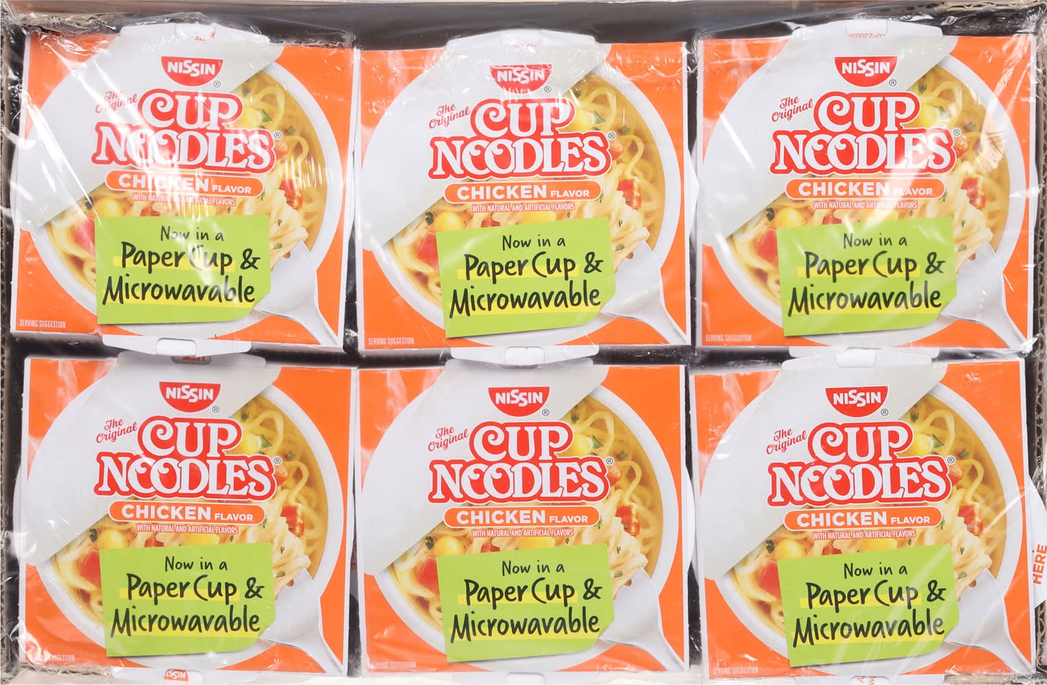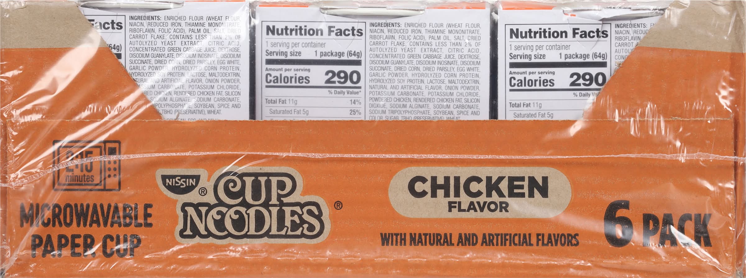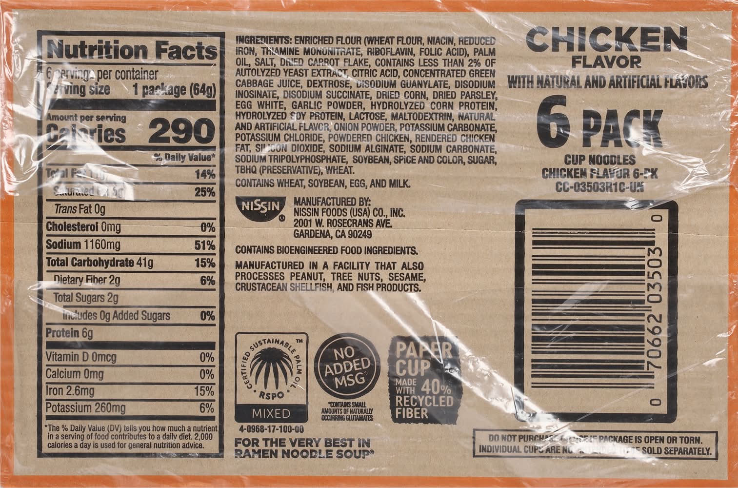 Natural and artificial flavors. Contains bioengineered food ingredients. The original. 2. 5 minutes microwavable. Paper cup. Now in a paper cup & microwavable. For the very best in ramen noodle soup. Individual cups are not intended to be sold separately. Paper cup made with 40% recycled fiber. • Flavor: Chicken • Pack size: 6 • Nissin Foods (Usa) Co., Inc., 2001 W. Rosecrans ave., Gardena, Ca, 90249.
