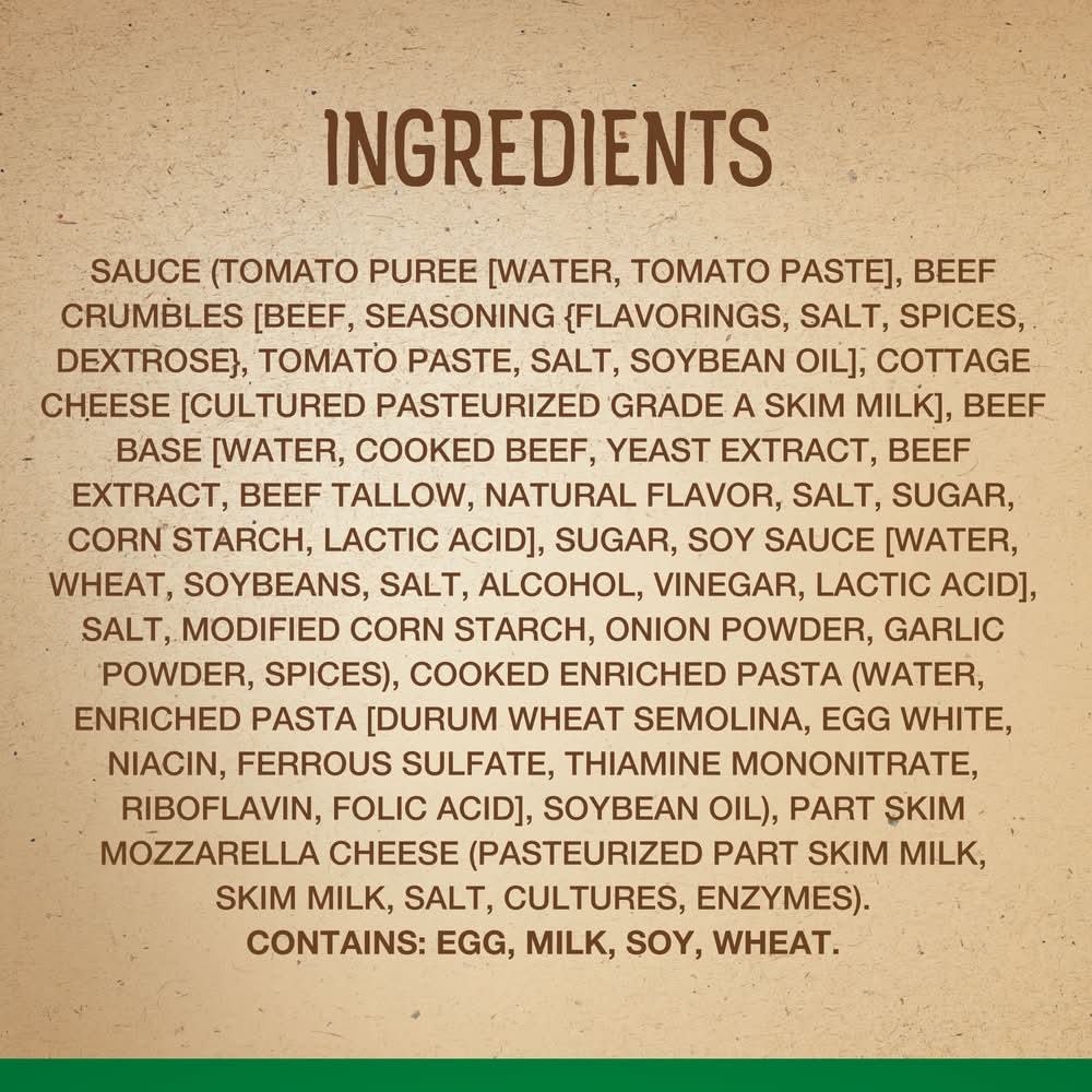 Ingredients: Sauce Tomato Puree [Water, Tomato Paste], Beef Crumbles [Beef, Seasoning {Flavorings, Salt, Spices, Dextrose}, Tomato Paste, Salt, Soybean Oil], Cottage Cheese [Cultured Pasteurized Grade A Skim Milk], Beef Base [Water, Cooked Beef, Yeast Extract, Beef Extract, Beef Tallow, Natural Flavor, Salt, Sugar, Corn Starch, Lactic Acid], Sugar, Soy Sauce [Water, Wheat, Soybeans, Salt, Alcohol, Vinegar, Lactic Acid], Salt, Modified Corn Starch, Onion Powder, Garlic Powder, Spices, Cooked Enriched Pasta Water, Enriched Pasta [Durum Wheat Semolina, Egg White, Niacin, Ferrous Sulfate, Thiamine Mononitrate, Riboflavin, Folic Acid], Soybean Oil, Part Skim Mozzarella Cheese Pasteurized Part Skim Milk, Skim Milk, Salt, Cultures, Enzymes. Contains: Egg, Milk, Soy, Wheat
