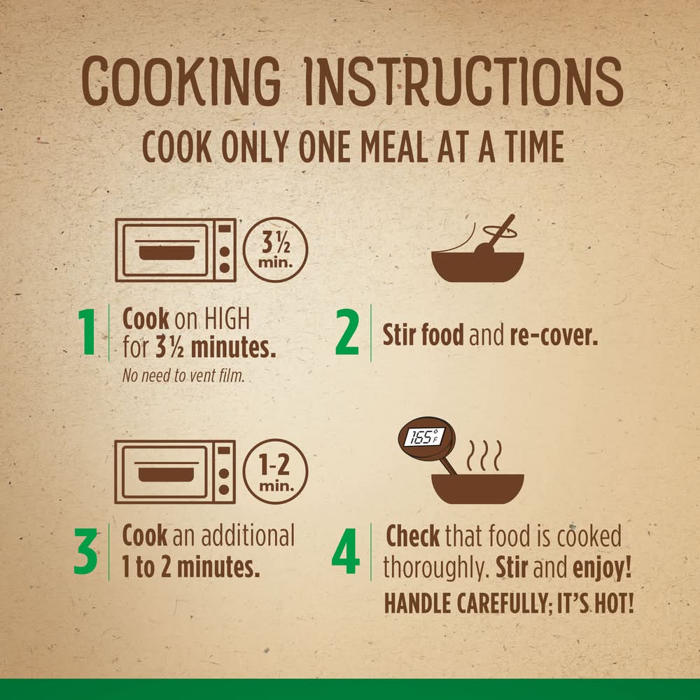 Directions for use: Microwave Oven. Cook only one at a time. 3 - 1/2 min. Cook on high 3 - 1/2 minutes. No need to vent film. Stir and re-cover. Cook an additional 1 to 2 minutes. Check that food is cooked thoroughly. Handle carefully, It's hot! Stir and enjoy! Food safety and quality . Keep frozen. Do not thaw. Microwave directions developed with 1100-watt microwave ovens. Appliances vary. Adjust cooking times as needed. Food must be cooked thoroughly to 165 degrees F. Must be cooked thoroughly Keep frozen. Storage recommendation: Keep frozen.