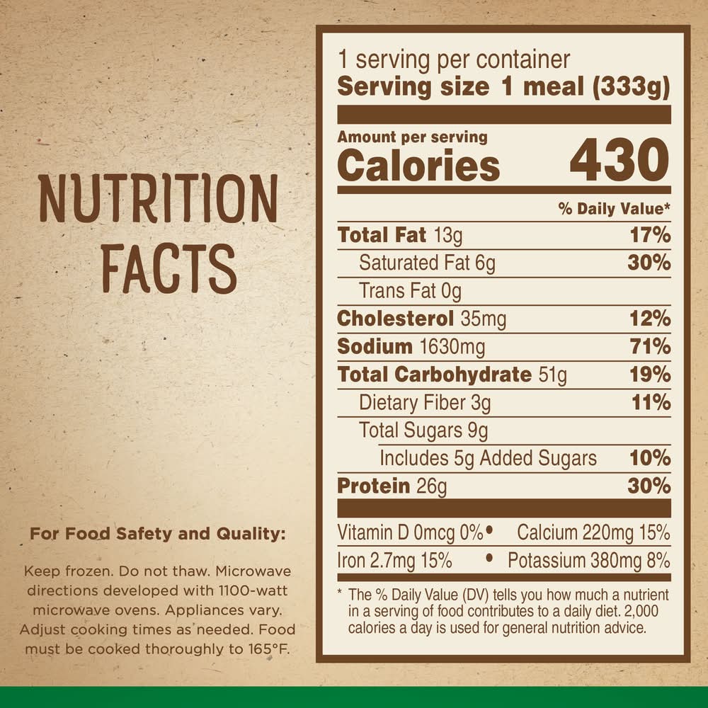Satisfy your craving for a classic Italian-style meal with Marie Callender's Traditional Lasagna With Meat & Sauce Bowl. Dig into tender lasagna noodles combined with an herb-seasoned, made-from-scratch tomato and beef sauce and hearty beef crumbles topped with real mozzarella cheese for a frozen lasagna bowl that offers a savory taste you're sure to love. This deliciously convenient frozen pasta dinner comes in a serving bowl made from plant-based fiber*, is free from preservatives, has no artificial flavors or colors and is an excellent source of protein with 25 grams per serving. Savor the combination of warm, hearty and delicious ingredients in Marie Callender's frozen meals and entrées for a homemade, comfort food taste. * Made with minimum 90% plant-based fiber • Number of servings: 1 • Conagra Brands, Chicago, IL, 60654, Ph: 800-595-7010
