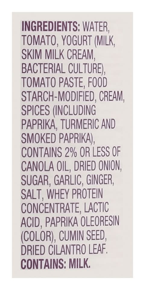 Ingredients: Water, Tomato, Yogurt (Milk, Skim Milk Cream, Bacterial Culture), Tomato Paste, Food Starch-Modified, Cream, Spices (Including Paprika, Turmeric and Smoked Paprika), Contains 2% or Less of Canola Oil, Dried Onion, Sugar, Garlic, Ginger, Salt, Whey Protein Concentrate, Lactic Acid, Paprika Oleoresin (Color), Cumin Seed, Dried Cilantro Leaf Contains: Milk, Peanuts, Tree Nuts, Tree Nuts, Coconuts