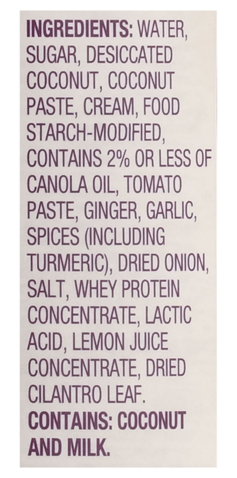 Ingredients: Water, Sugar, Desiccated Coconut, Coconut Paste, Cream, Food Starch-Modified, Contains 2% or Less of Canola Oil, Tomato Paste, Ginger, Garlic, Spices (Including Turmeric), Dried Onion, Salt, Whey Protein Concentrate, Lactic Acid, Lemon Juice Concentrate, Dried Cilantro Leaf Contains: Tree Nuts, Coconuts, Milk, Peanuts, Tree Nuts