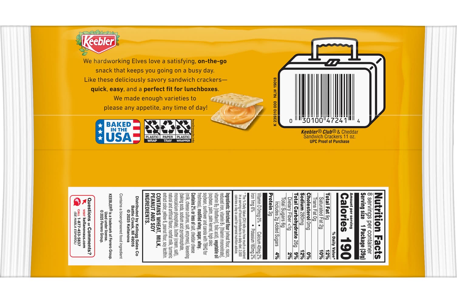 Take Keebler Club and Cheddar sandwich crackers with you on any snack time mission. These crunchy sandwich crackers are delicious, baked in the USA, and made with no high fructose corn syrup. Every sandwich cracker includes a smooth, cheesy filling that holds together two crisp and buttery Club crackers. These sandwich crackers are packaged into individual serving sizes, making them a convenient addition to any packed lunch or standalone treat; Keebler Club and Cheddar sandwich crackers are great for game time, party spreads, after school treats, taking a break during a busy day, late-night snacking, and more. The cheesy options are endless! Take these sandwich crackers along on field trips, trips to the park, picnics, or even while you're running your everyday errands. If your favorite snacker is far away, try packing these sandwich crackers into a care package. You'll love the one-of-a-kind flavor of Keebler Club and Cheddar sandwich crackers. • Flavor: Club & cheddar • Pack size: 8 • Kellogg Sales Co., Battle Creek,MI, 49016 • Packaging: Reusable
