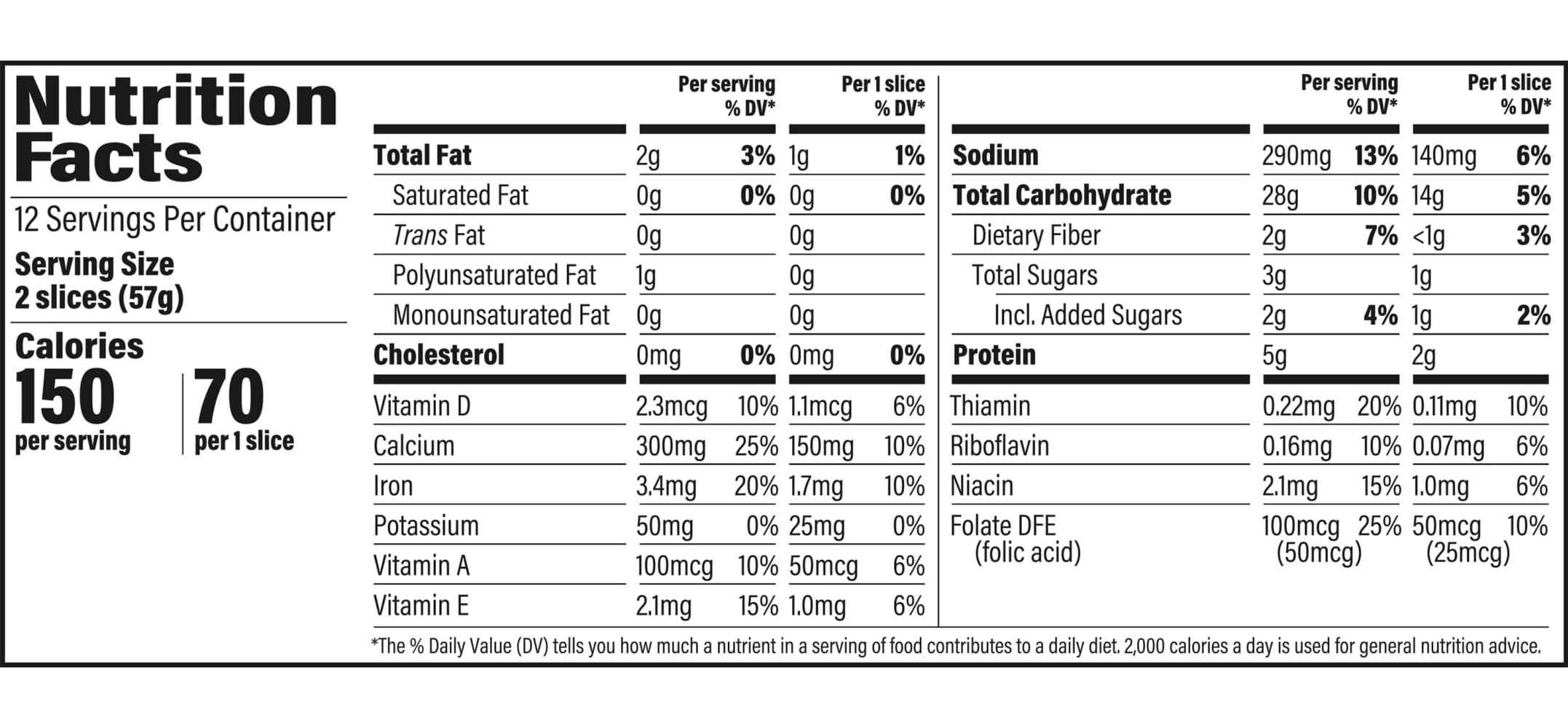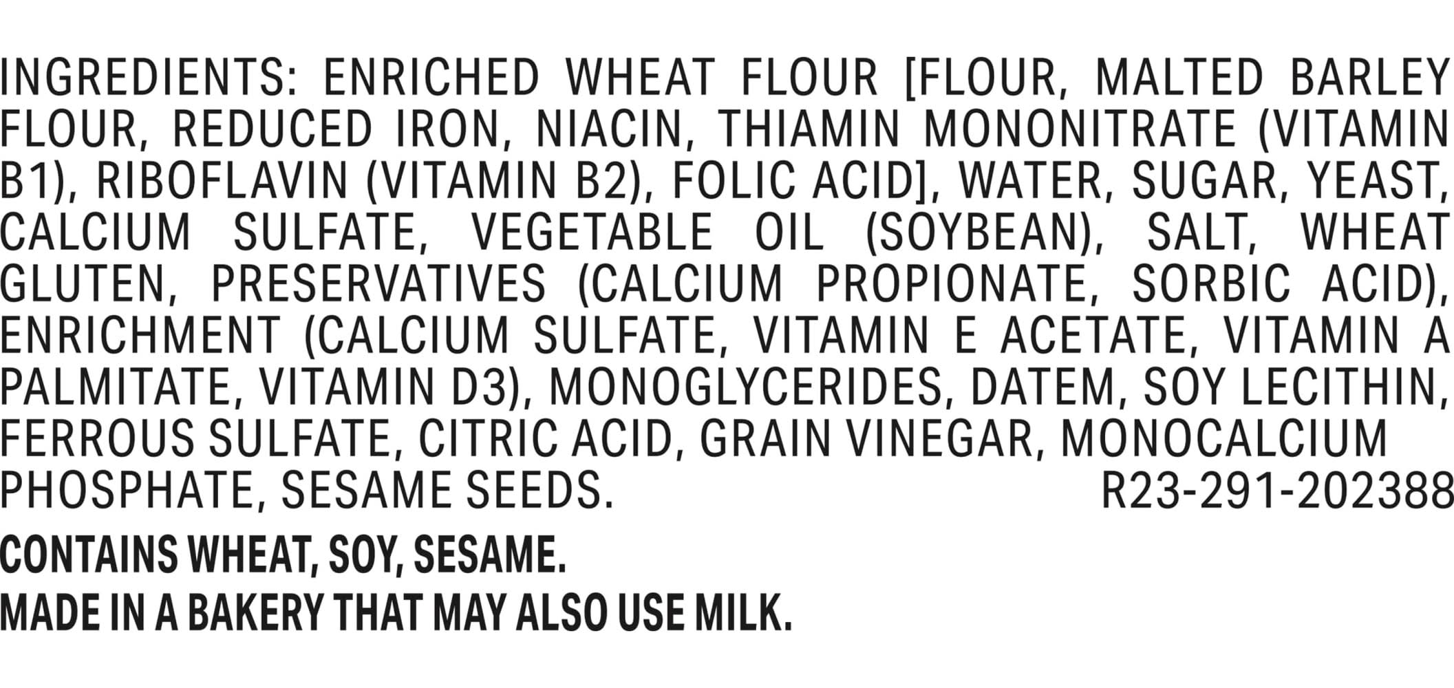 Ingredients: ENRICHED WHEAT FLOUR [FLOUR, MALTED BARLEY FLOUR, REDUCED IRON, NIACIN, THIAMIN MONONITRATE (VITAMIN B1), RIBOFLAVIN (VITAMIN B2), FOLIC ACID], WATER, SUGAR, YEAST, CONTAINS 2% OR LESS OF EACH OF THE FOLLOWING:, CALCIUM SULFATE, VEGETABLE OIL (SOYBEAN), SALT, WHEAT GLUTEN, PRESERVATIVES [CALCIUM PROPIONATE, SORBIC ACID], ENRICHMENT [CALCIUM SULFATE, VITAMIN E ACETATE, VITAMIN A PALMITATE, VITAMIN D3], MONOGLYCERIDES, DATEM, CITRIC ACID, SOY LECITHIN, FERROUS SULFATE, . Contains: CONTAINS SOY, WHEAT.