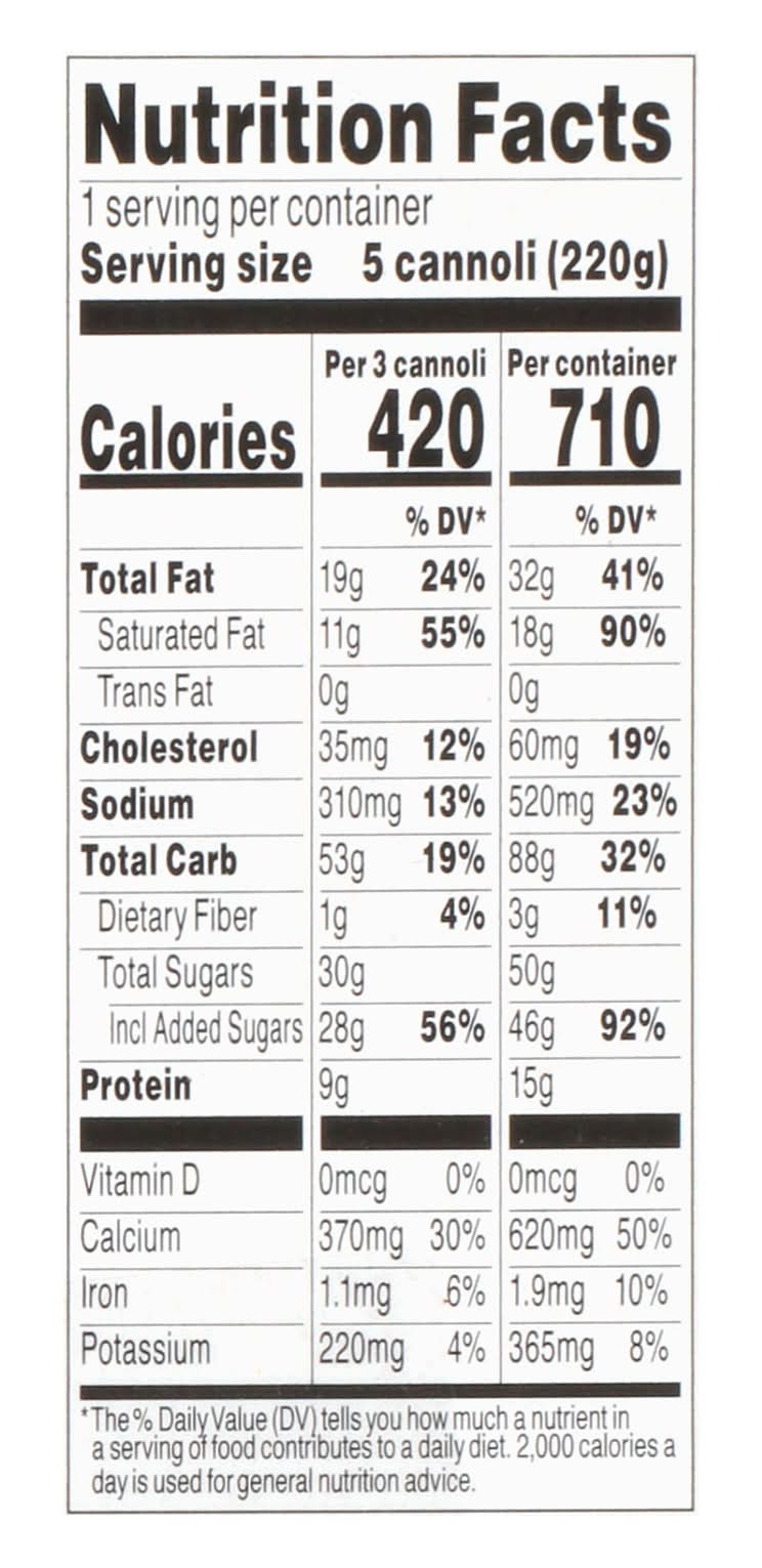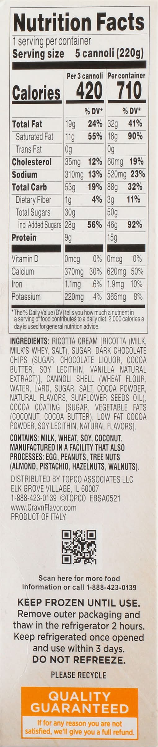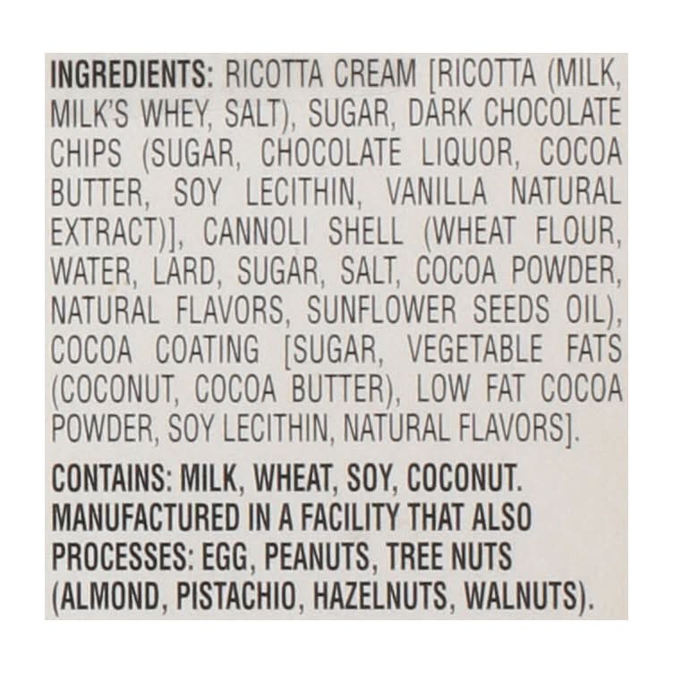 Ingredients: Ricotta Cream [Ricotta (Milk, Milk’s Whey, Salt), Sugar, Dark Chocolate Chips (Sugar, Chocolate Liquor, Cocoa Butter, Soy Lecithin, Vanilla Natural Extract)], Cannoli Shell (Wheat Flour, Water, Lard, Sugar, Salt, Cocoa, Powder, Natural Flavors, Sunflower Seeds Oil), Cocoa Coating [Sugar, Vegetable Fats (Coconut, Cocoa Butter), Low Fat Cocoa Powder, Soy Lecithin, Natural Flavors] Contains: Milk, Wheat, Soybeans, Tree Nuts, Eggs, Peanuts, Tree Nuts
