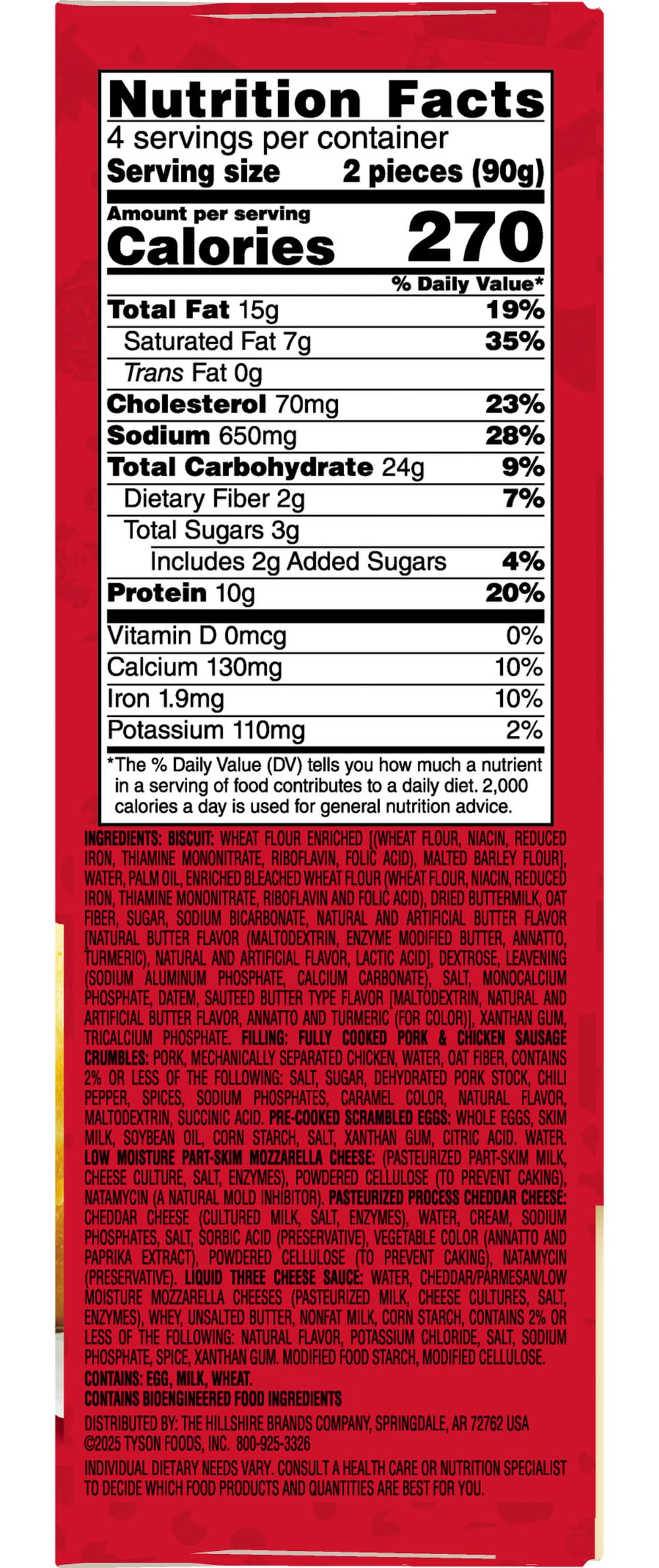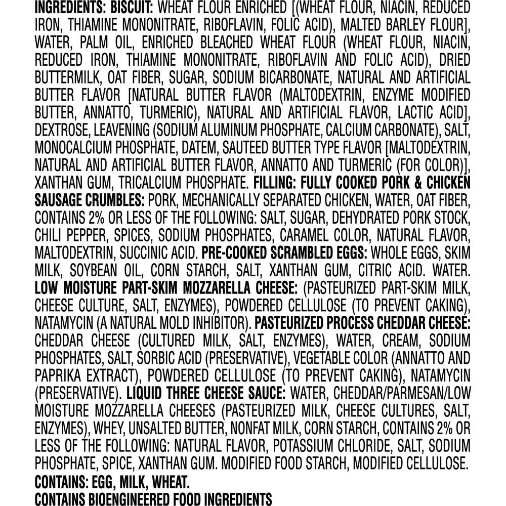 Ingredients: BISCUIT: Wheat Flour Enriched [(Wheat Flour, Niacin, Reduced Iron, Thiamine Mononitrate, Riboflavin, Folic Acid), Malted Barley Flour], Water, Palm Oil, Enriched Bleached Wheat Flour (Wheat Flour, Niacin, Reduced Iron, Thiamine Mononitrate, Riboflavin And Folic Acid), Dried Buttermilk, Oat Fiber, Sugar, Sodium Bicarbonate, Natural And Artificial Butter Flavor [Natural Butter Flavor (Maltodextrin, Enzyme Modified Butter, Annatto, Turmeric), Natural And Artificial Flavor, Lactic Acid], Dextrose, Leavening (Sodium Aluminum Phosphate, Calcium Carbonate), Salt, Monocalcium Phosphate, DATEM, Sauteed Butter Type Flavor [Maltodextrin, Natural And Artificial Butter Flavor, Annatto And Turmeric (For Color)], Xanthan Gum, Tricalcium Phosphate. FILLING: Fully Cooked Pork And Chicken Sausage Crumbles: Pork, Mechanically Separated Chicken, Water, Oat Fiber, Contains 2% Or Less Of The Following: Salt, Sugar, Dehydrated Pork Stock, Chili Pepper, Spices, Sodium Phosphates, Caramel Color, Natural Flavor, Maltodextrin, Succinic Acid. Pre-Cooked Scrambled Eggs: Whole Eggs, Skim Milk, Soybean Oil, Corn Starch, Salt, Xanthan Gum, Citric Acid. Water. Low Moisture Part-Skim Mozzarella Cheese: (Pasteurized Part-Skim Milk, Cheese Culture, Salt, Enzymes), Powdered Cellulose (To Prevent Caking), Natamycin (A Natural Mold Inhibitor). Pasteurized Process Cheddar Cheese: Cheddar Cheese (Cultured Milk, Salt, Enzymes), Water, Cream, Sodium Phosphates, Salt, Sorbic Acid (Preservative), Vegetable Color (Annatto And Paprika Extract), Powdered Cellulose (To Prevent Caking), Natamycin (Preservative). Liquid Three Cheese Sauce: Water, Cheddar/Parmesan/Low Moisture Mozzarella Cheeses (Pasteurized Milk, Cheese Cultures, Salt, Enzymes), Whey, Unsalted Butter, Nonfat Milk, Corn Starch, Contains 2% Or Less Of The Following: Natural Flavor, Potassium Chloride, Salt, Sodium Phosphate, Spice, Xanthan Gum. Modified Food Starch, Modified Cellulose. Contains: Eggs, Milk, Wheat