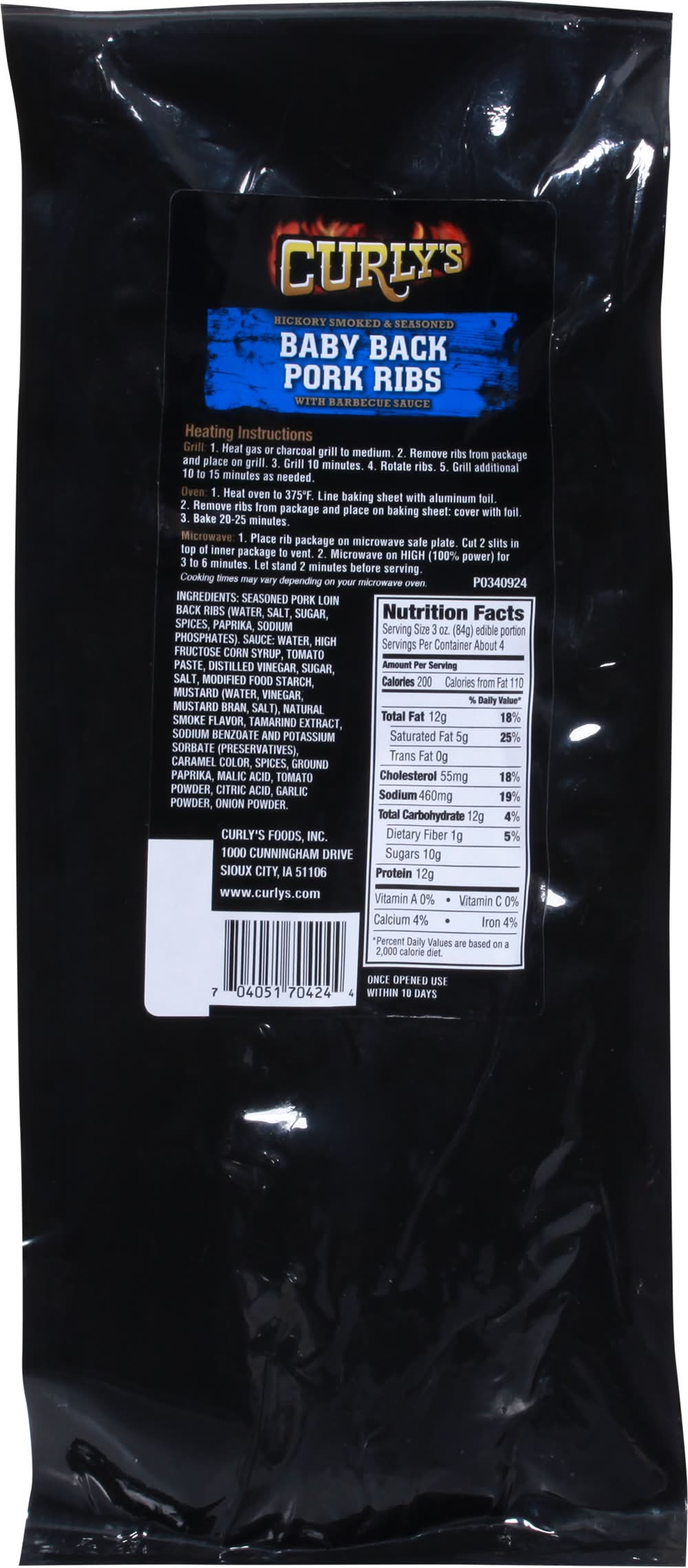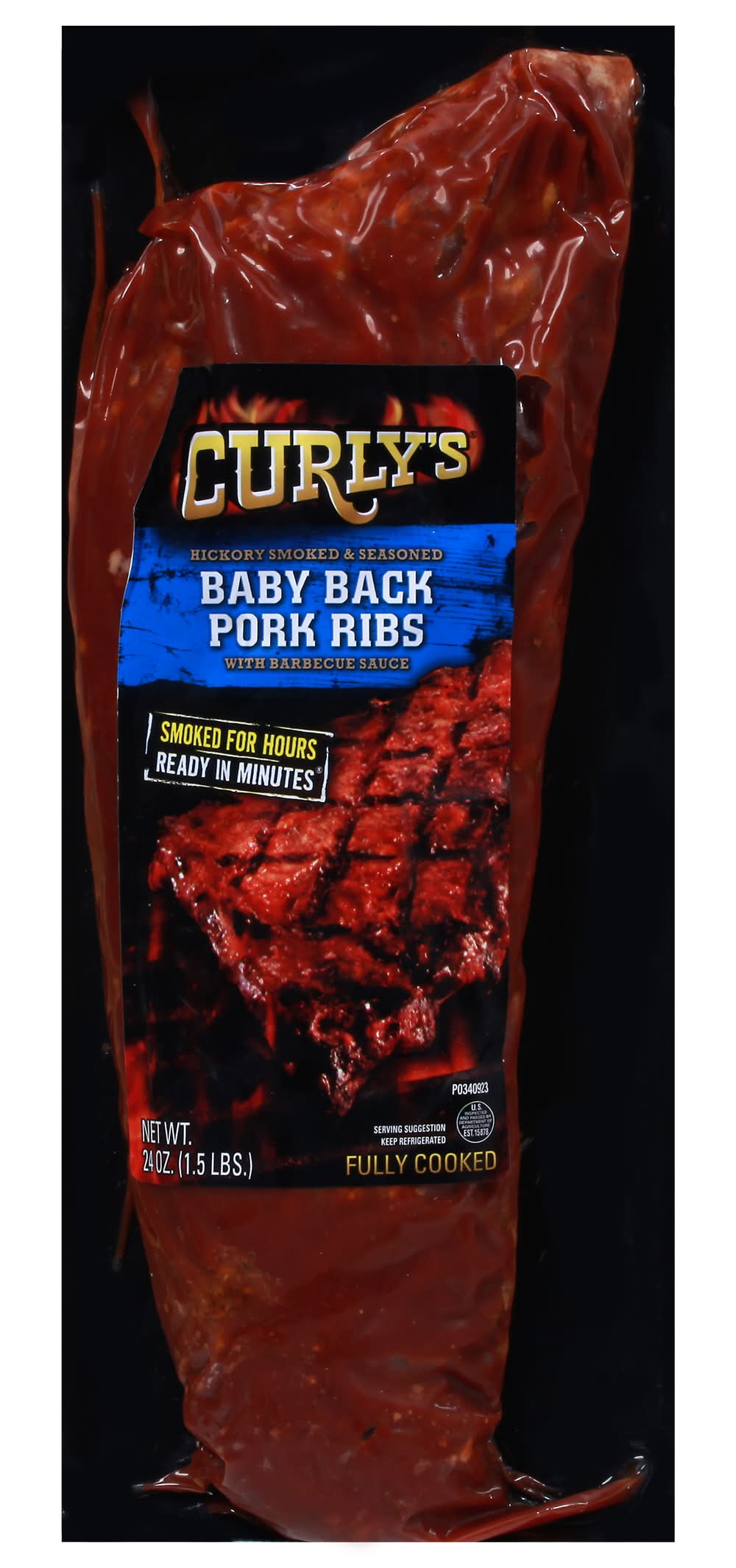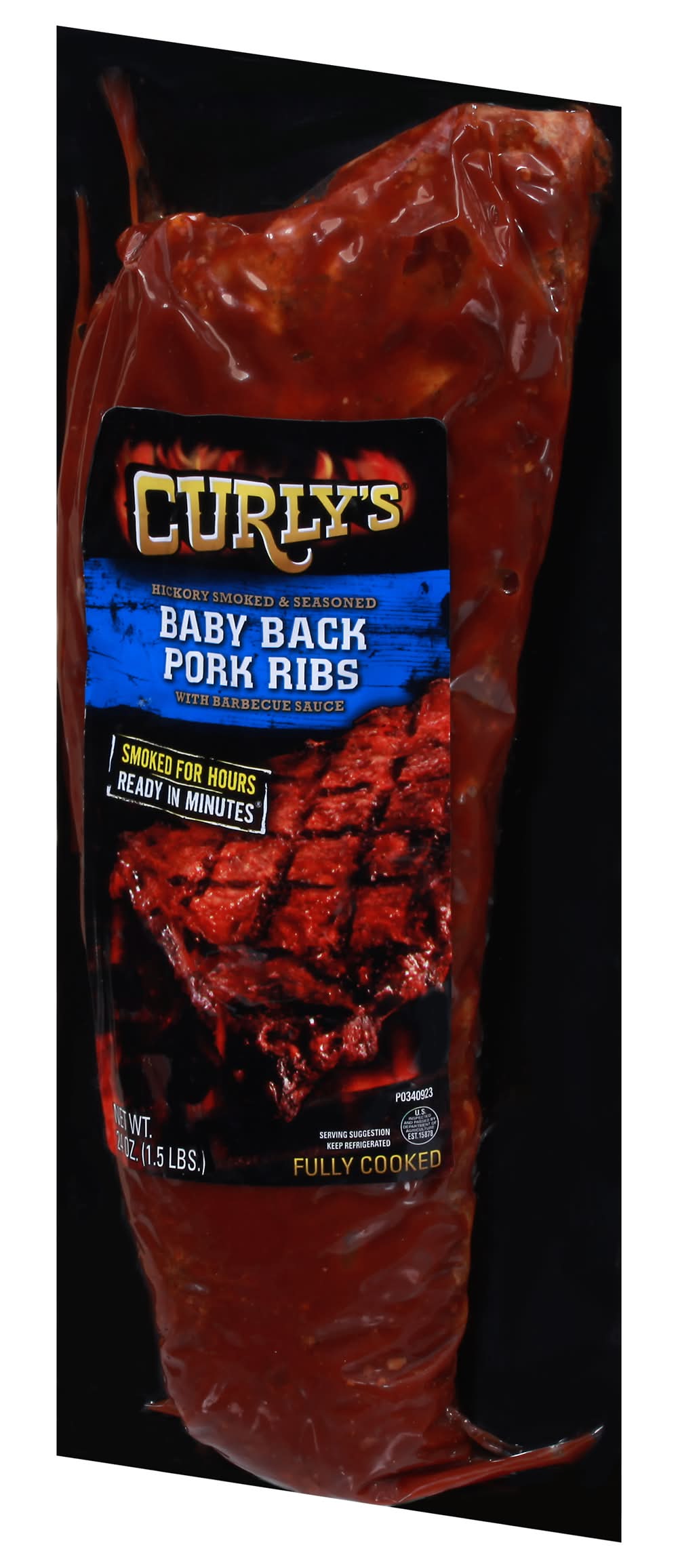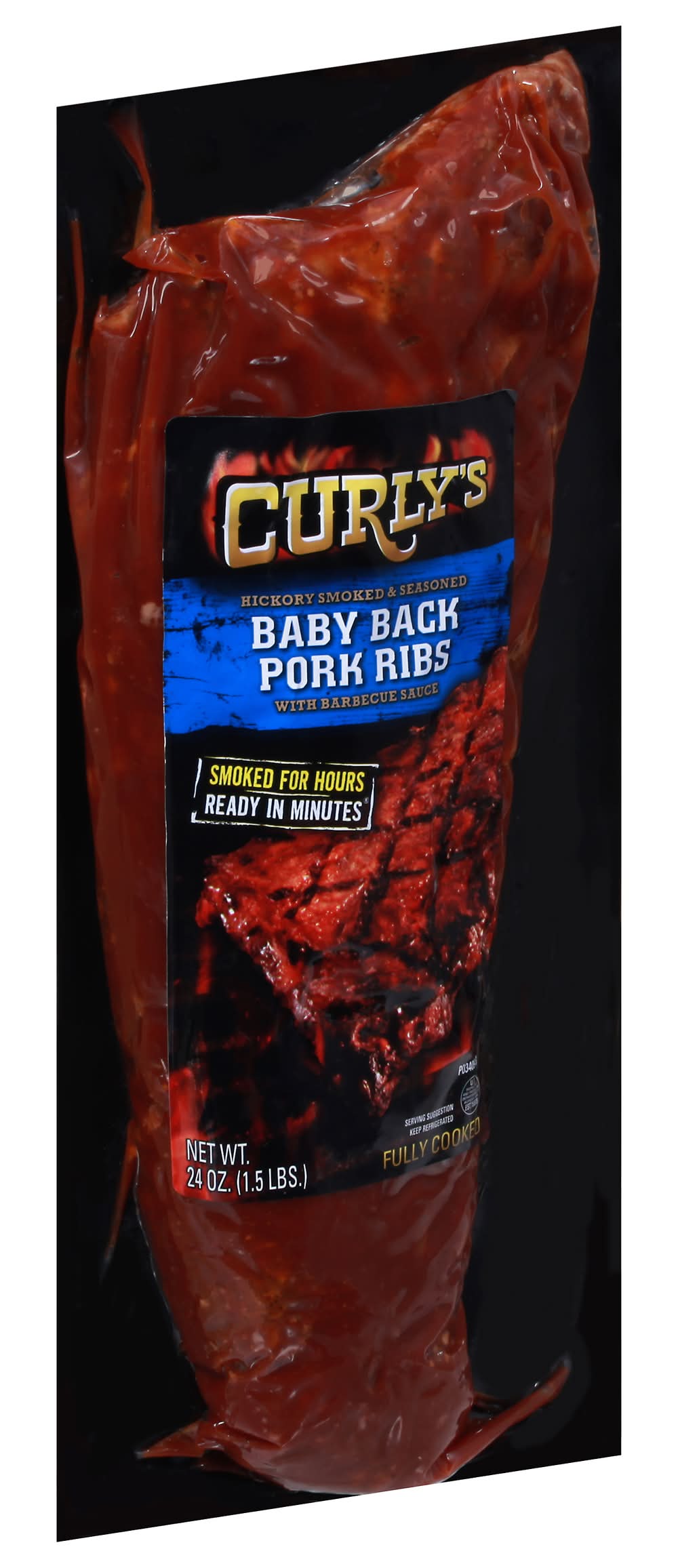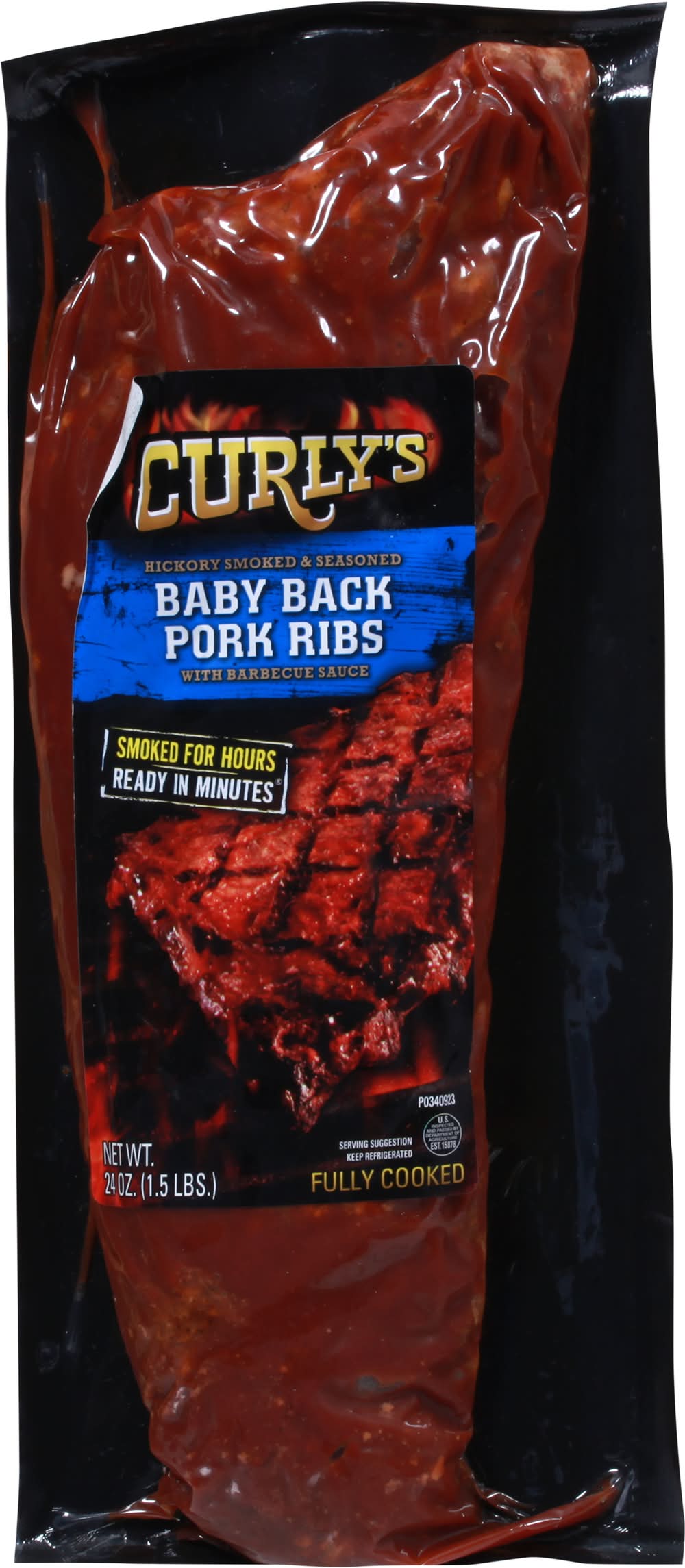 Hickory smoked & seasoned. With barbecue sauce. Smoked for hours. Ready in minutes. Fully cooked. US inspected and passed by Department of Agriculture. Curlys foods, 1000 Cunningham Drive Sioux City IA, 51106